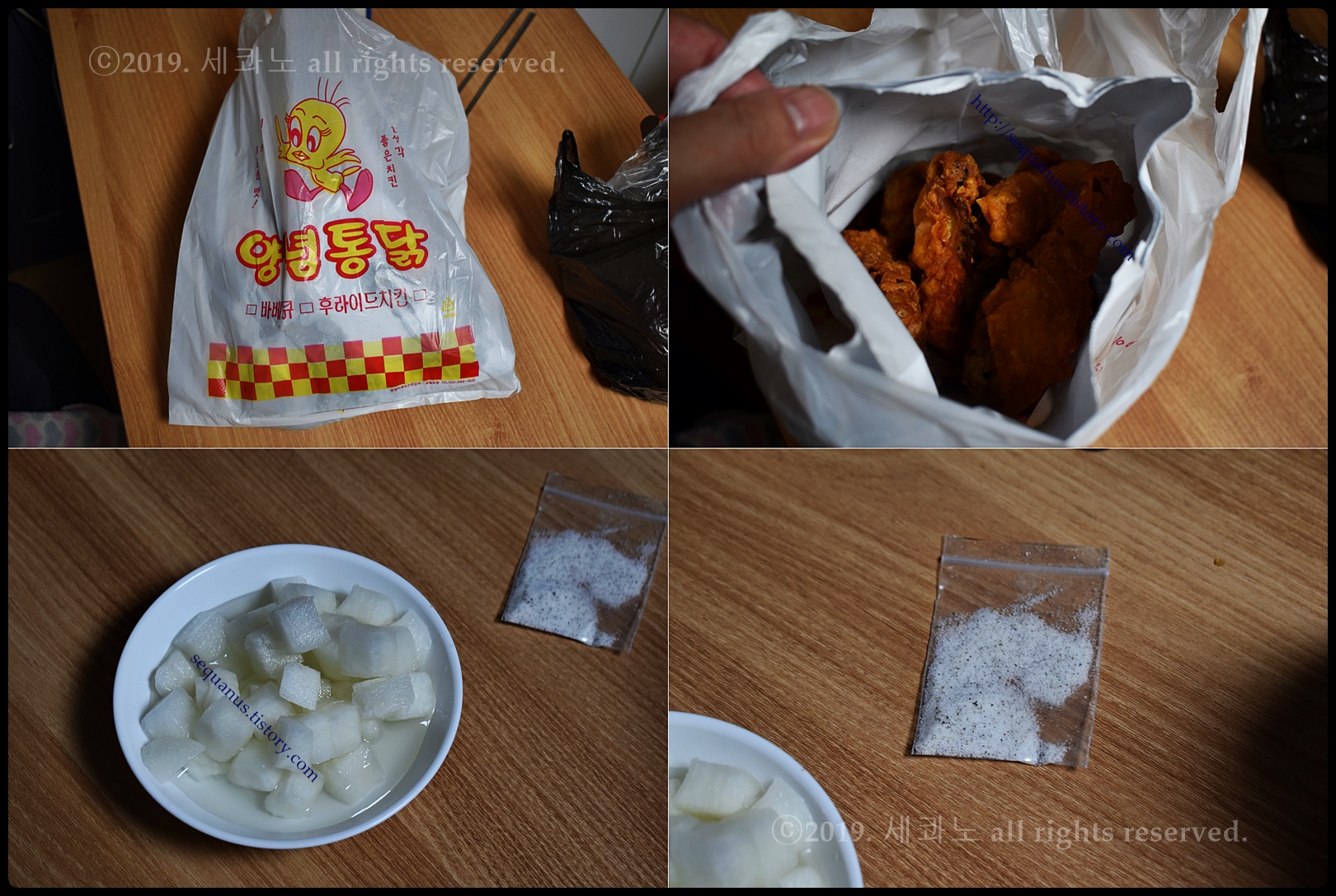 이렇게 옛날 통닭, 프라이드치킨 한 마리 포장해 왔다.