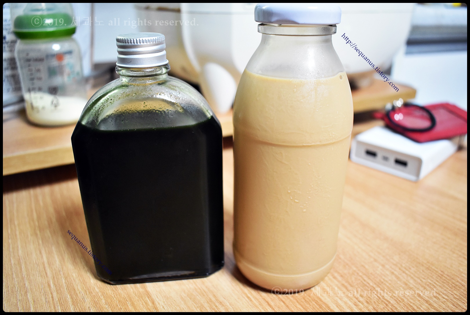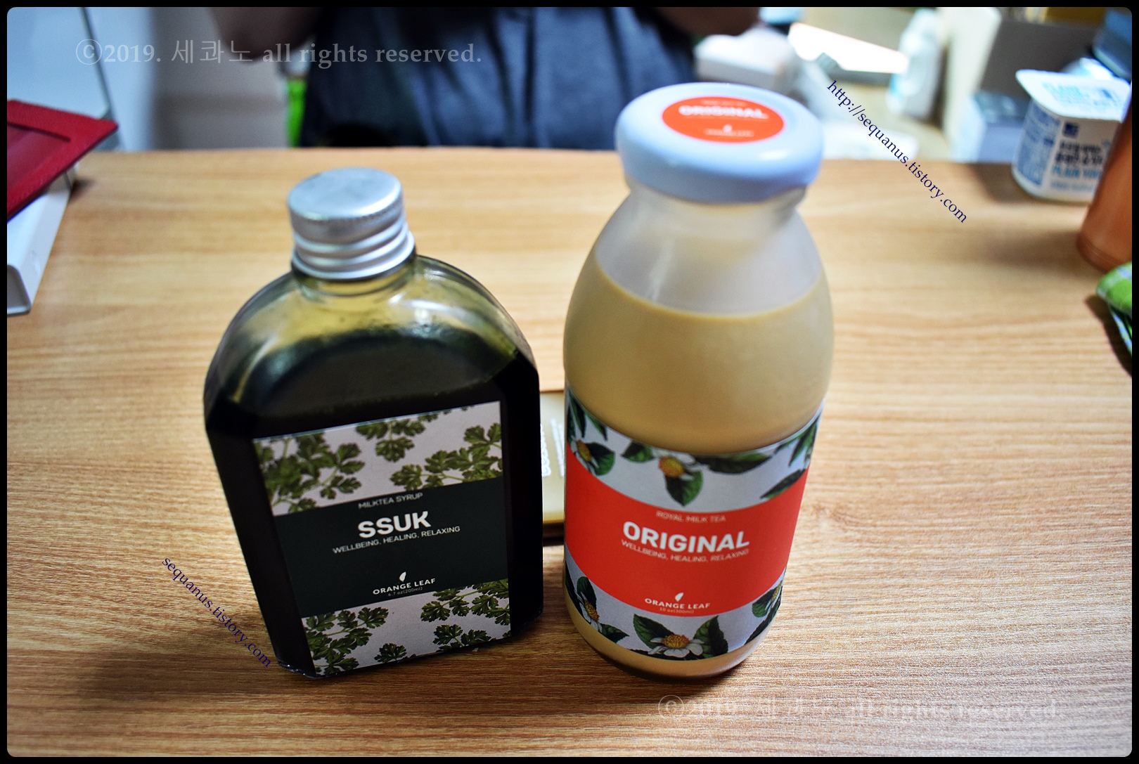 오리지널 로얄 밀크티와 쑥 밀크티가 병에 담겨 있었다.