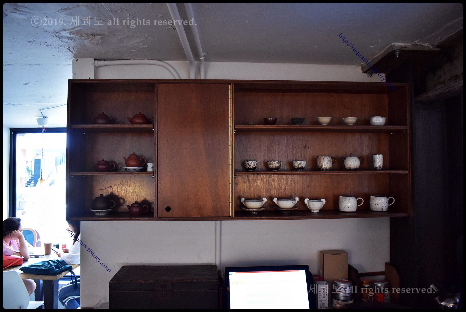 카운터 뒤편에 다양한 다구들이 놓여 있었고