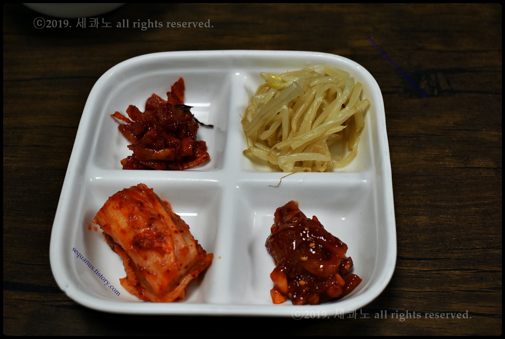 오징어 젓갈, 무말랭이 무침, 김치, 콩나물 무침