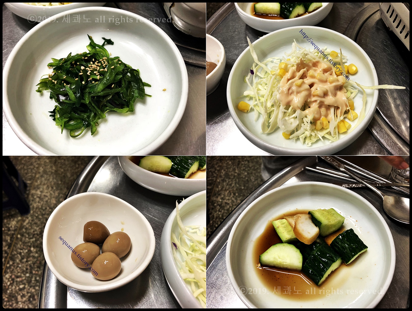 해초무침, 메추리알, 양배추 샐러드, 양파절임에 담근 오이