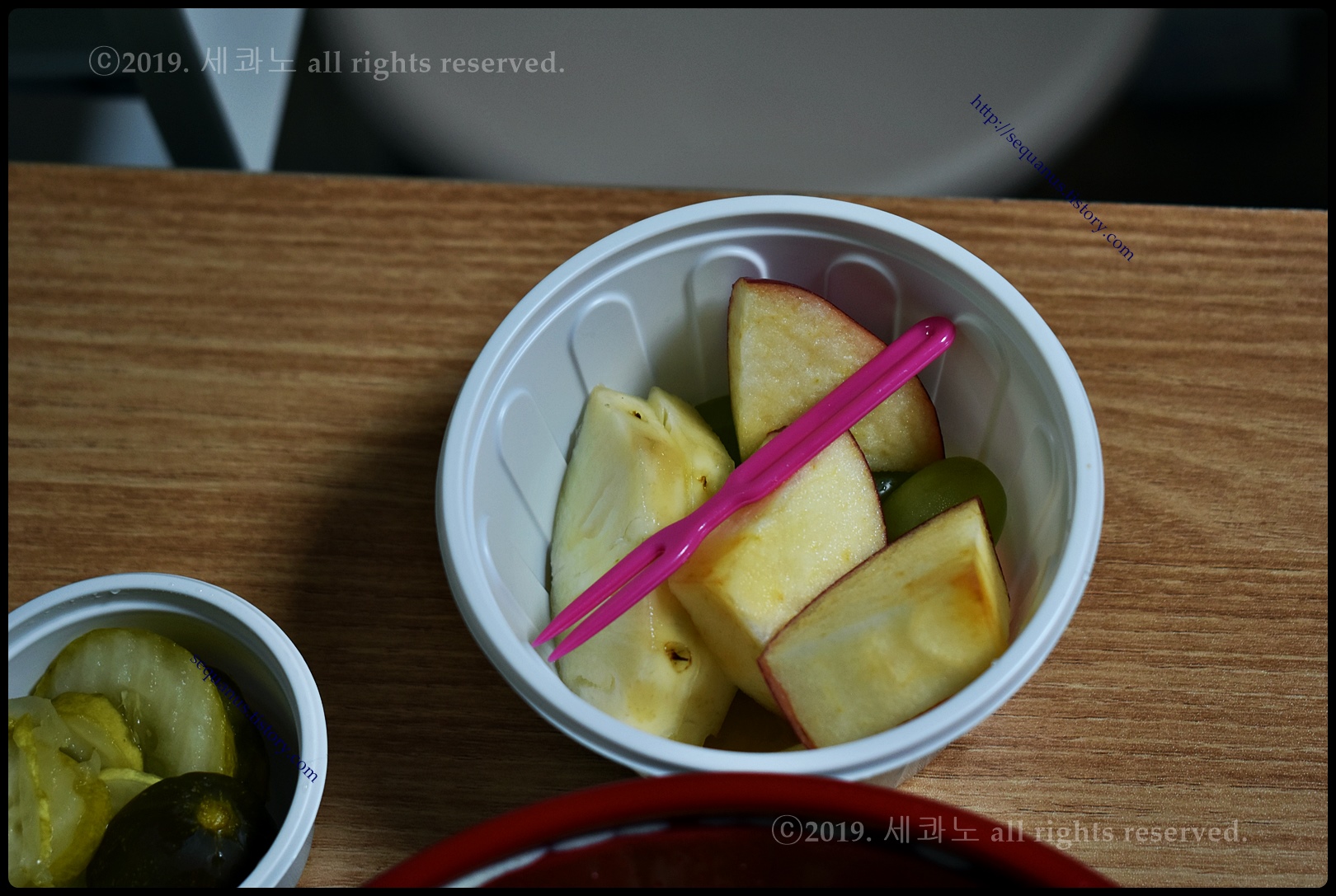 서비스로 나온 파인애플, 사과, 청포도 등의 과일