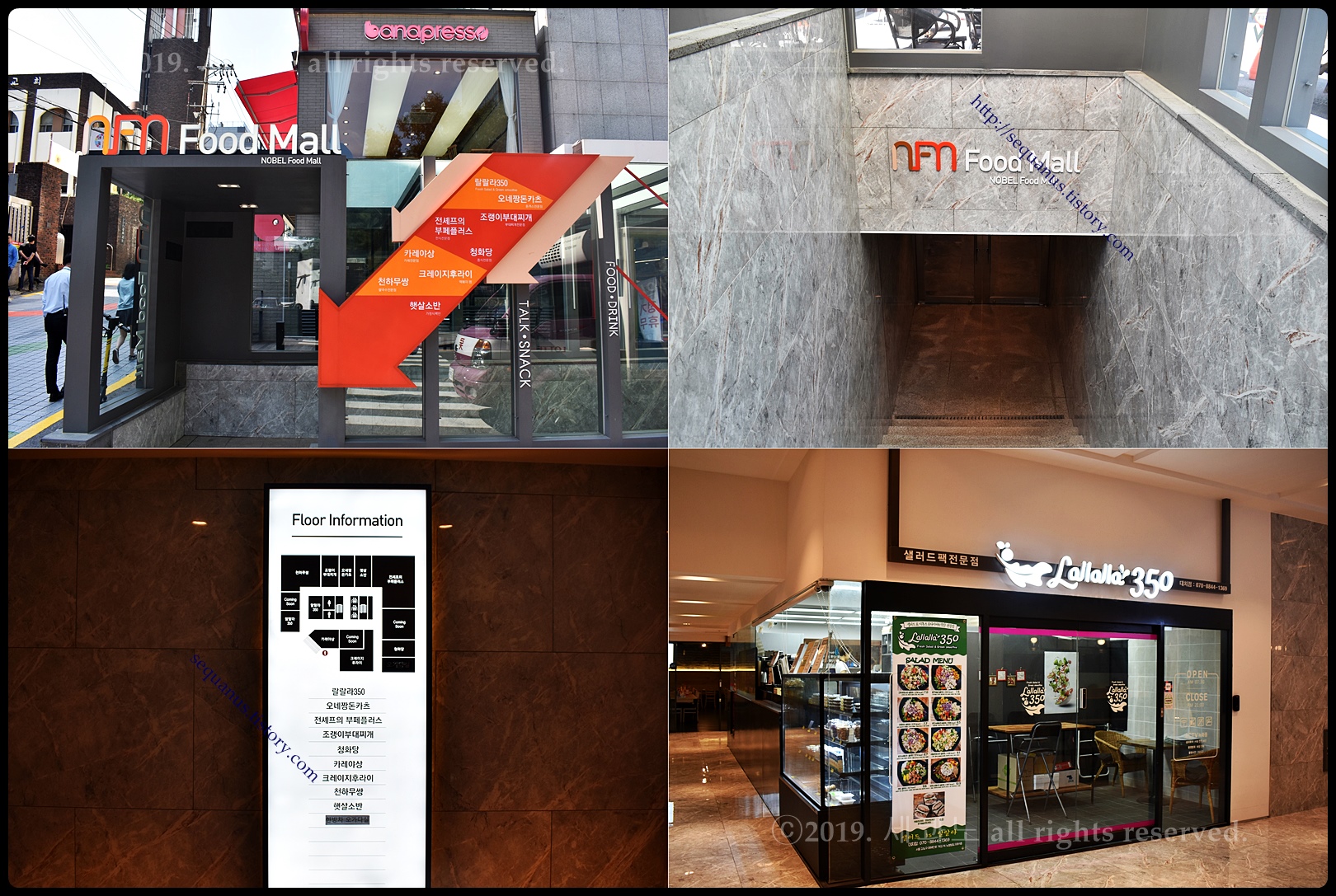 모퉁이 쪽에 지하 푸드몰로 내려가는 계단이 있다.