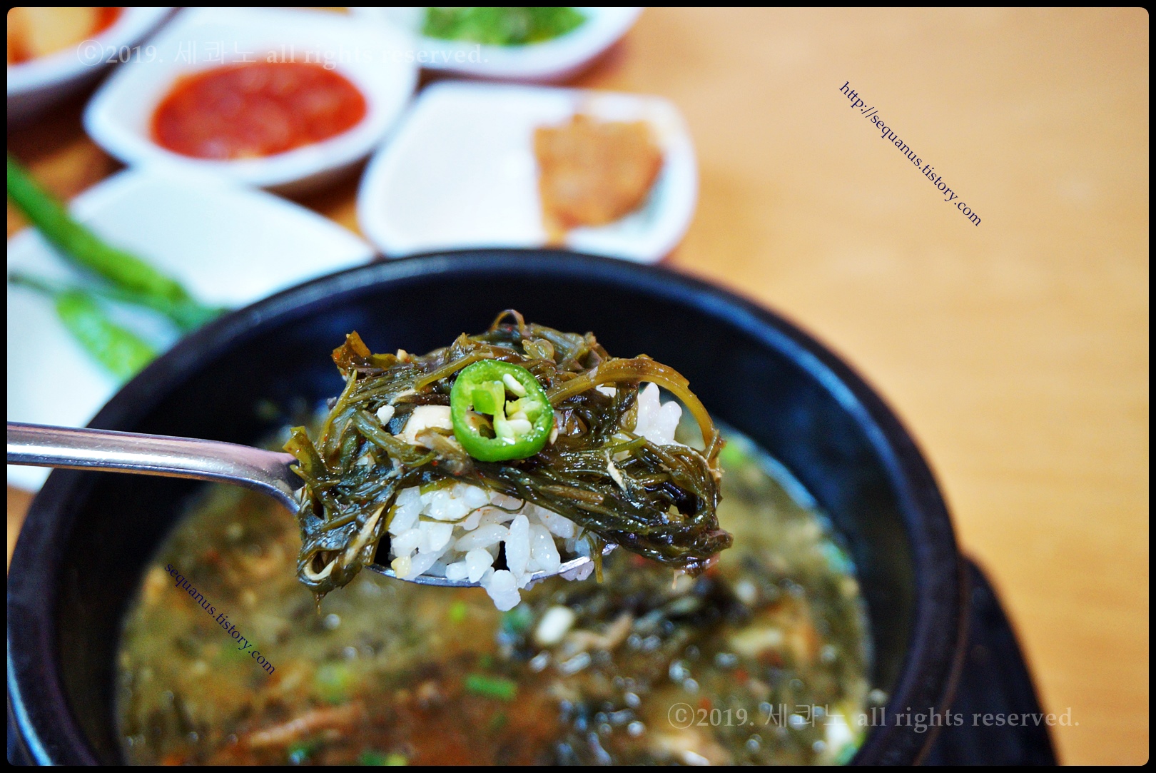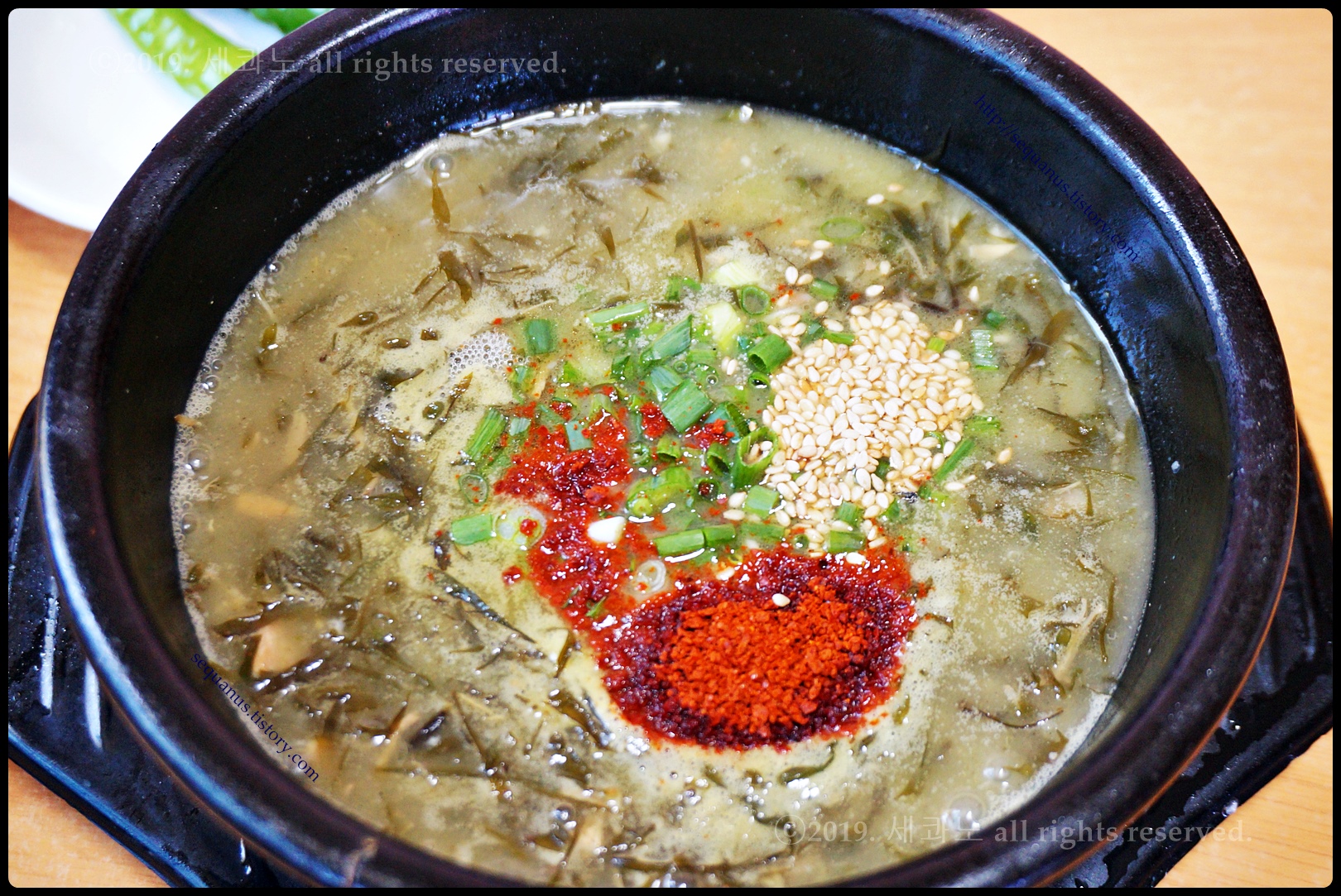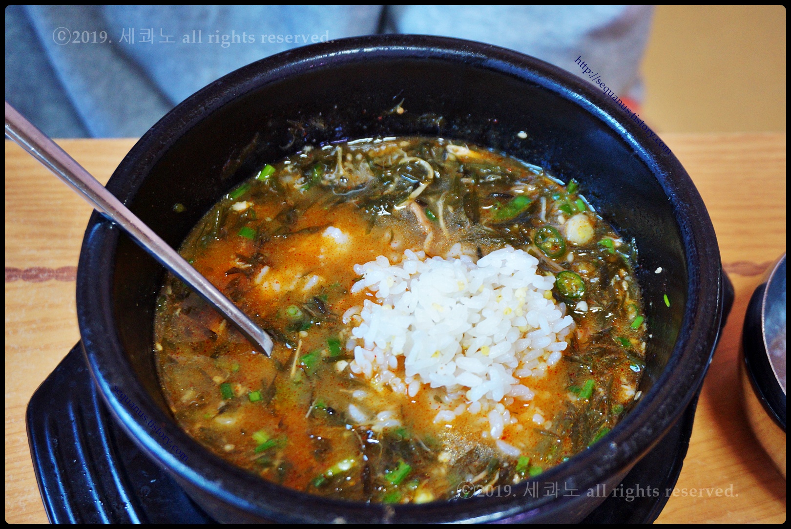 구수하고 새콤하게 씹히는 김치와 해초 맛이 어우러져