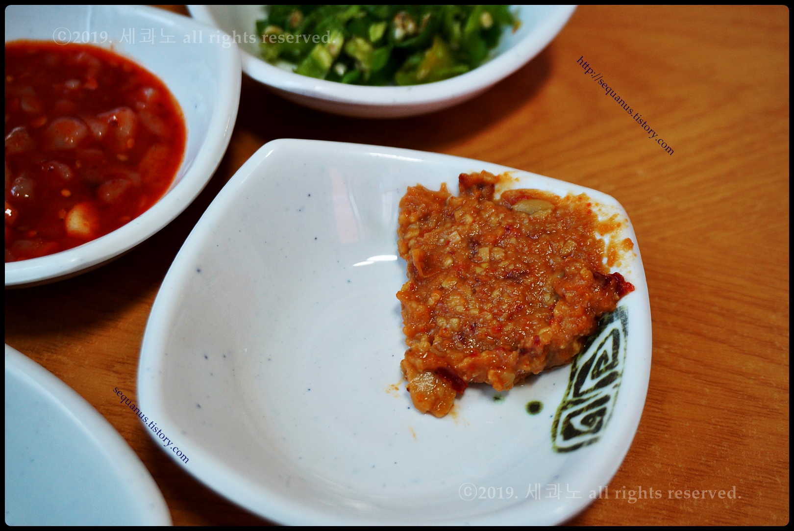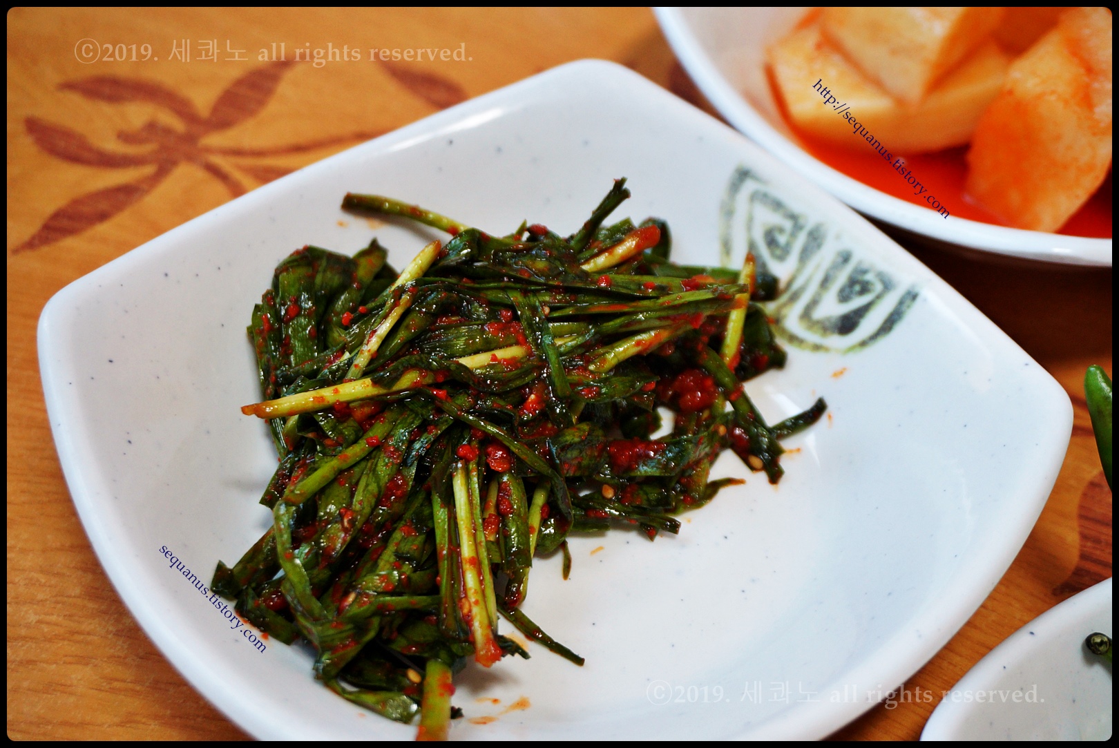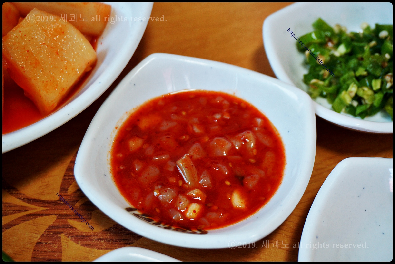 오징어젓갈과 부추무침, 깍두기가 반찬으로 나오고