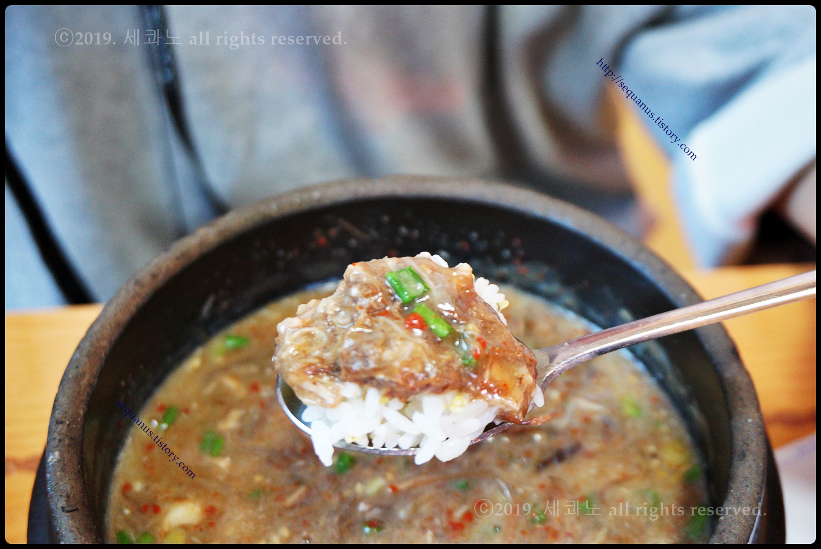 그 위에 해장국 건지, 건더기를 올려 맛을 보고