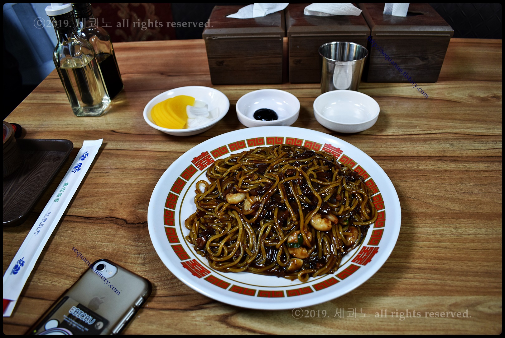 단무지와 양파, 춘장이 기본 찬으로 세팅되었다.
