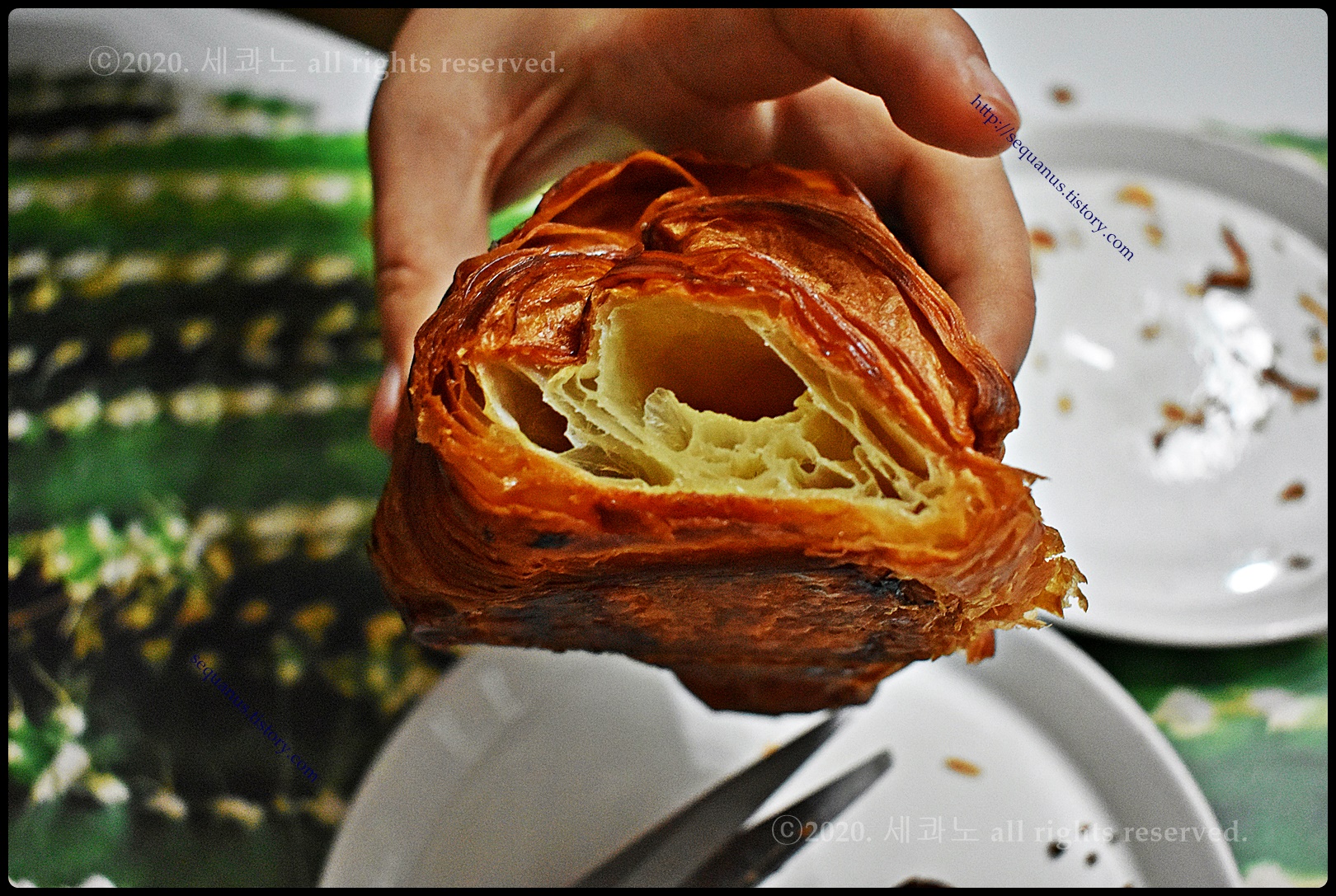 솔트 크루아상을 가위로 한 번 잘라보았다.