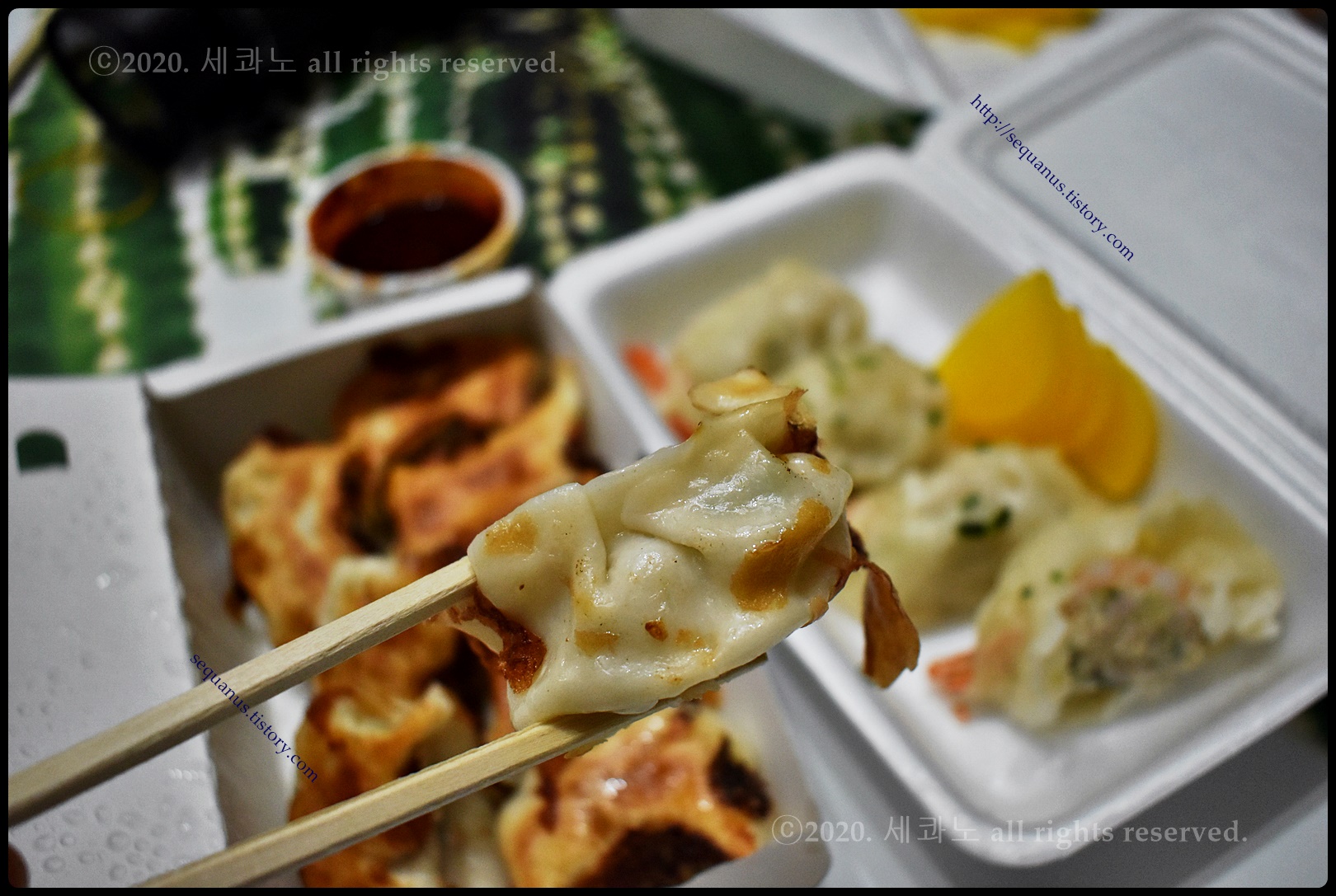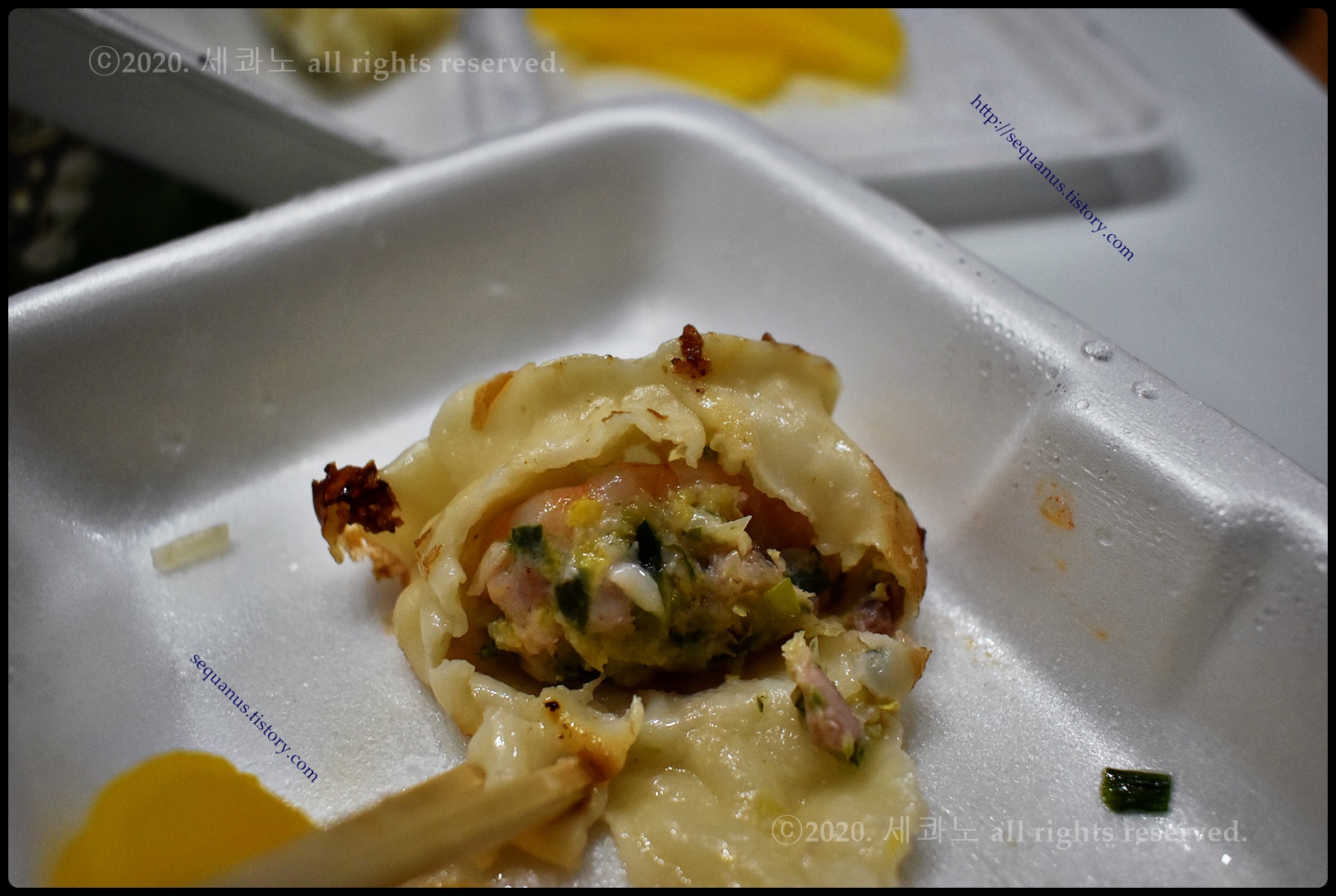한쪽은 굽고, 한쪽은 찐, 굽찐만두다.