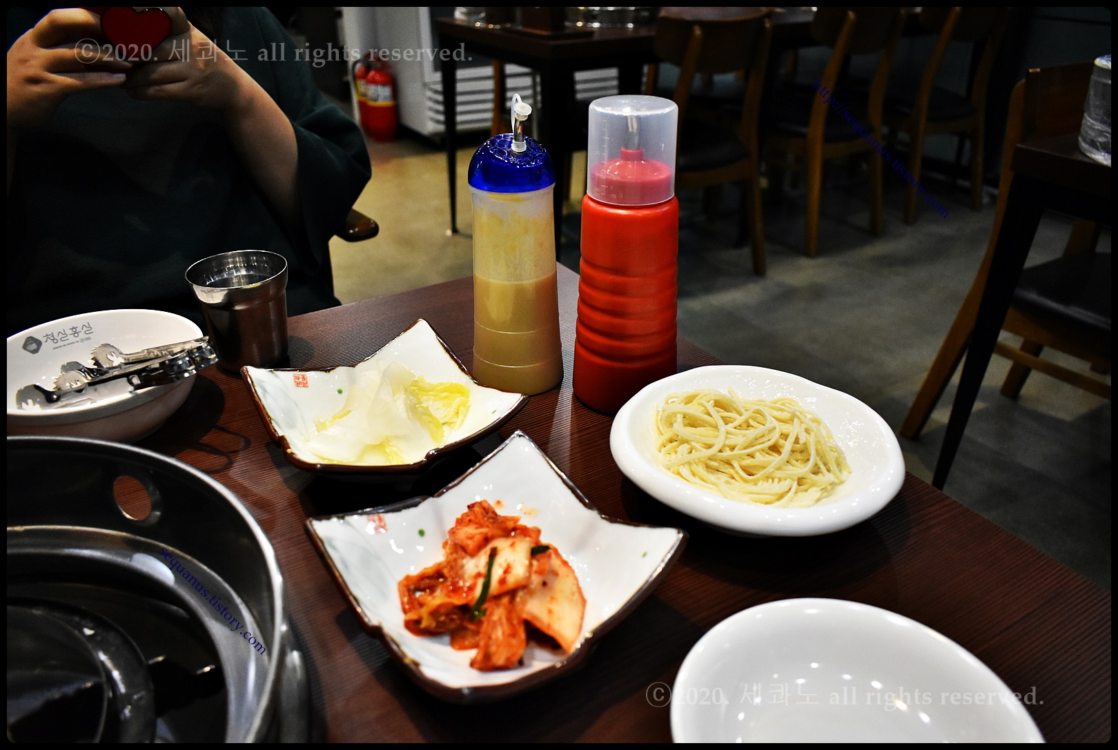 겨자 소스와 빨간 양념 소스가 나왔다.
