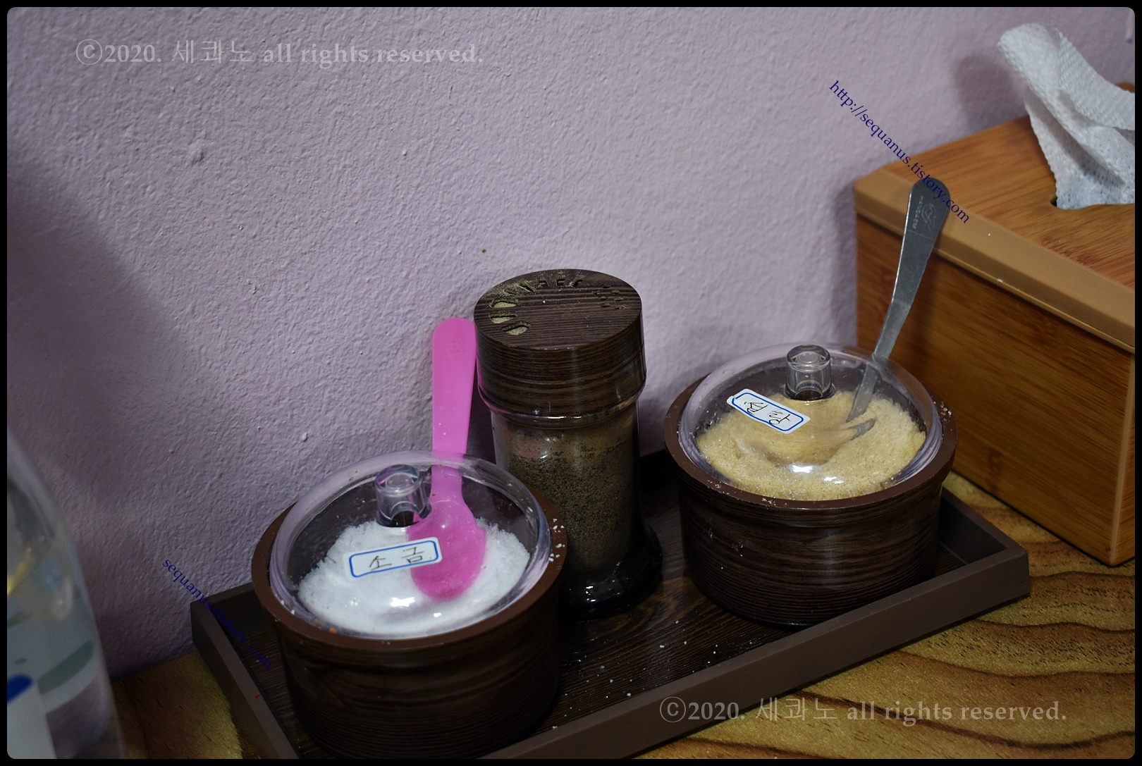 테이블에는 소금과 설탕, 후추가 준비되어 있었다.