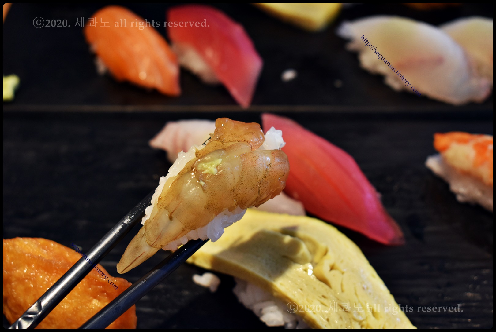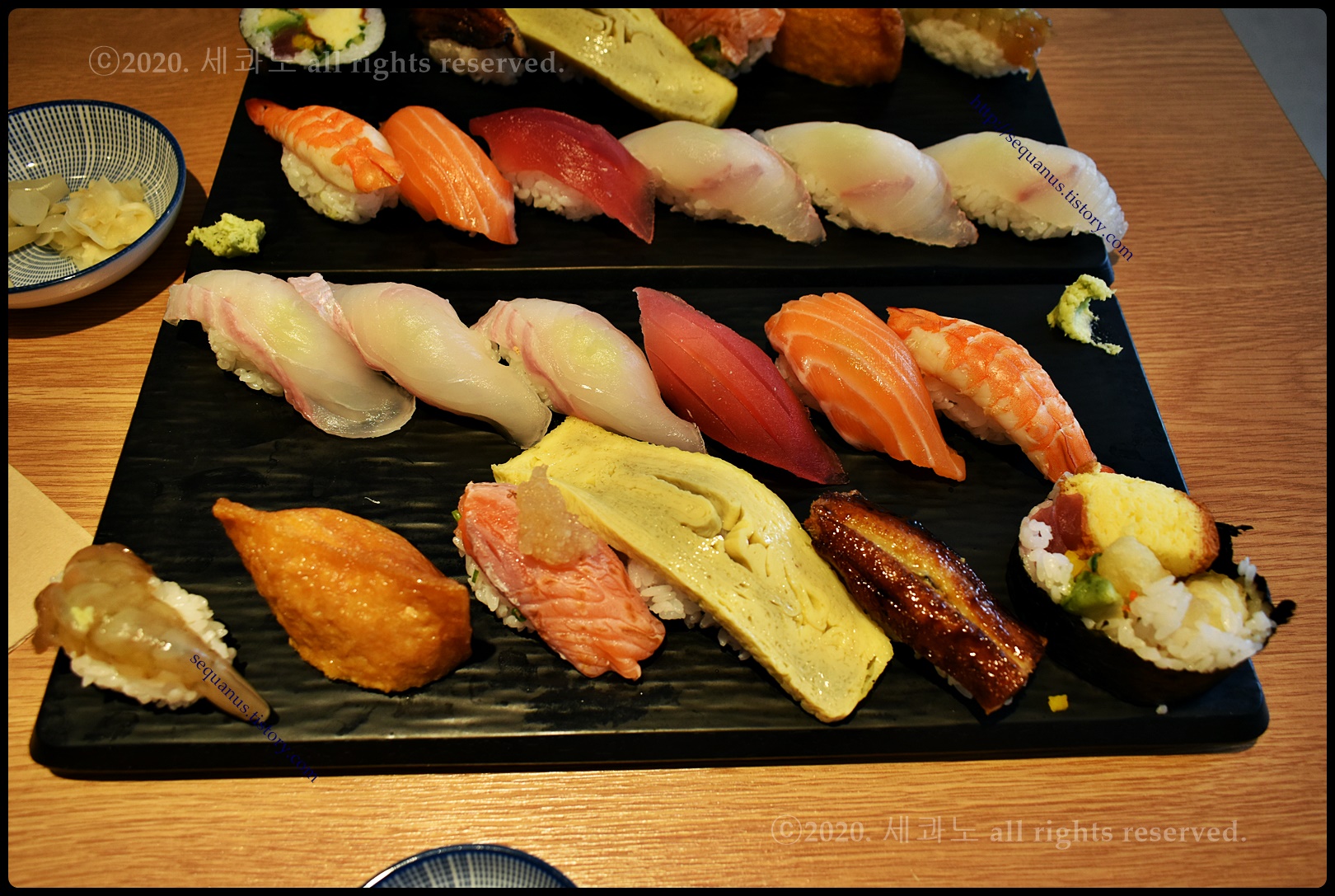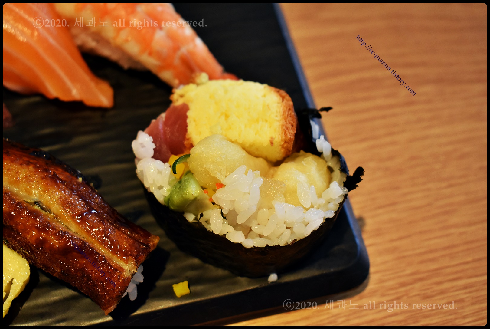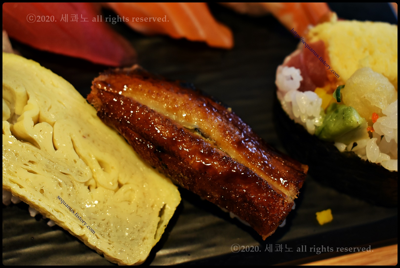 장새우 1점, 유부초밥 1점, 연어 아부리(구운 연어) 1점, 계란 초밥, 장어 초밥, 대왕 초밥 후토마끼