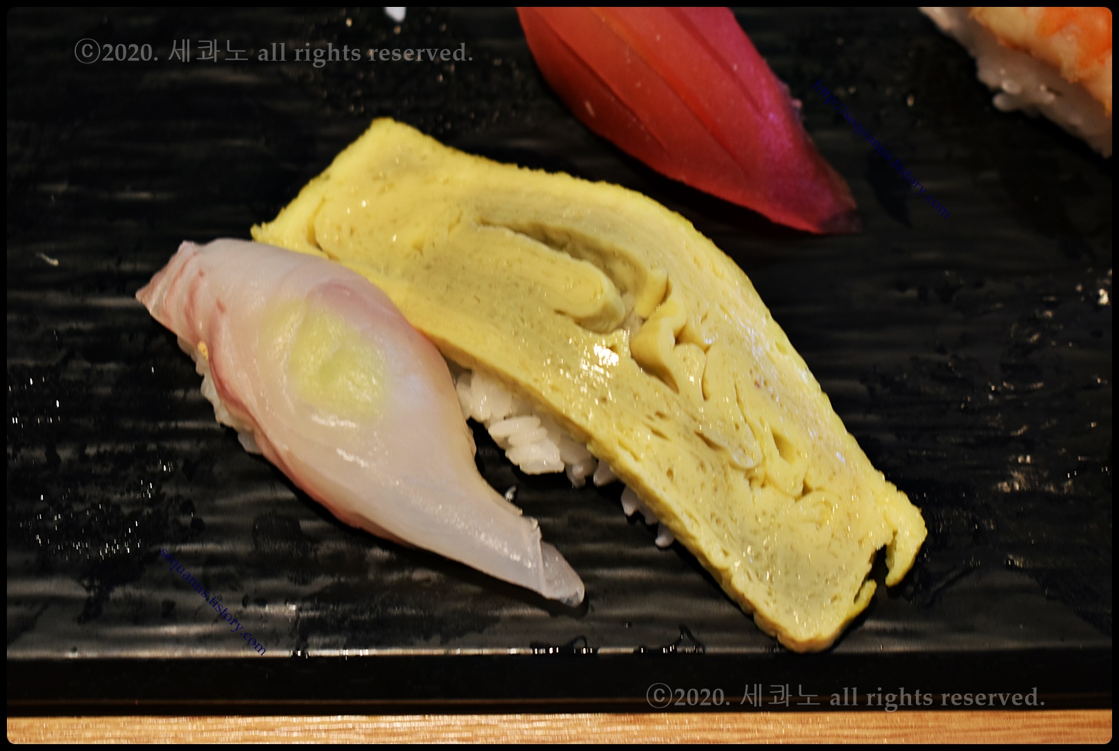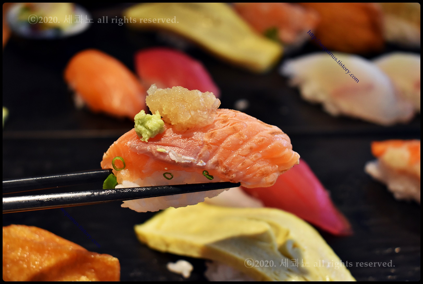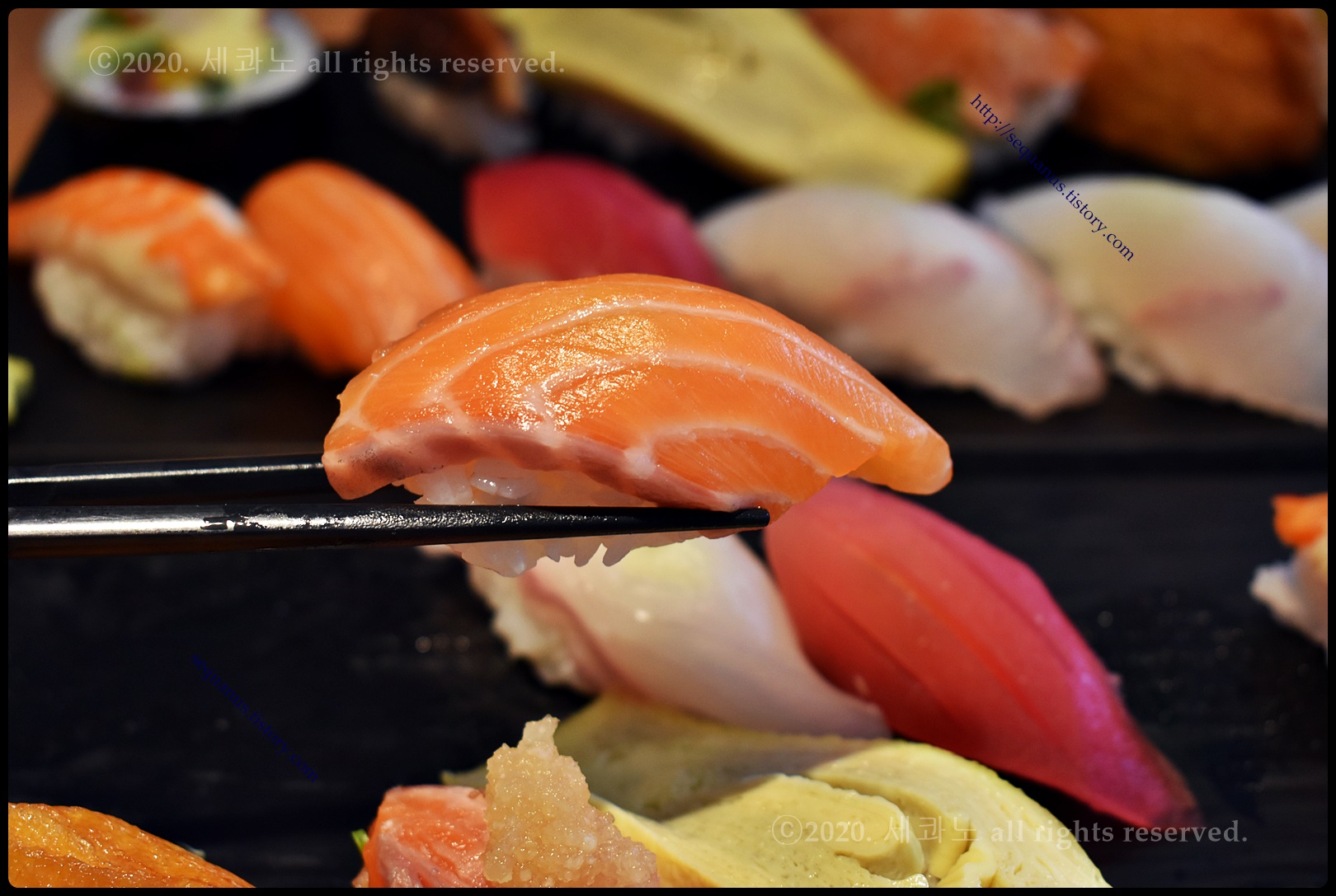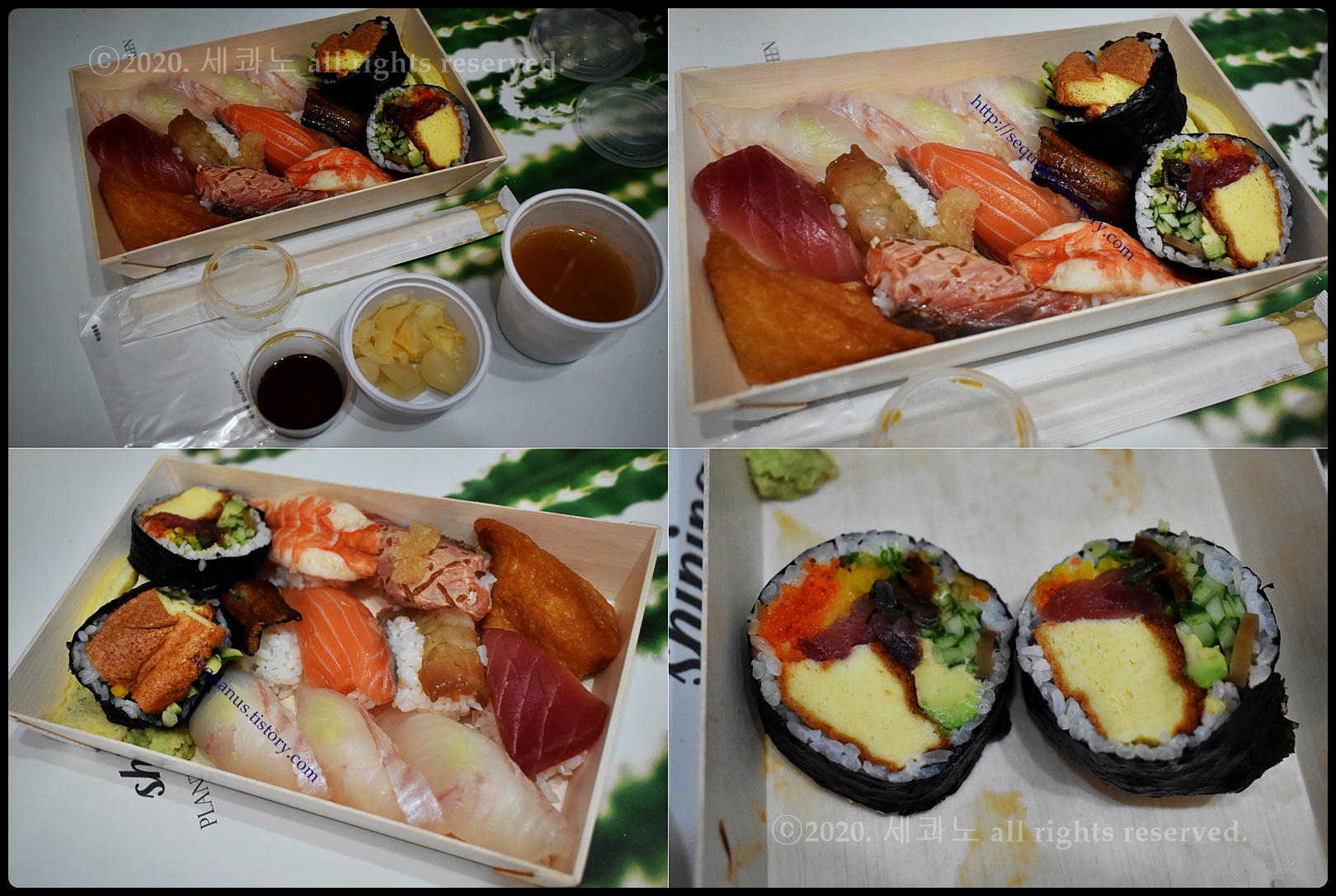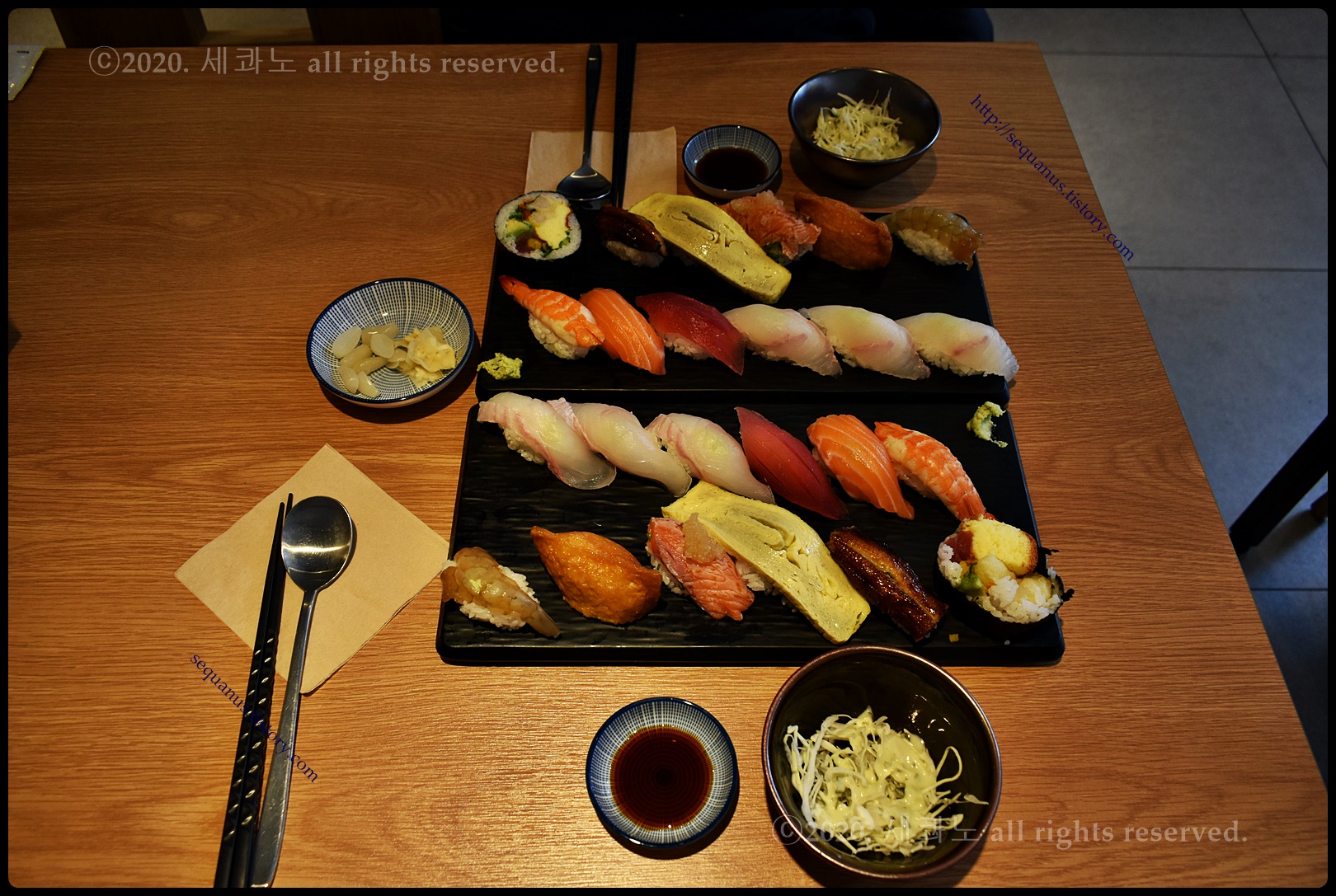 장새우 1점, 유부초밥 1점, 연어 아부리(구운 연어) 1점, 계란 초밥, 장어 초밥, 대왕 초밥 후토마끼