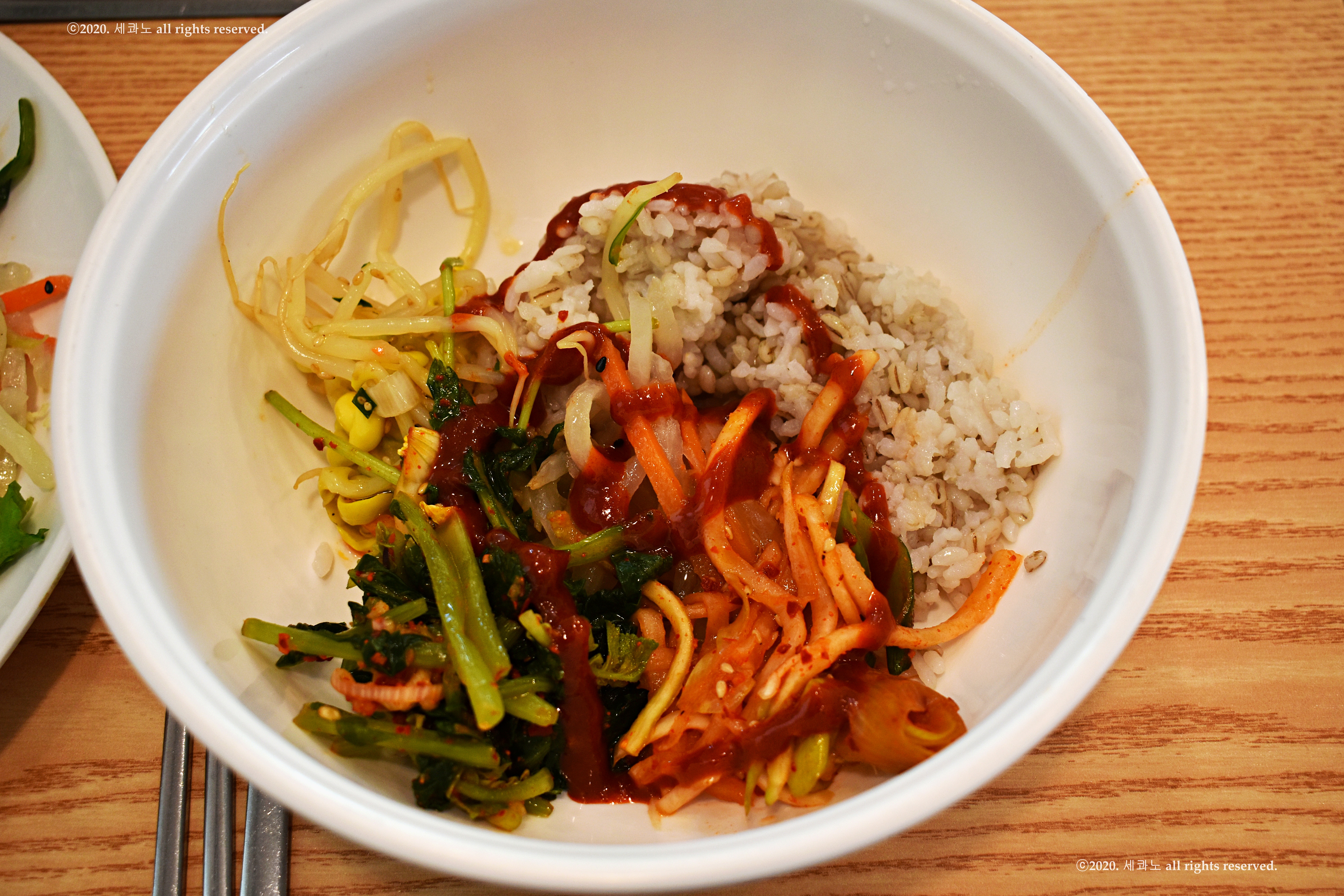 밥 대용으로 비빔밥 코너에 가서 보리 비빔밥을 구성해 왔다.