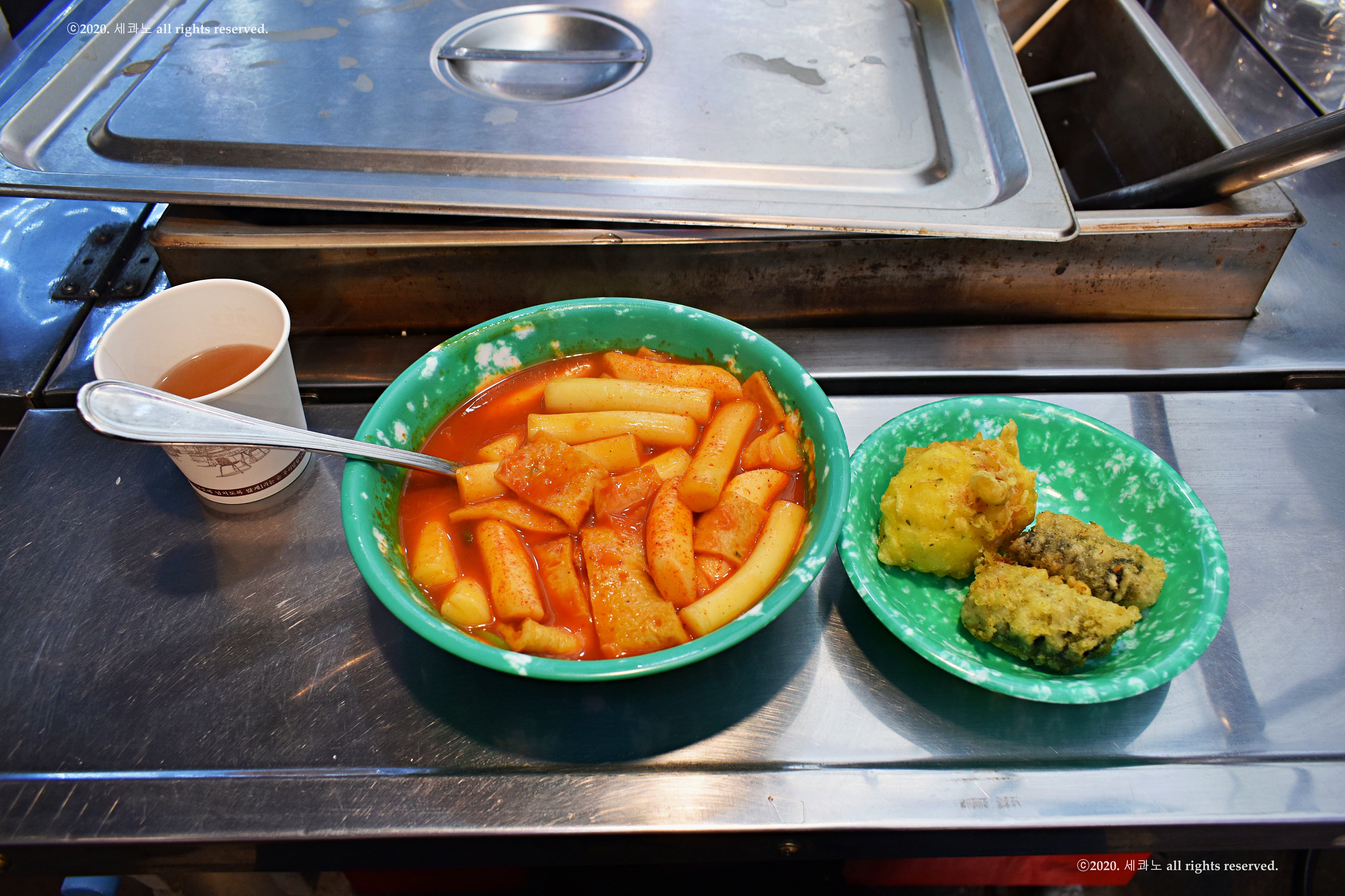 즉석 국물 떡볶이와 튀김에 관한 것이다.