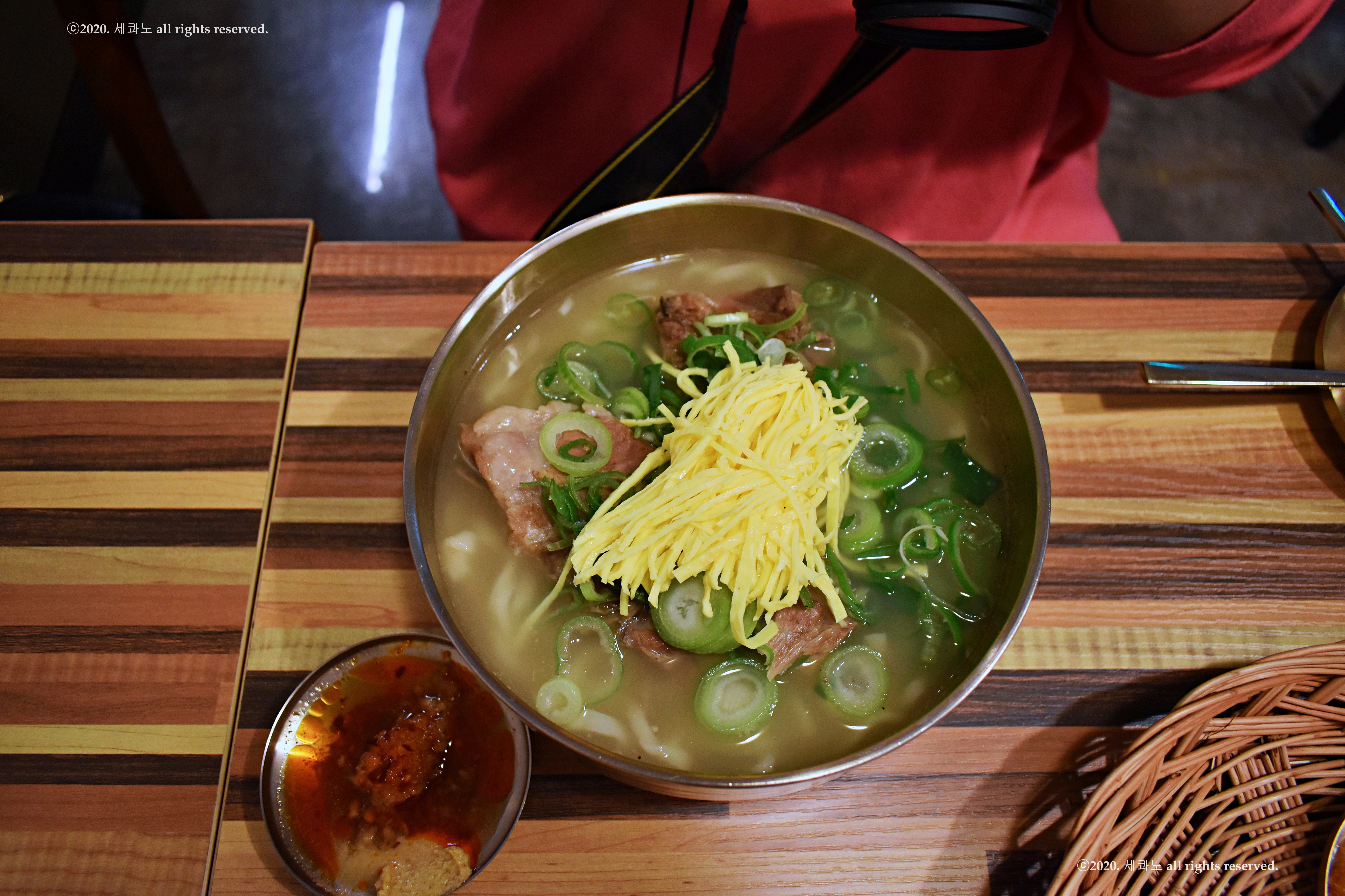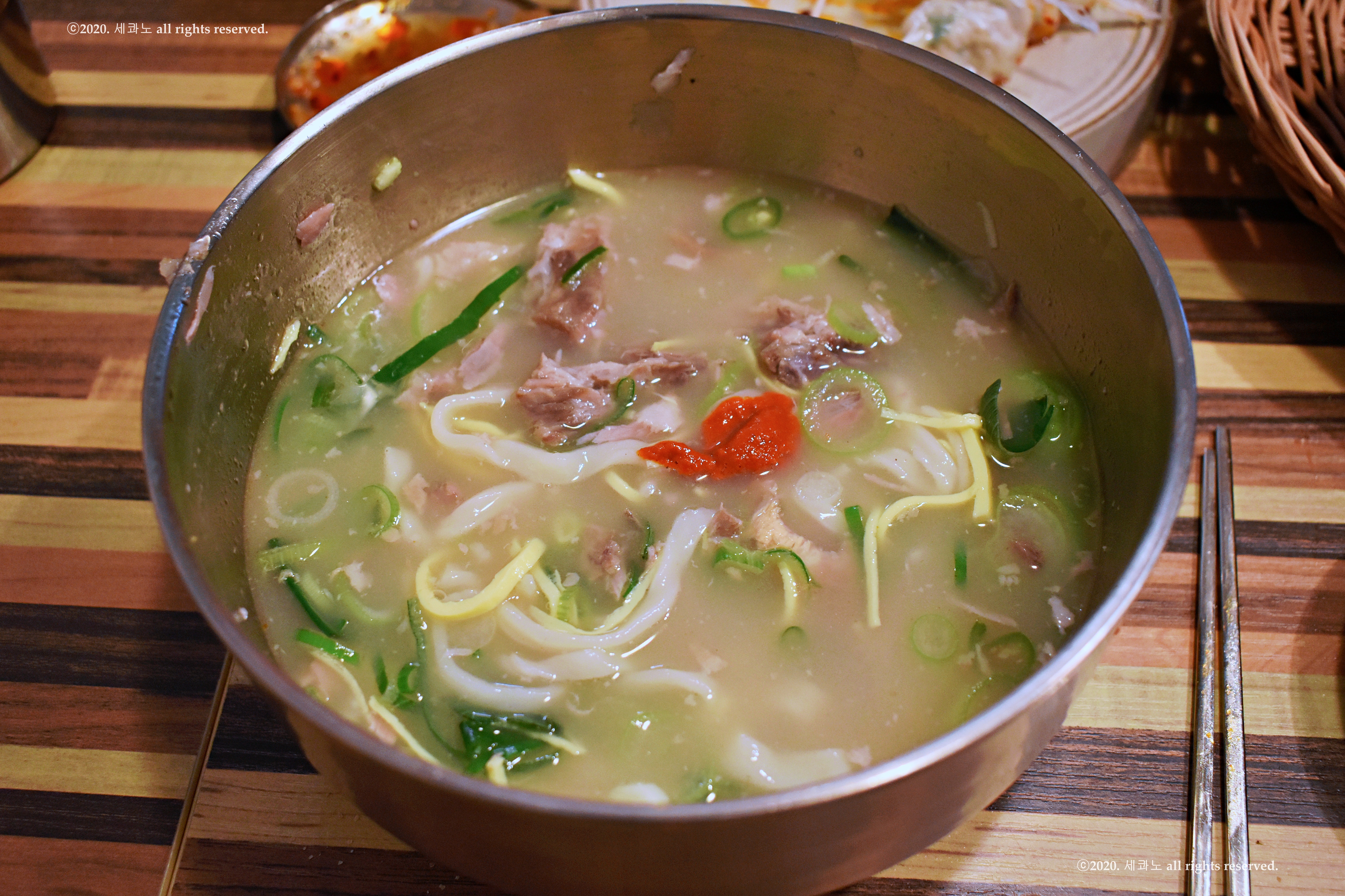 뼈칼국수 육수와 동일한 국물이다.