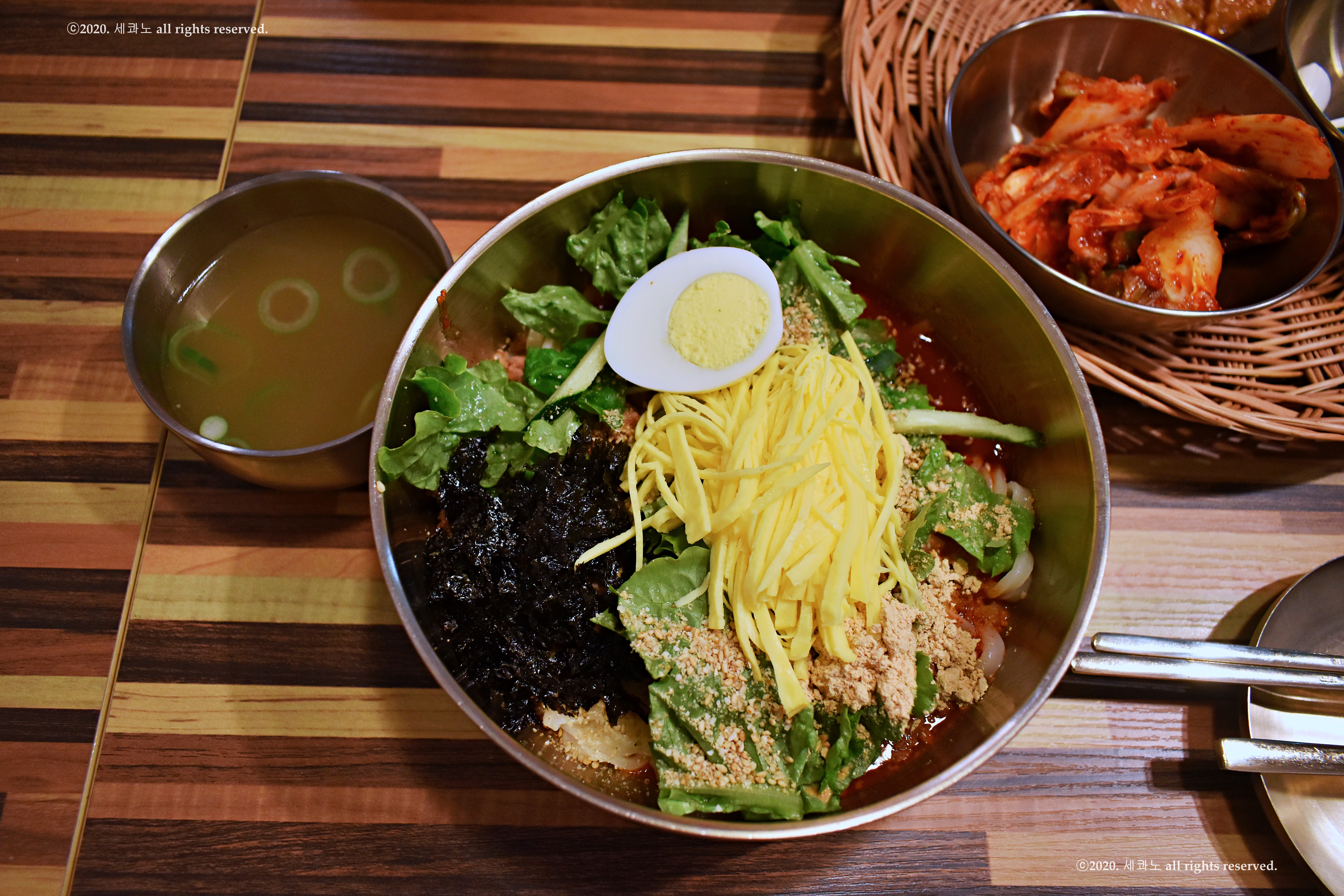 노란색 지단 채 썰어 잔뜩 올라간