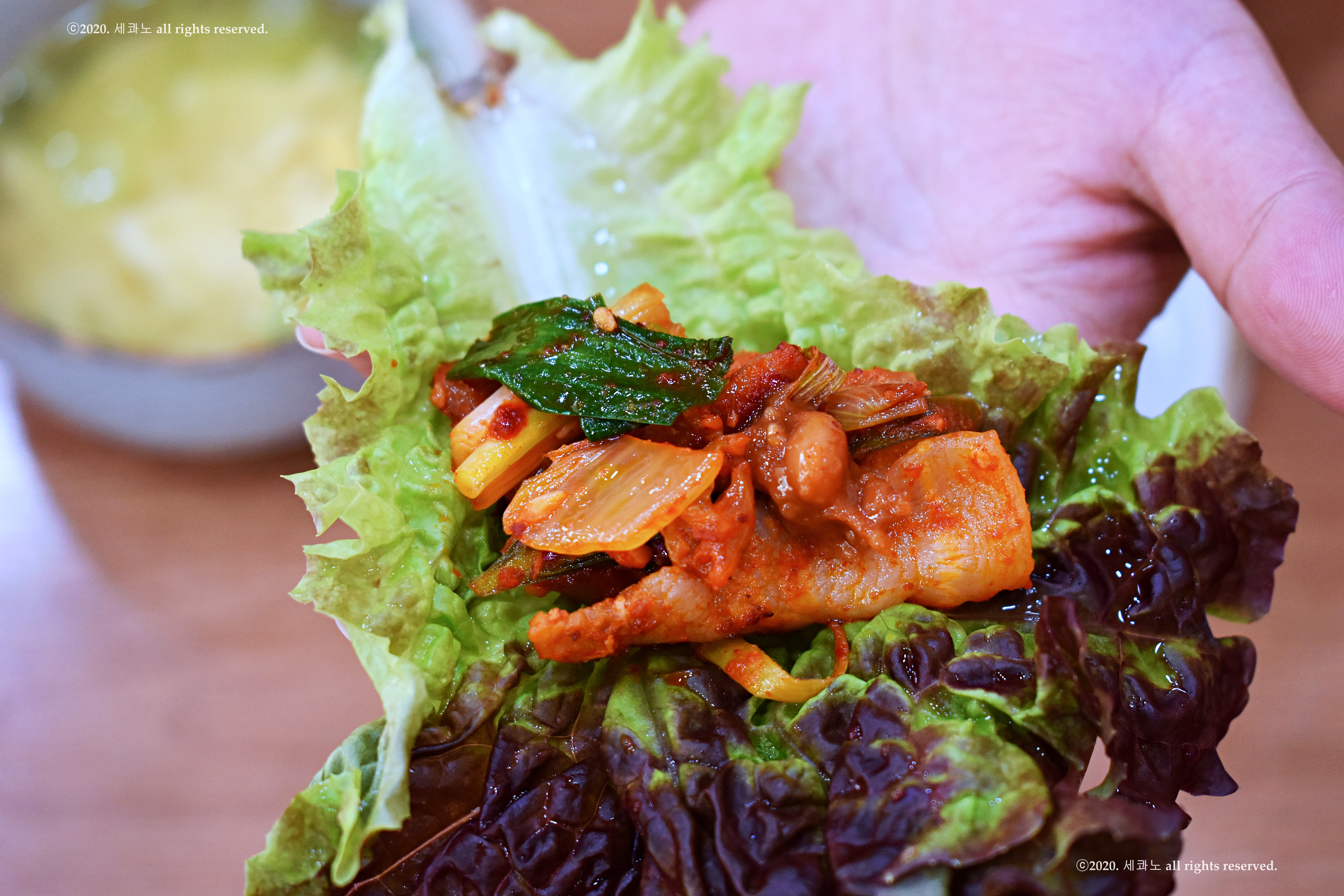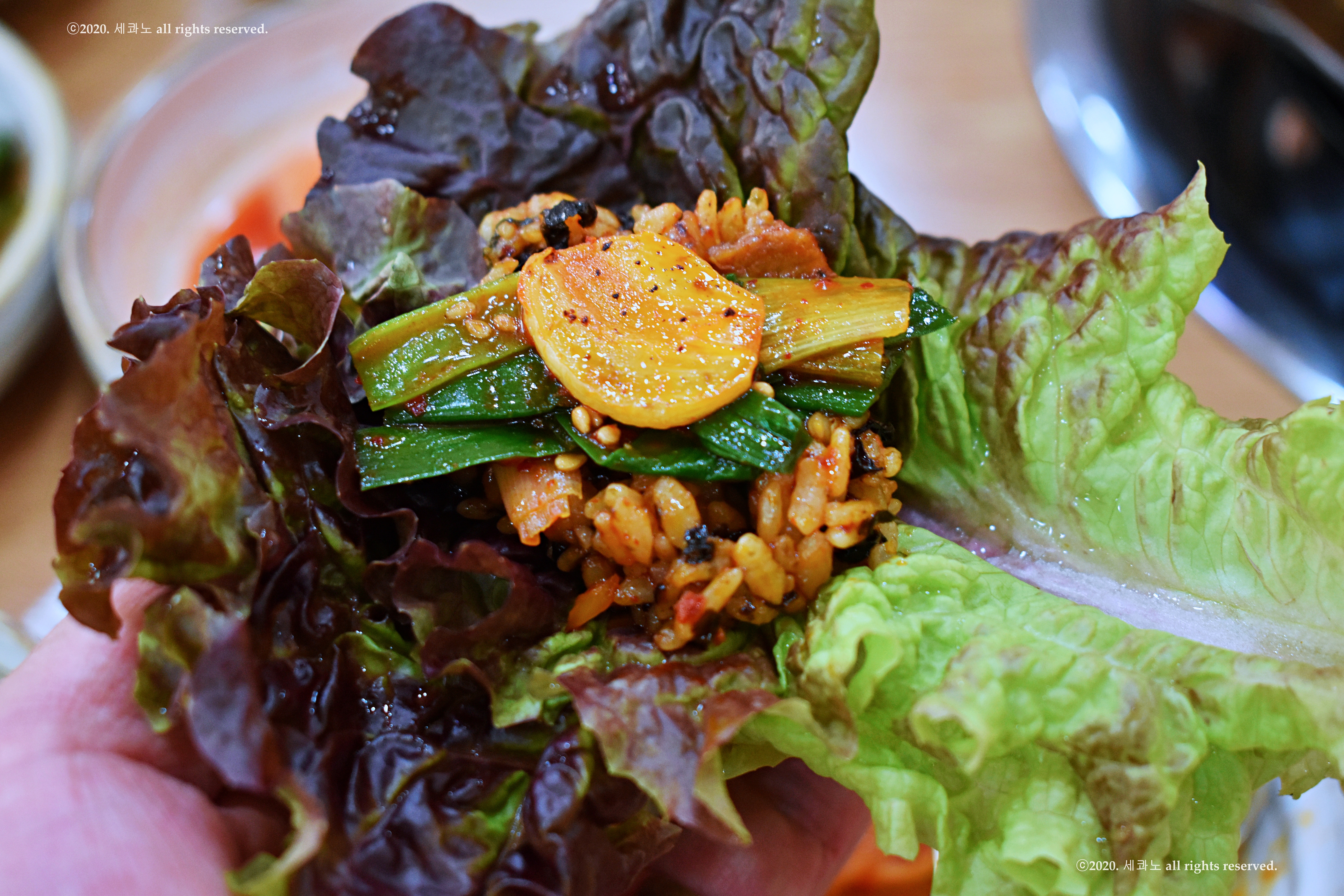 여기에 깻잎을 기본으로 한 새콤한 야채가 어울린 환상의 맛