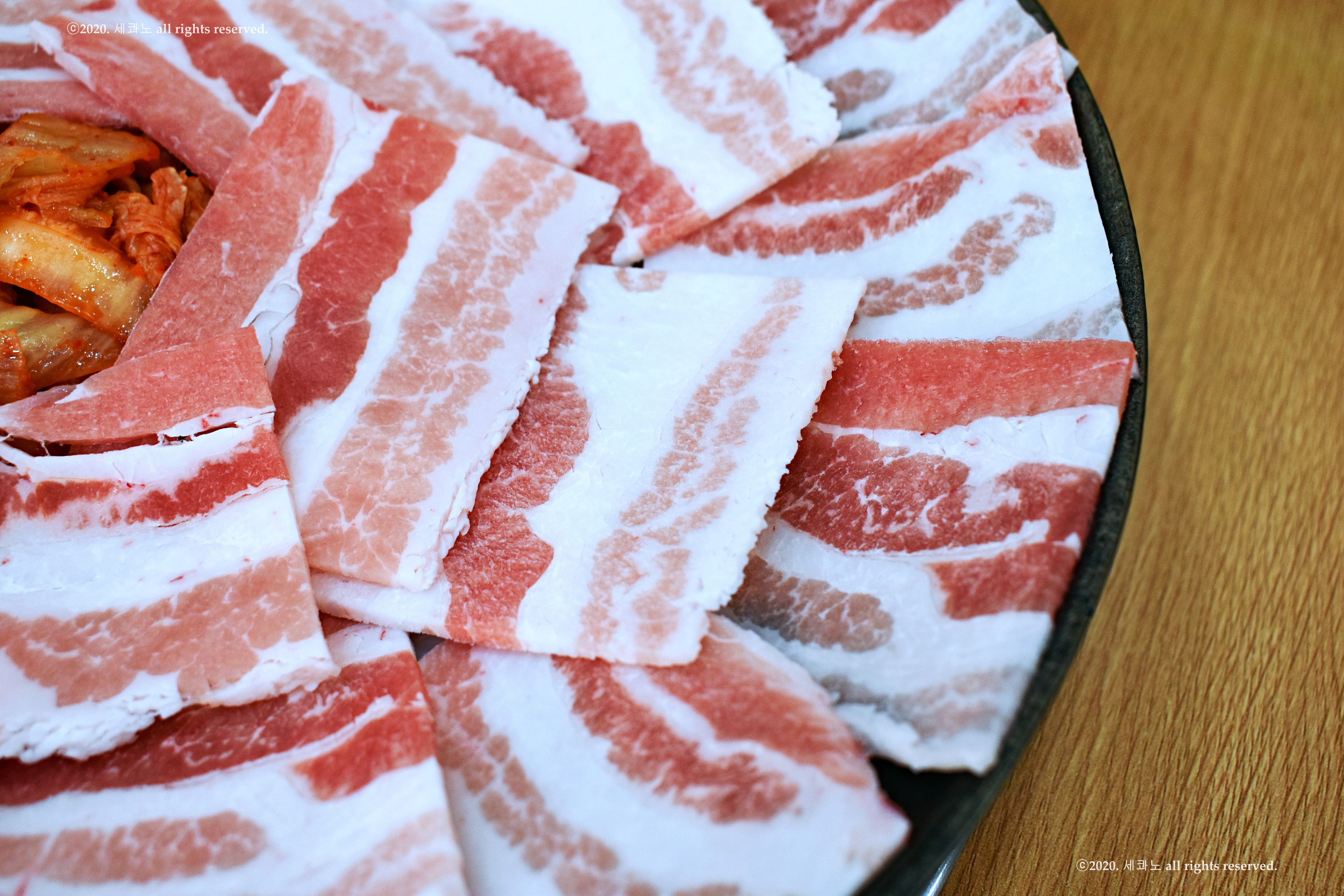 네모난 냉동 삼겹살을 빙 둘러준