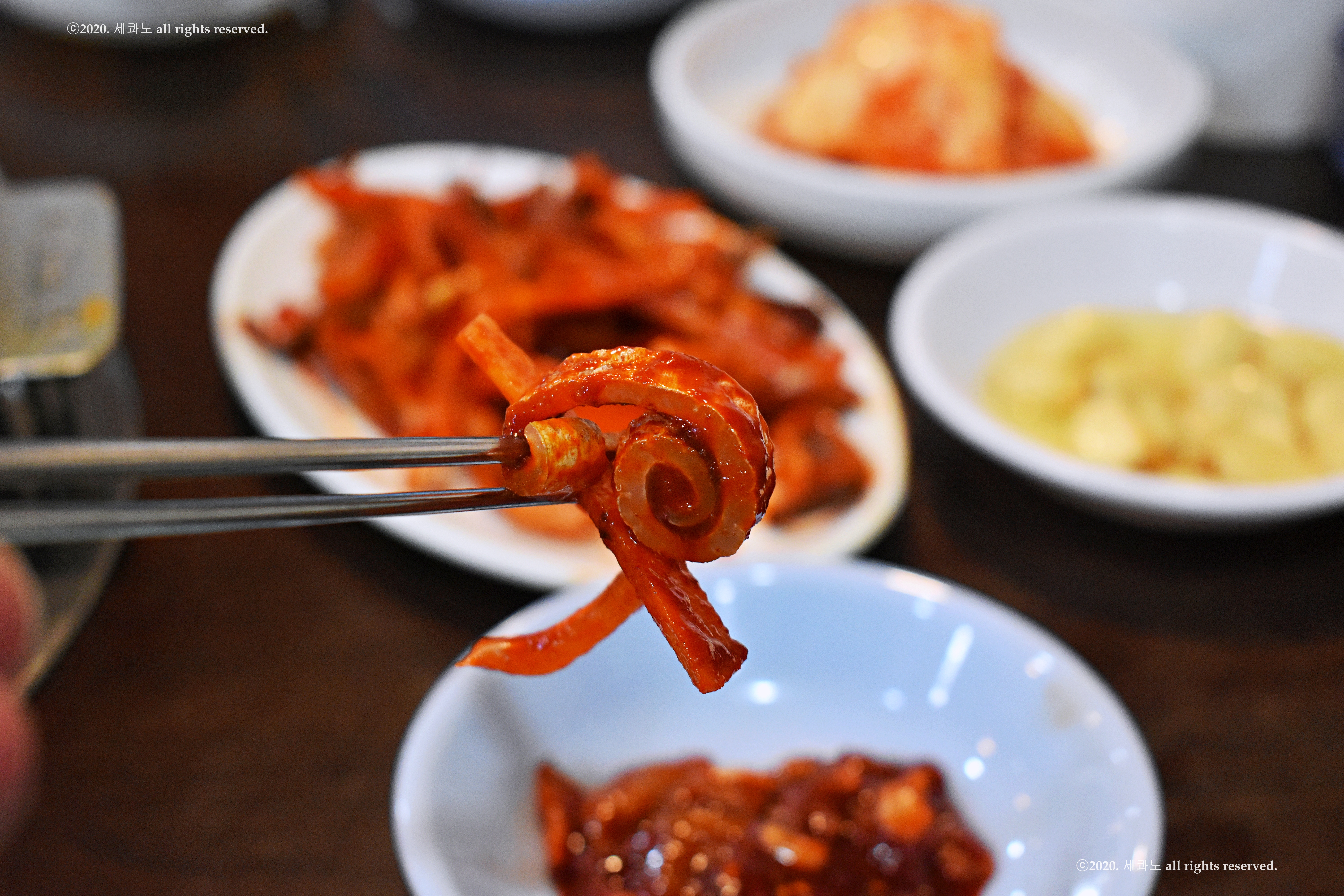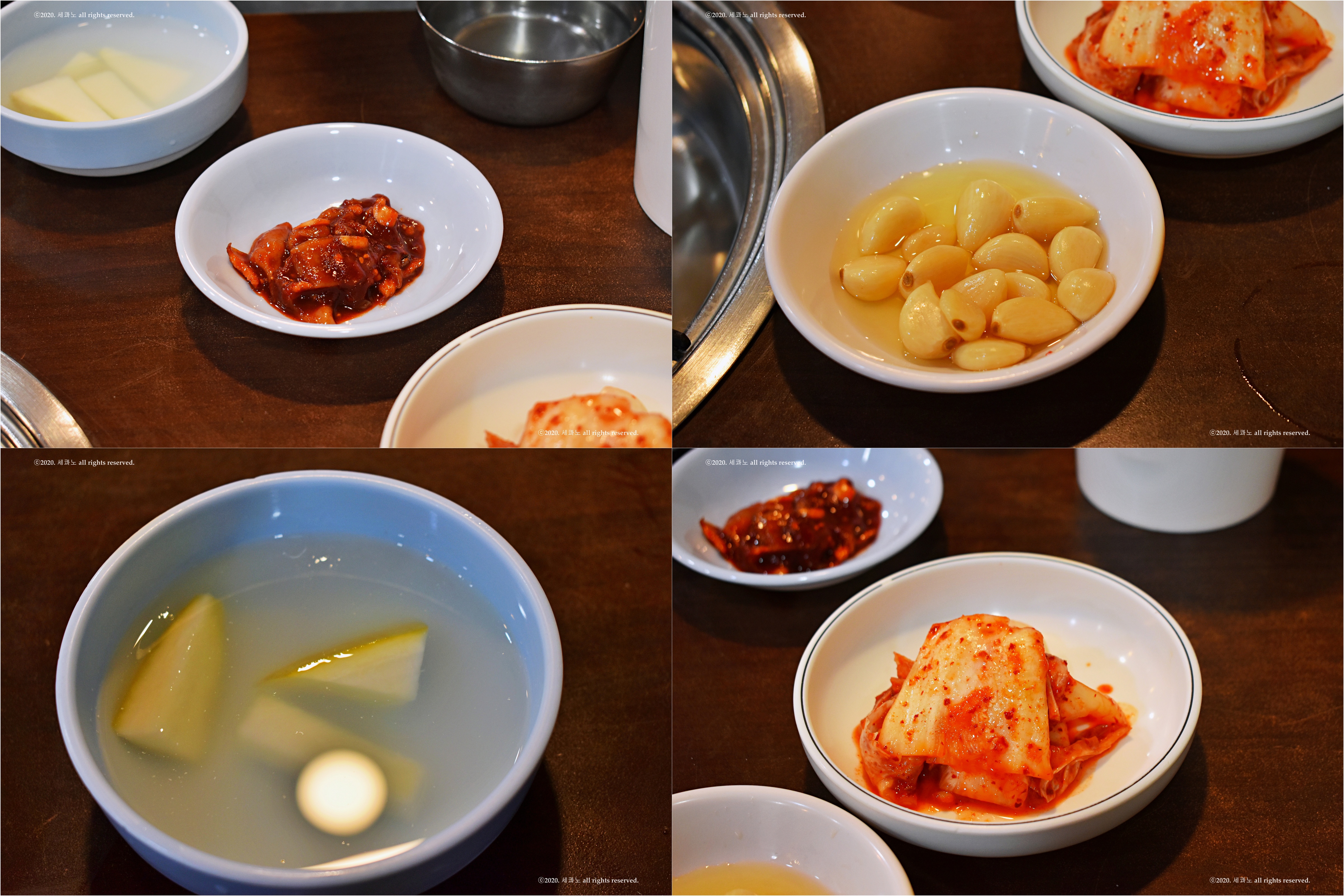 반찬으로는 꼴뚜기 젓과 초마늘, 김치가 나왔고