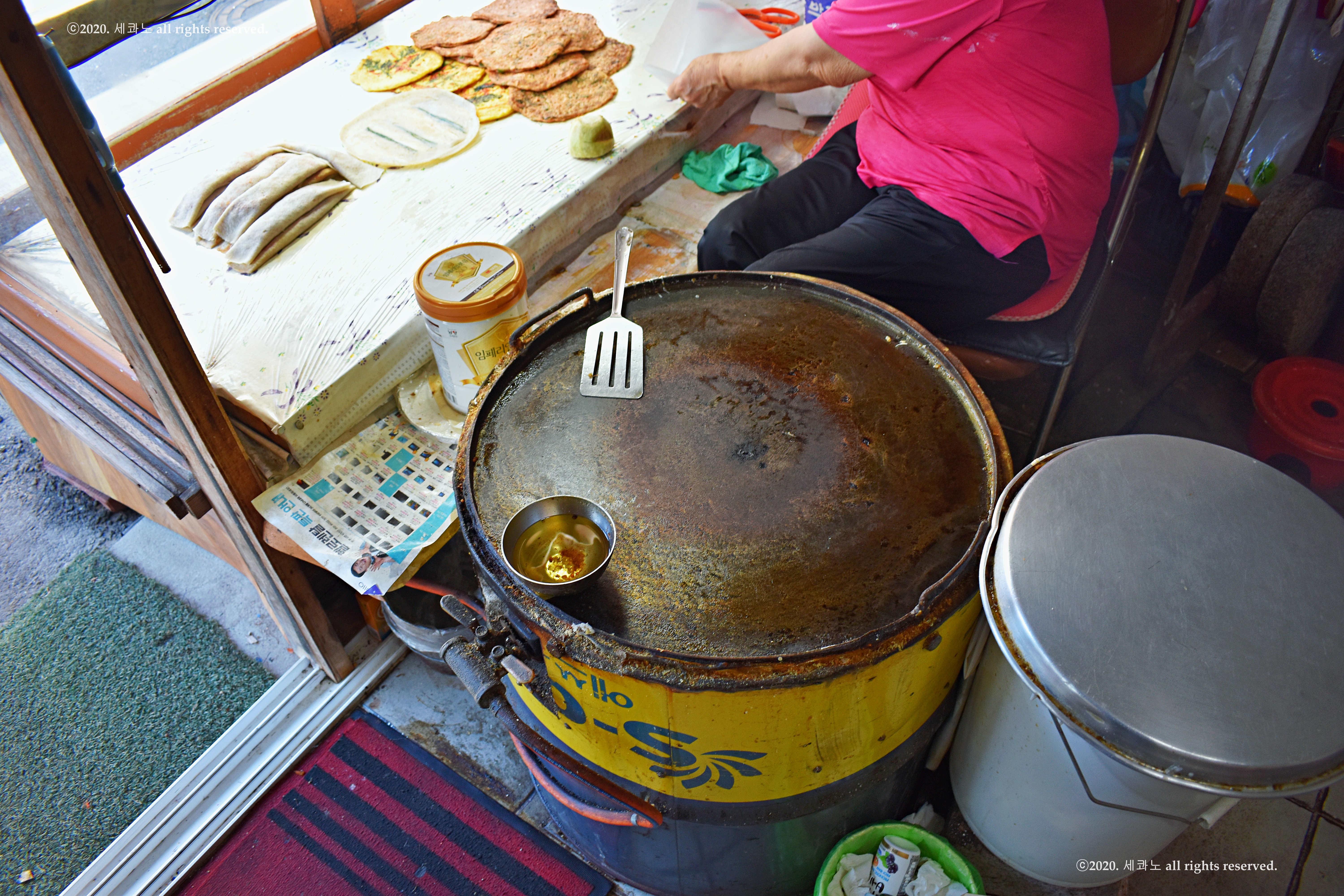 낡은 기름통과 그 위에 올려진 커다란 프라이팬이 정겨워