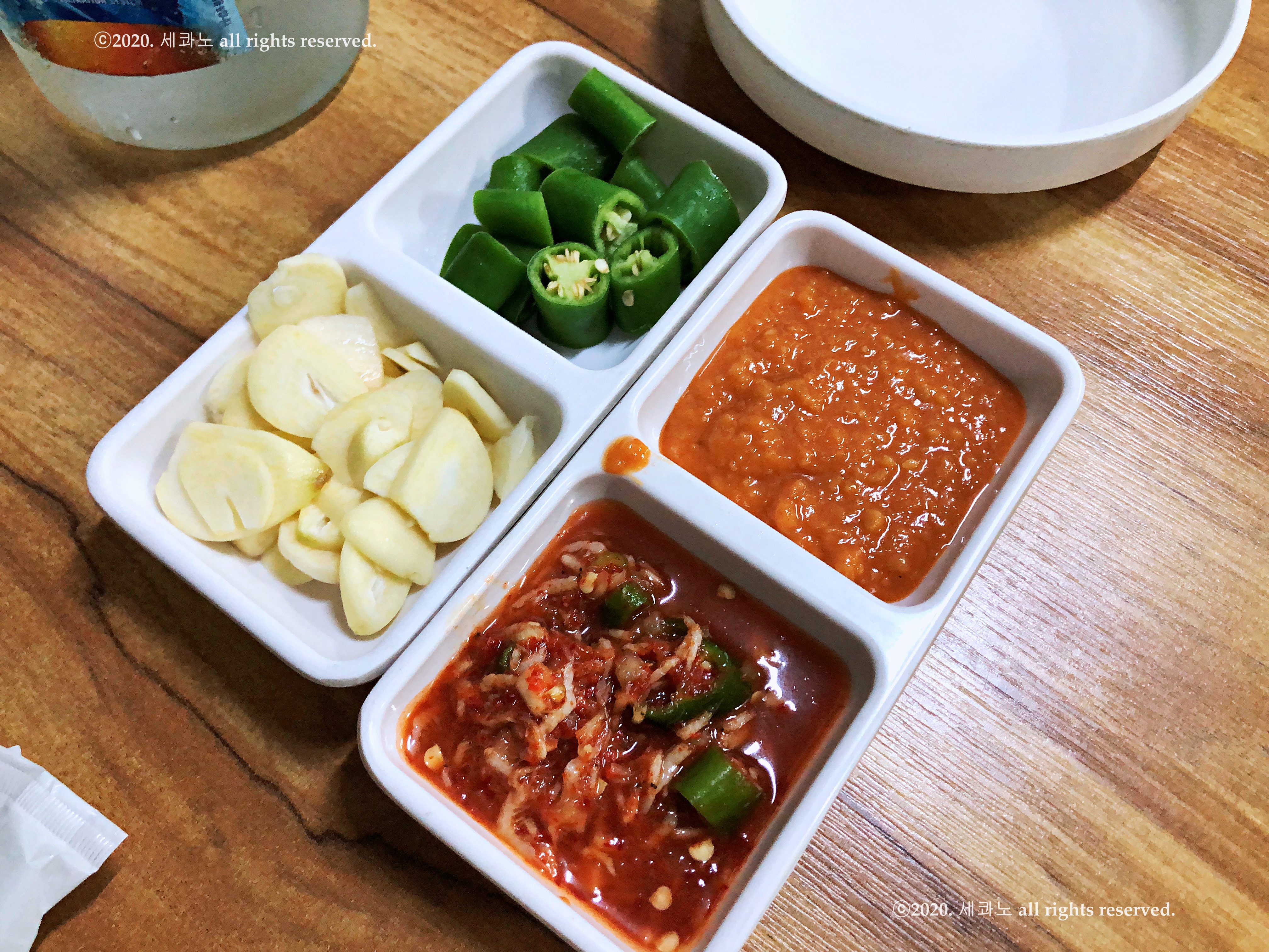 그리고 마늘과 고추, 새우젓과 쌈장이 나왔다.