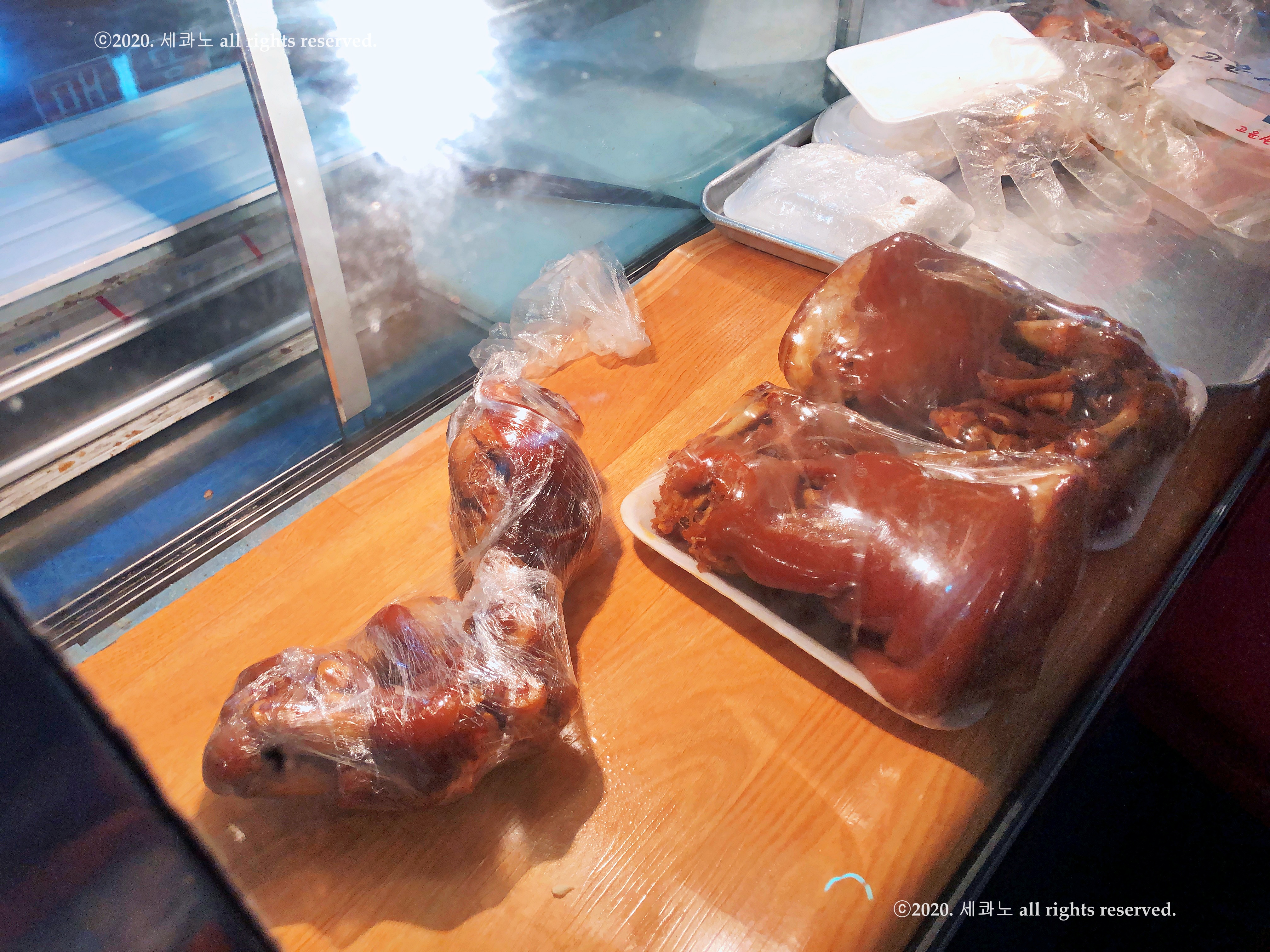 가게 입구 진열대에 족발이 진열되어 있었고