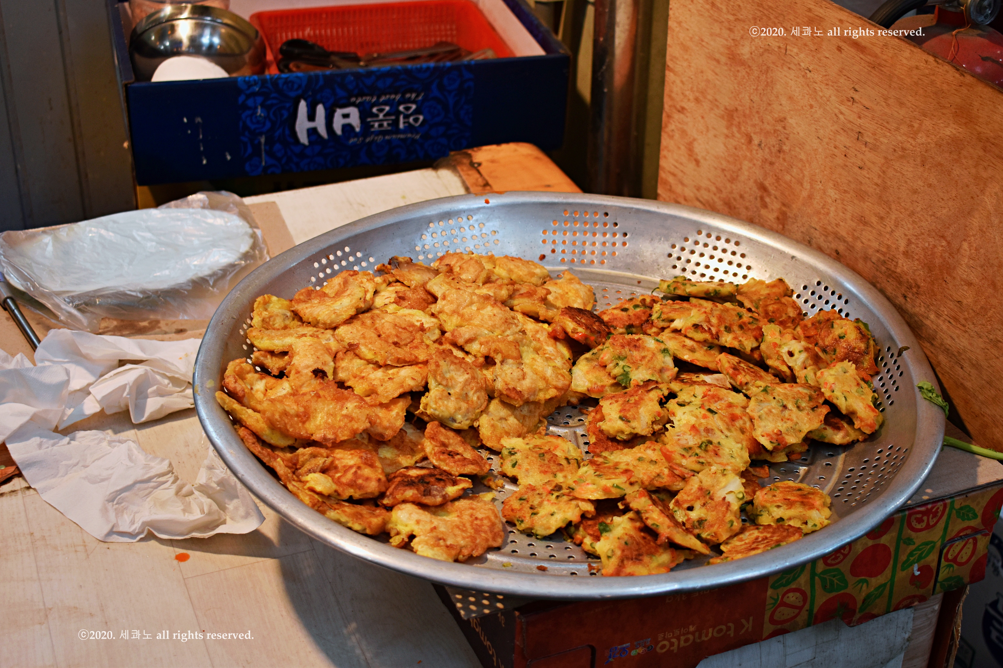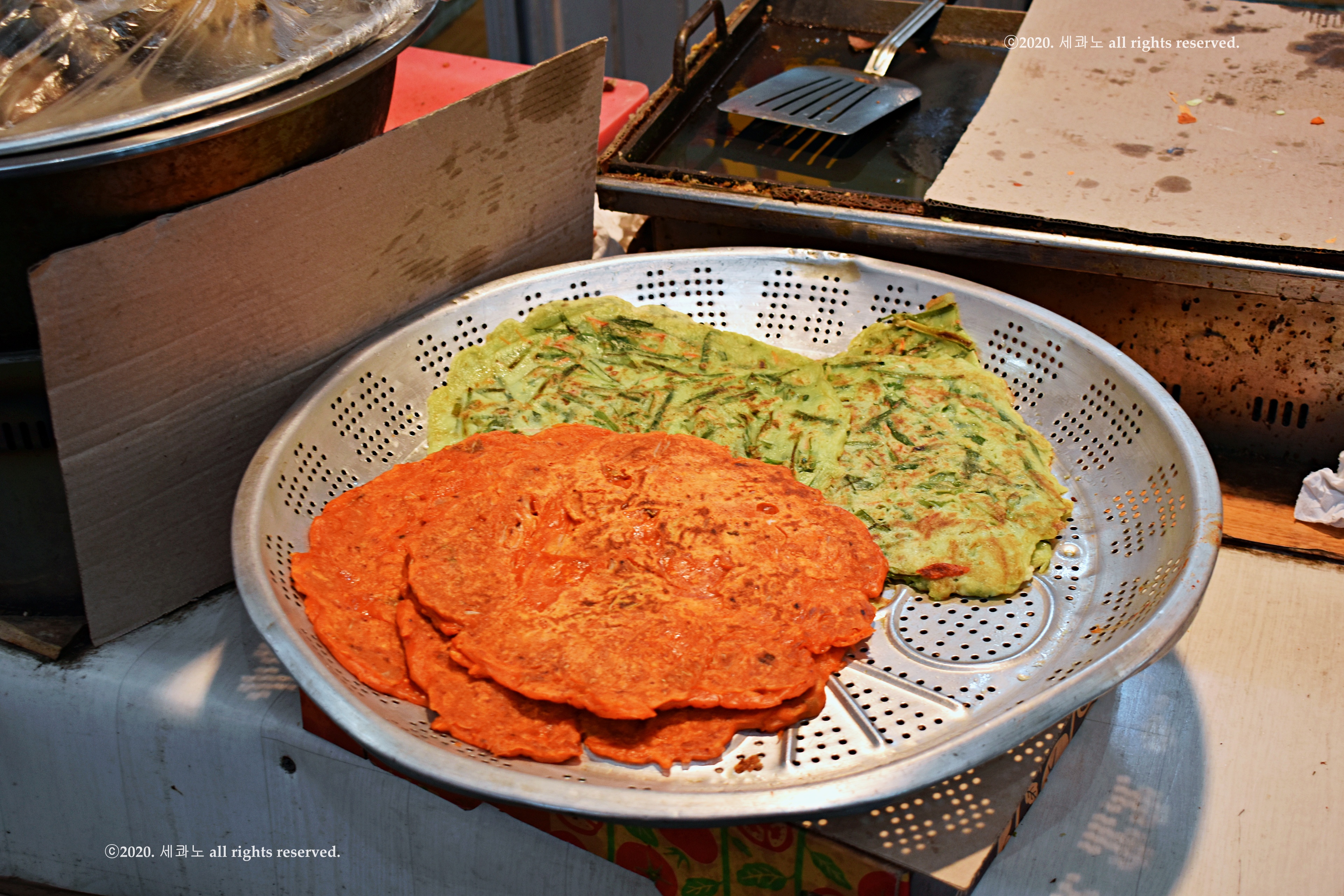 가게 입구에는 순대와 전 등이 진열되어 있었다.