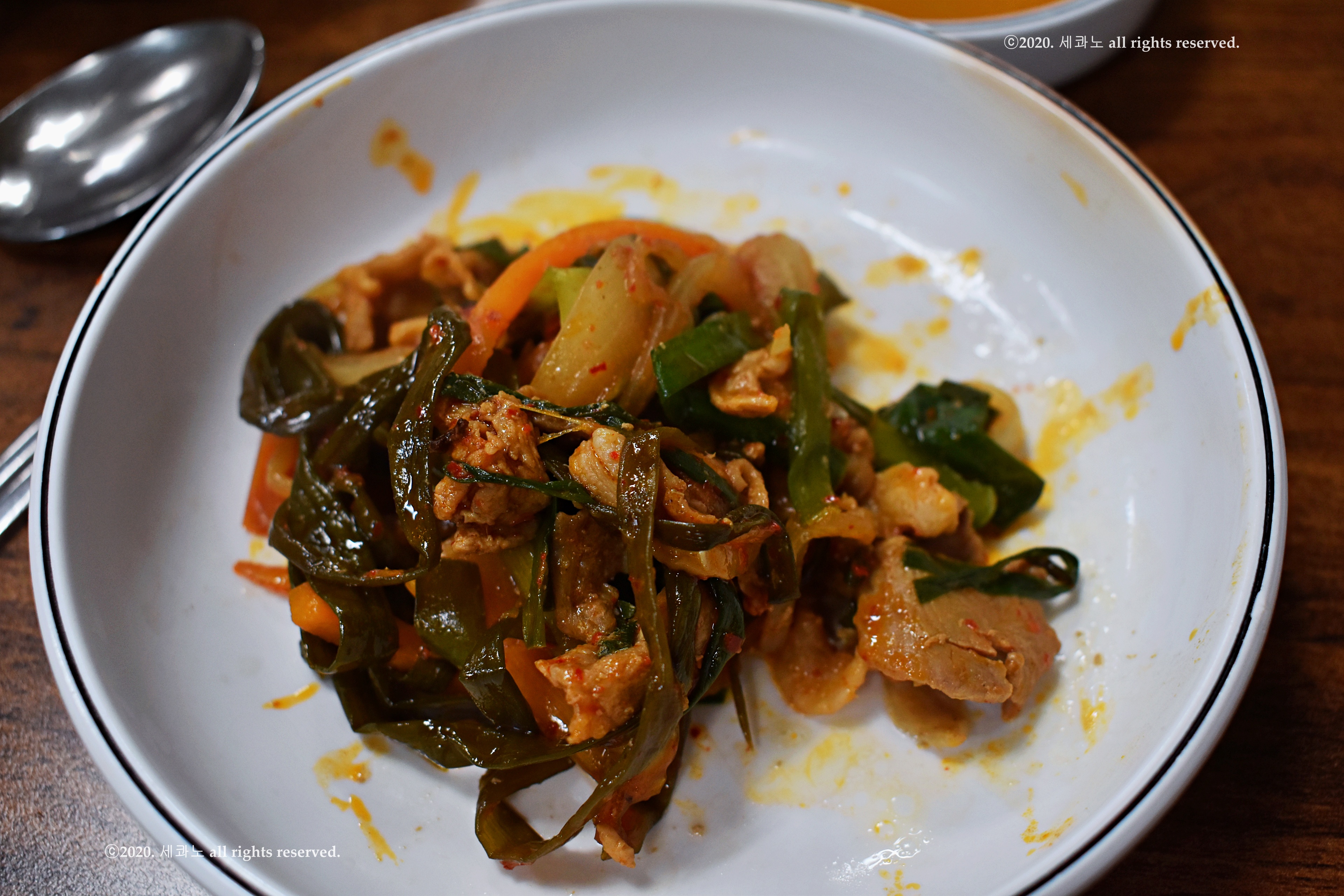 테이블에 있는 파 김치를 불판 위에 올려 같이 볶았고