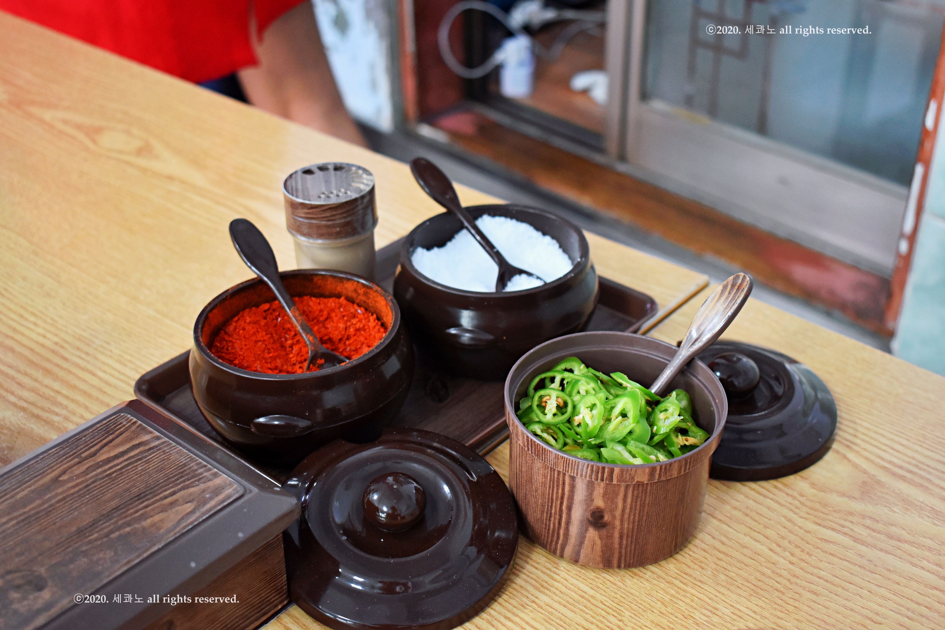 테이블에는 고춧가루, 후추, 소금, 채썬 고추가 있었고