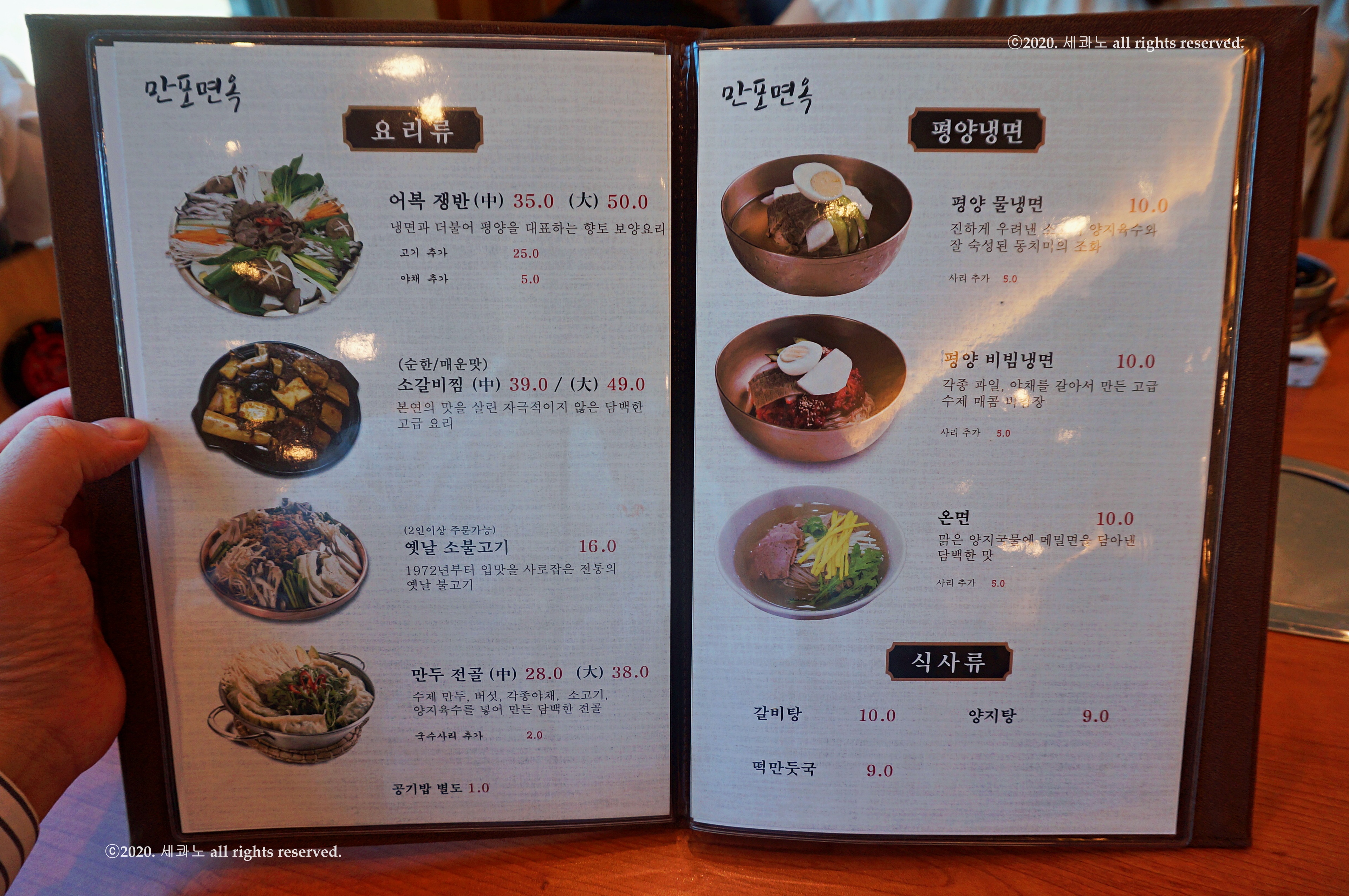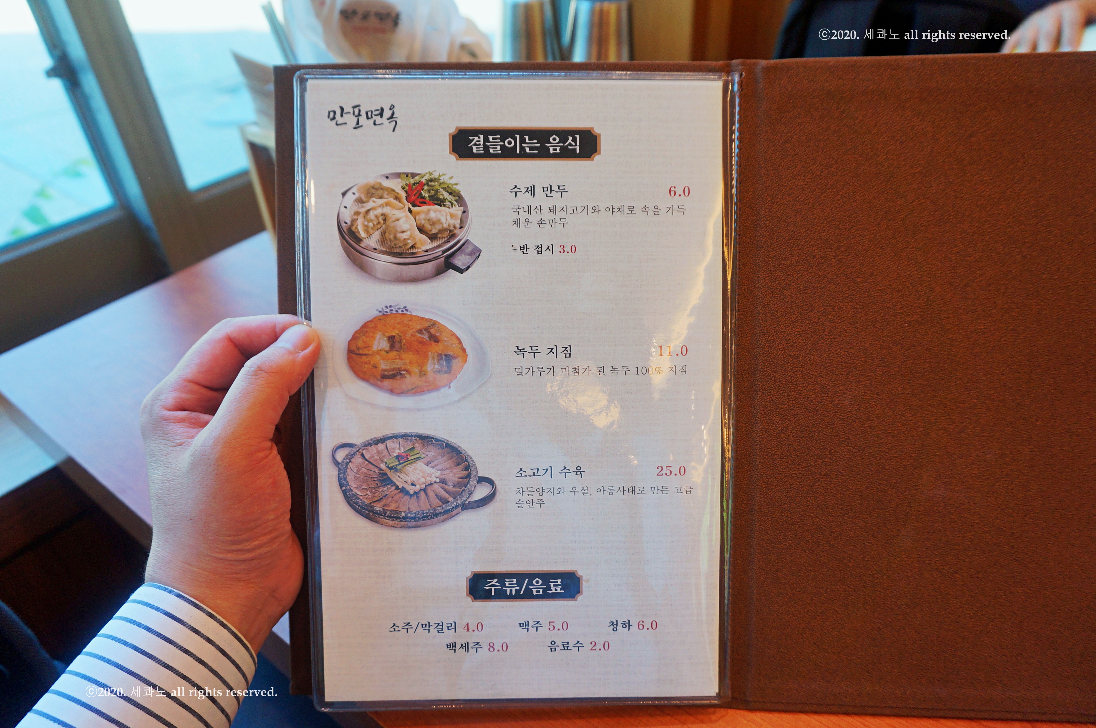 지금 2020년 7월 기준 만포면옥 메뉴 및 가격