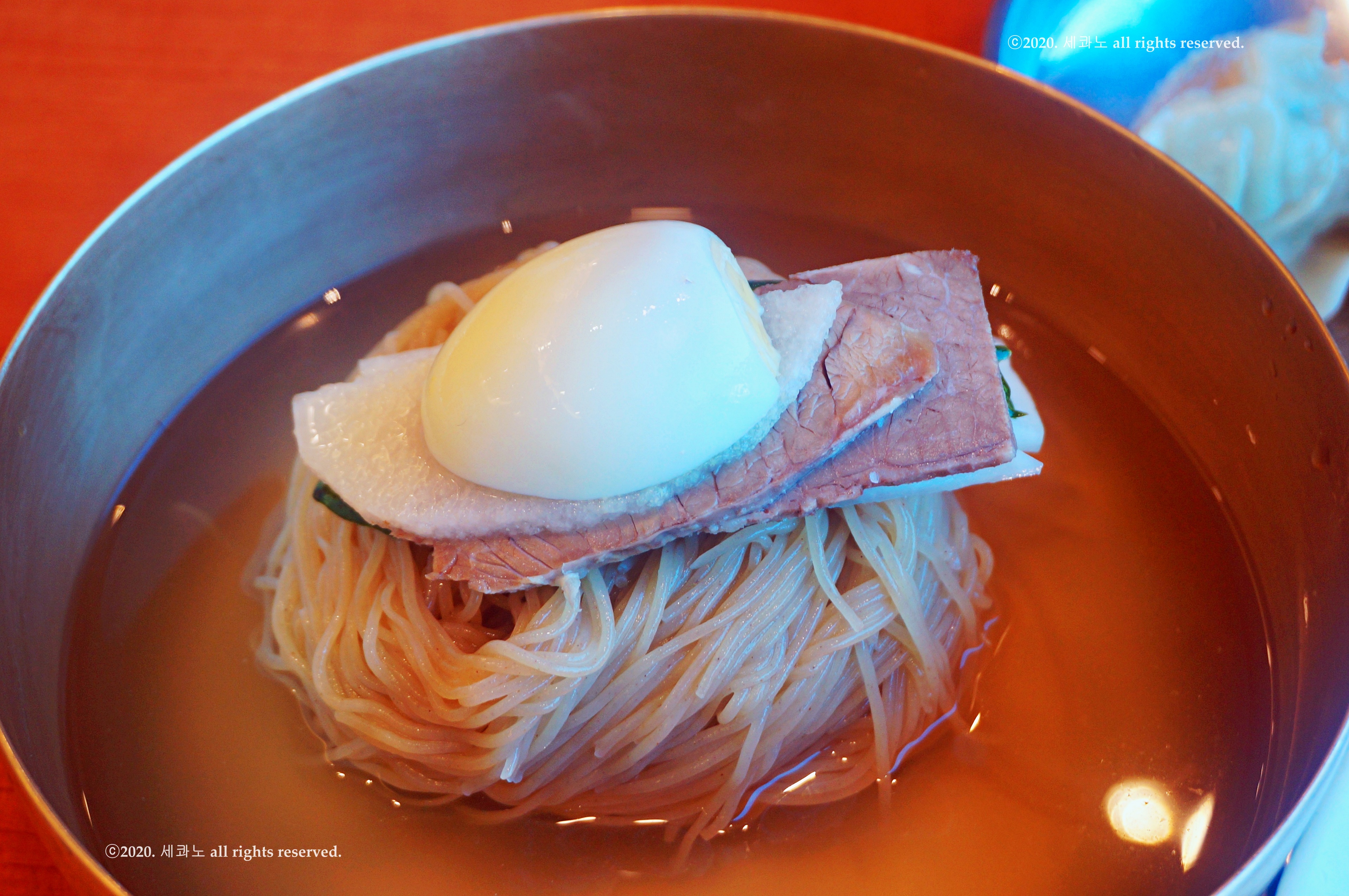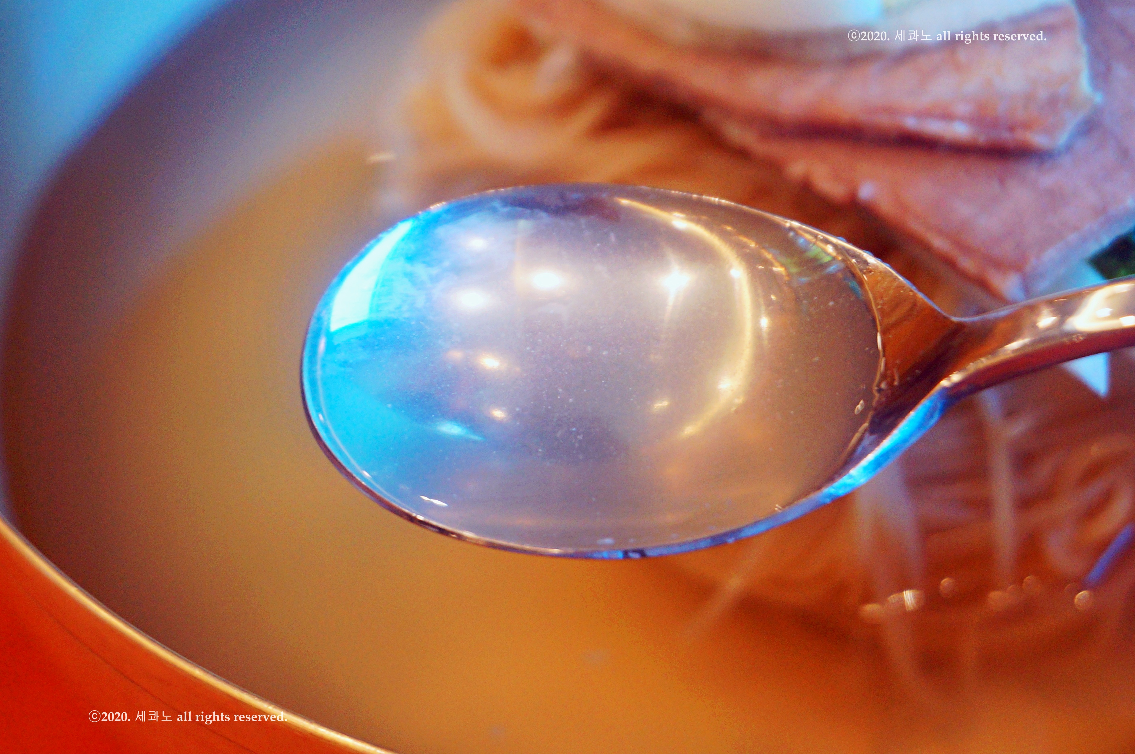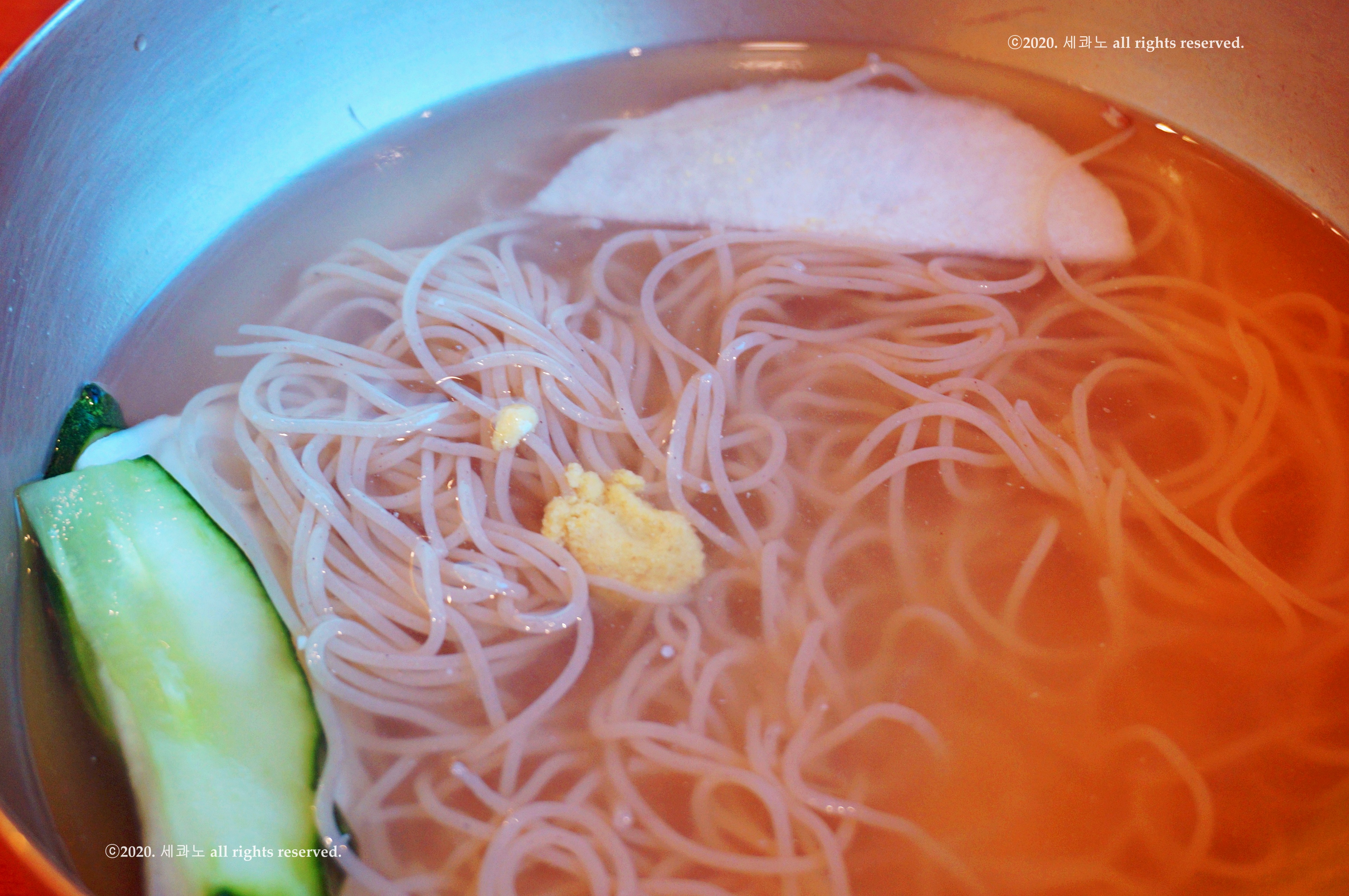 만포면옥 평양냉면은 잘 숙성된 동치미 국물과 소고기 양지 육수로 만들어,