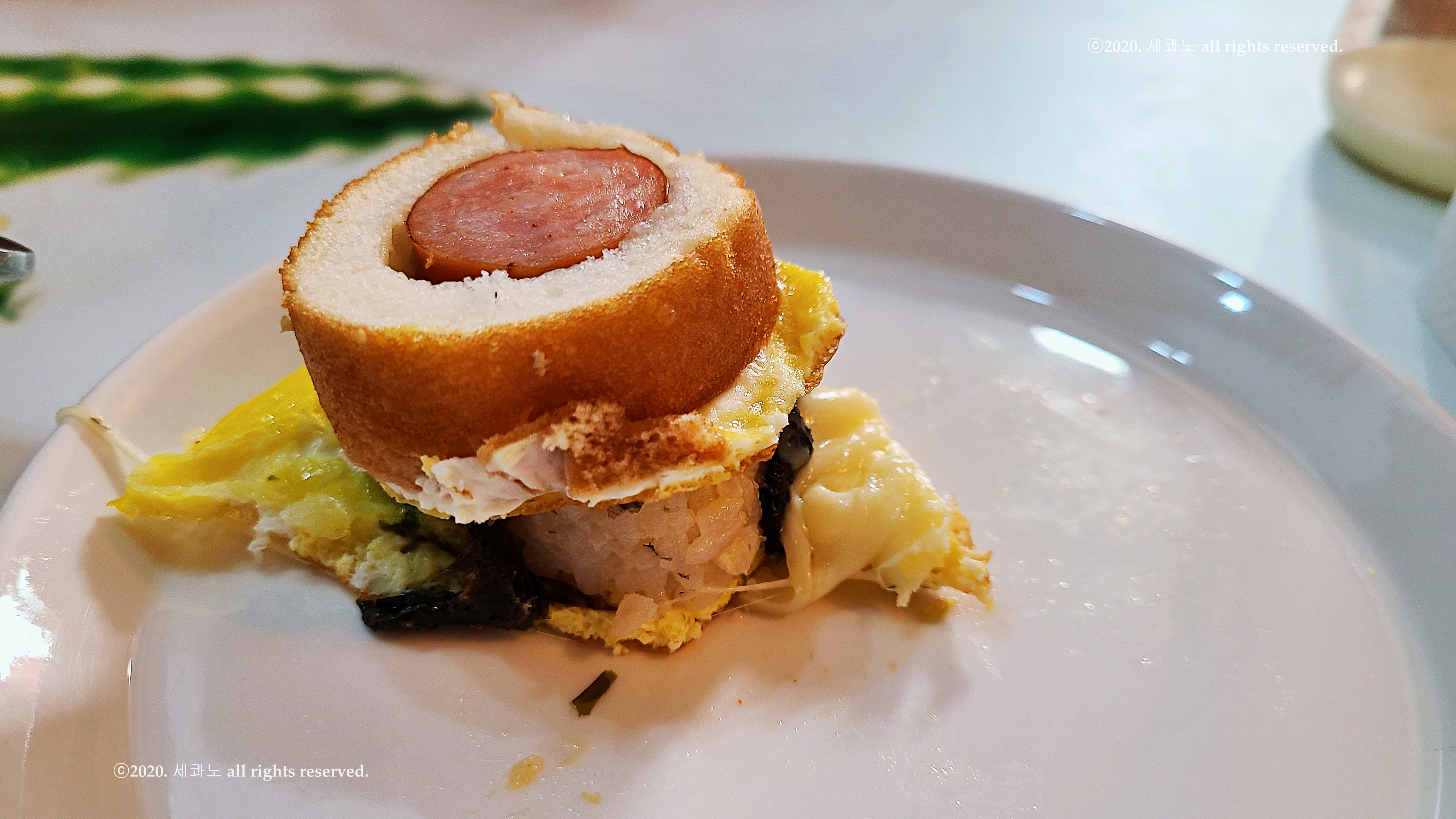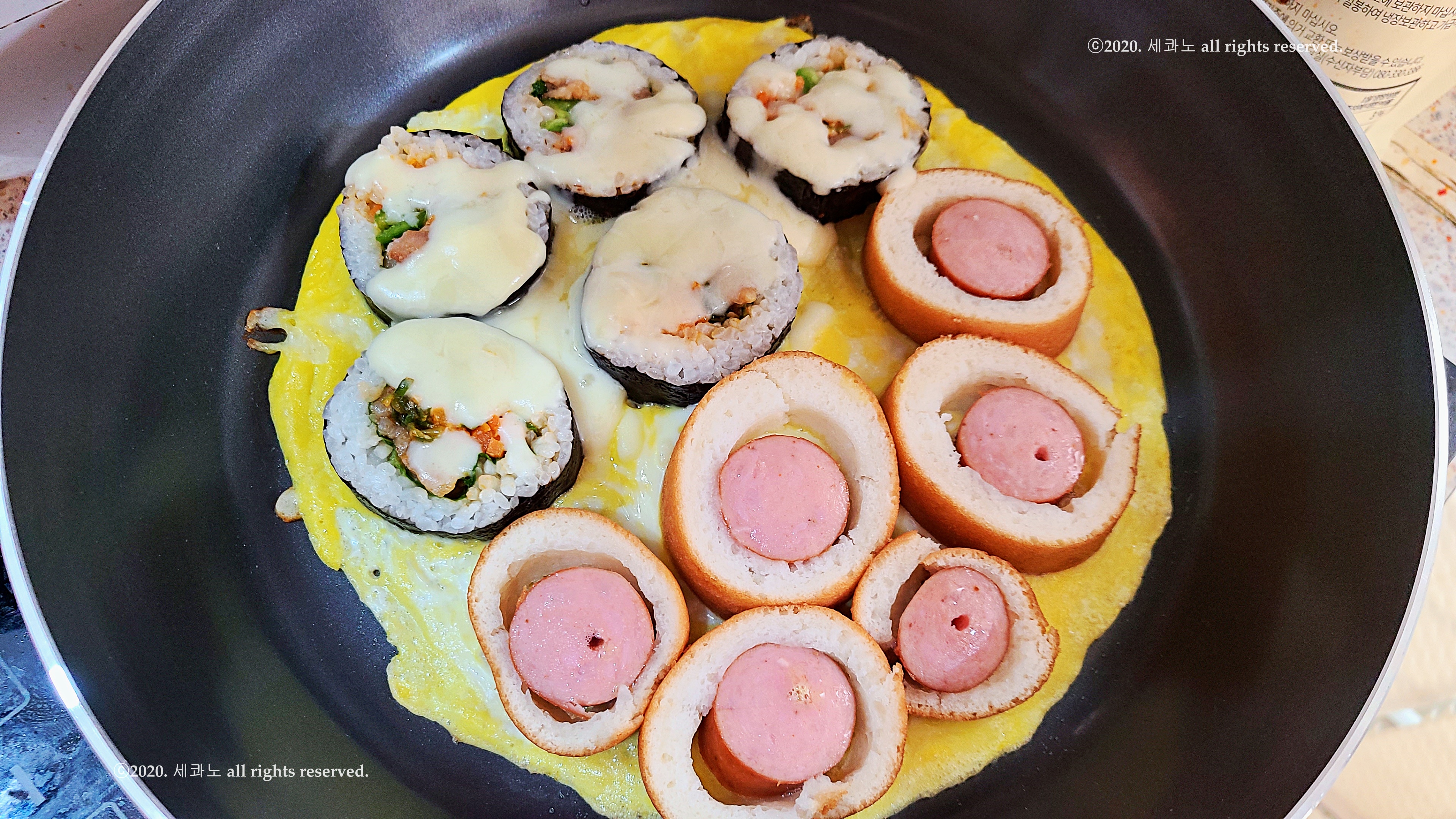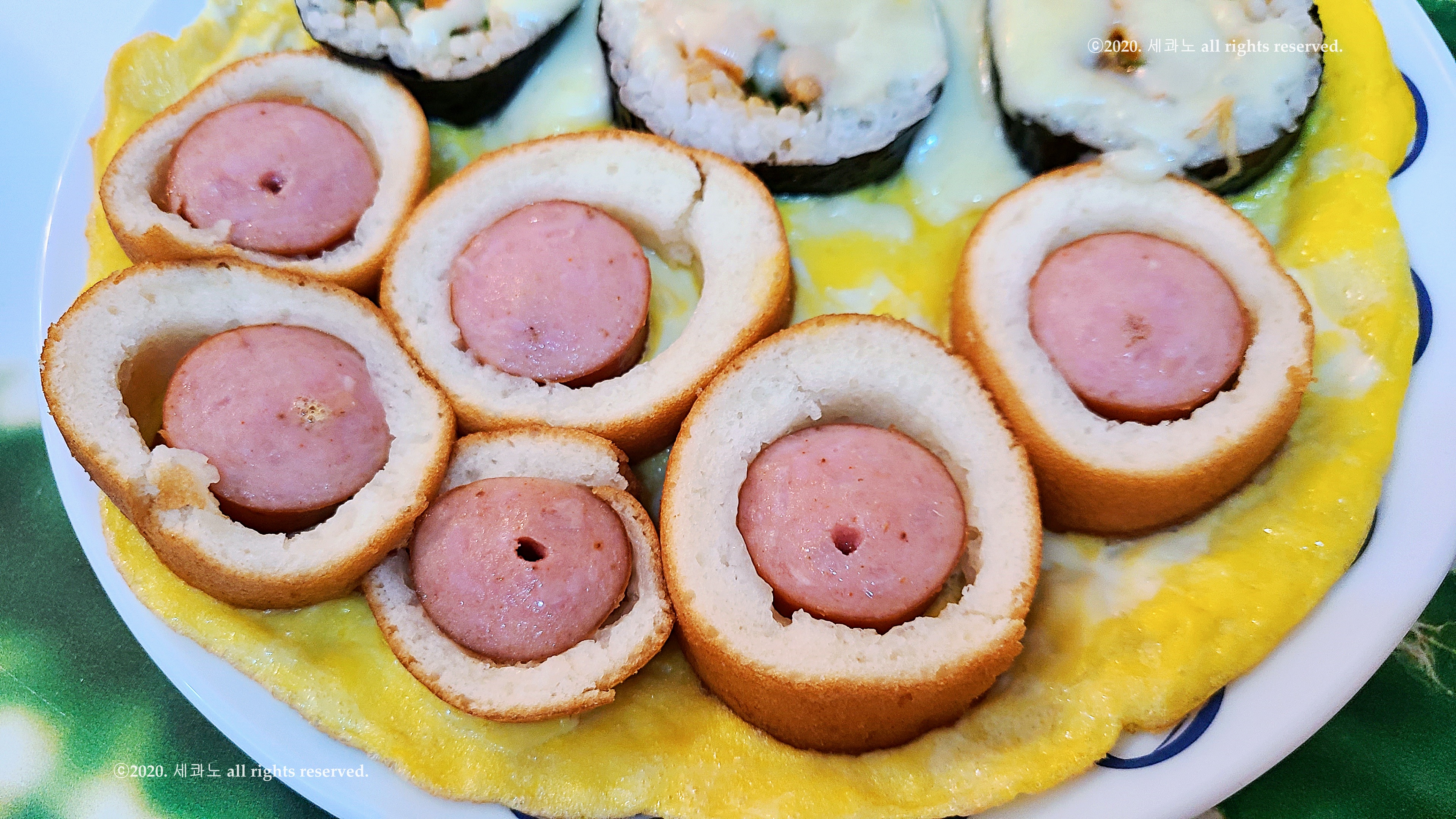 절반은 김밥, 다른 절반은 핫도그가 올라간