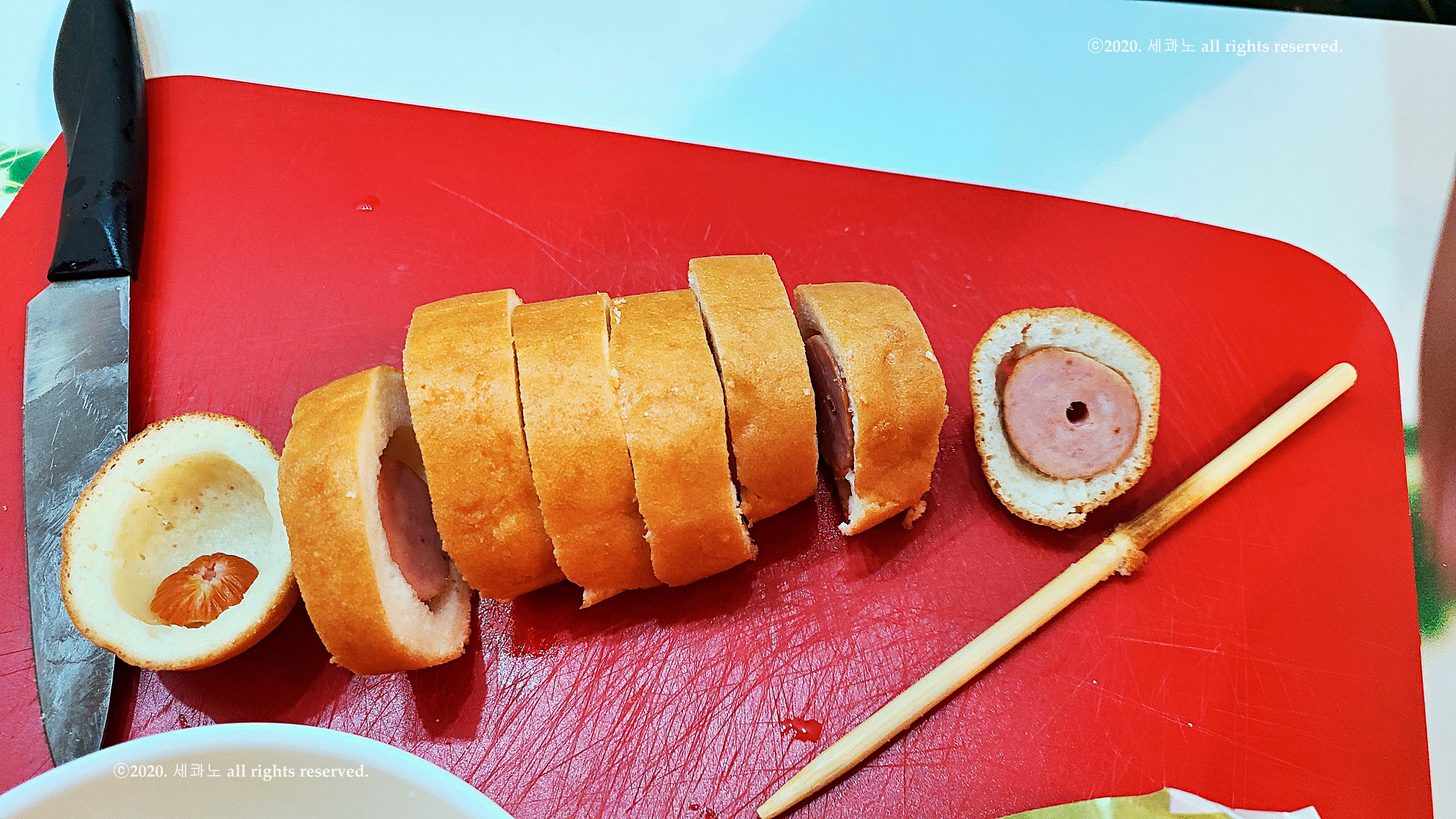 절반은 김밥, 다른 절반은 핫도그가 올라간