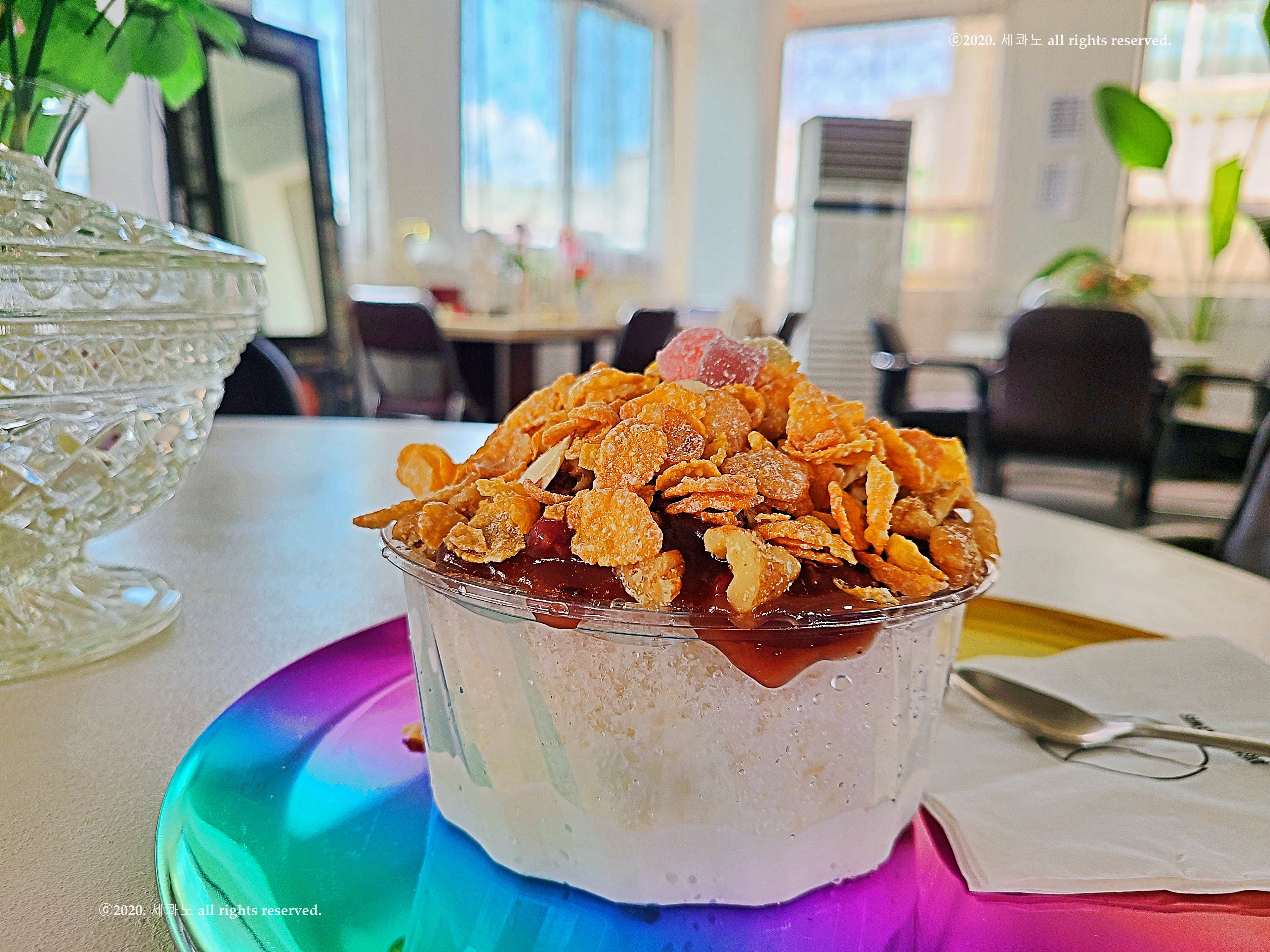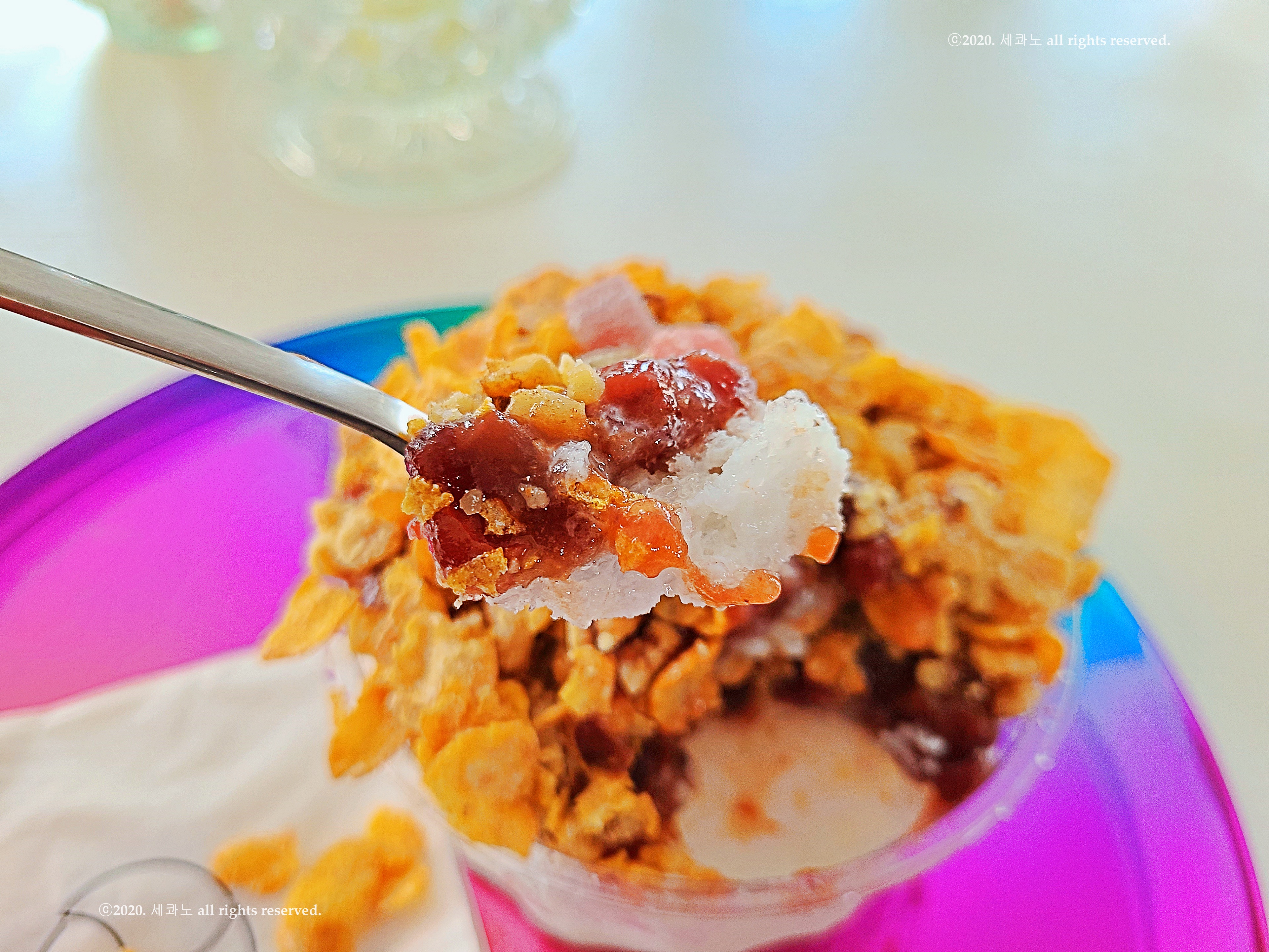 거친 얼음가루에 우유? 연유? 좀 뿌려져 있고