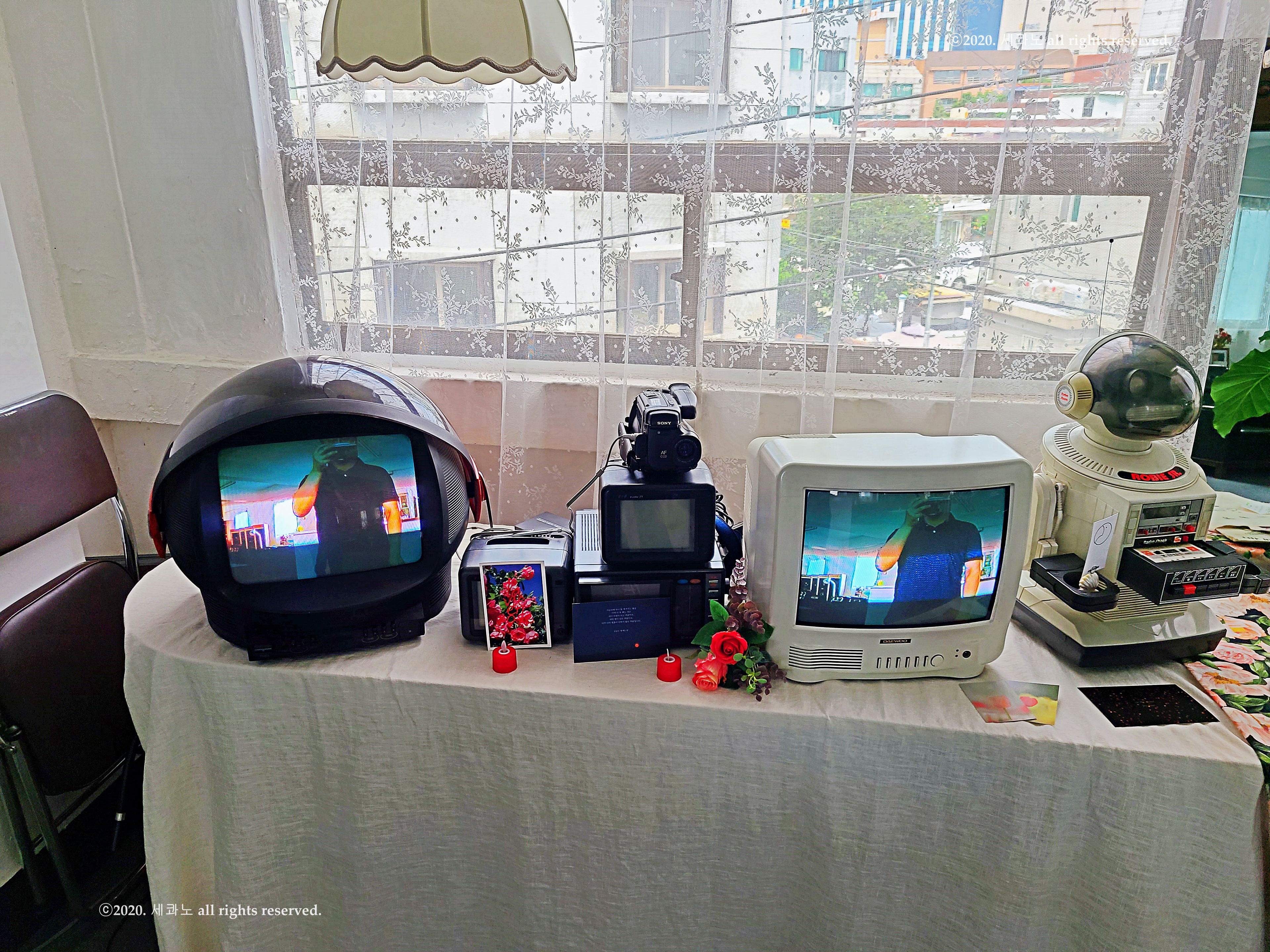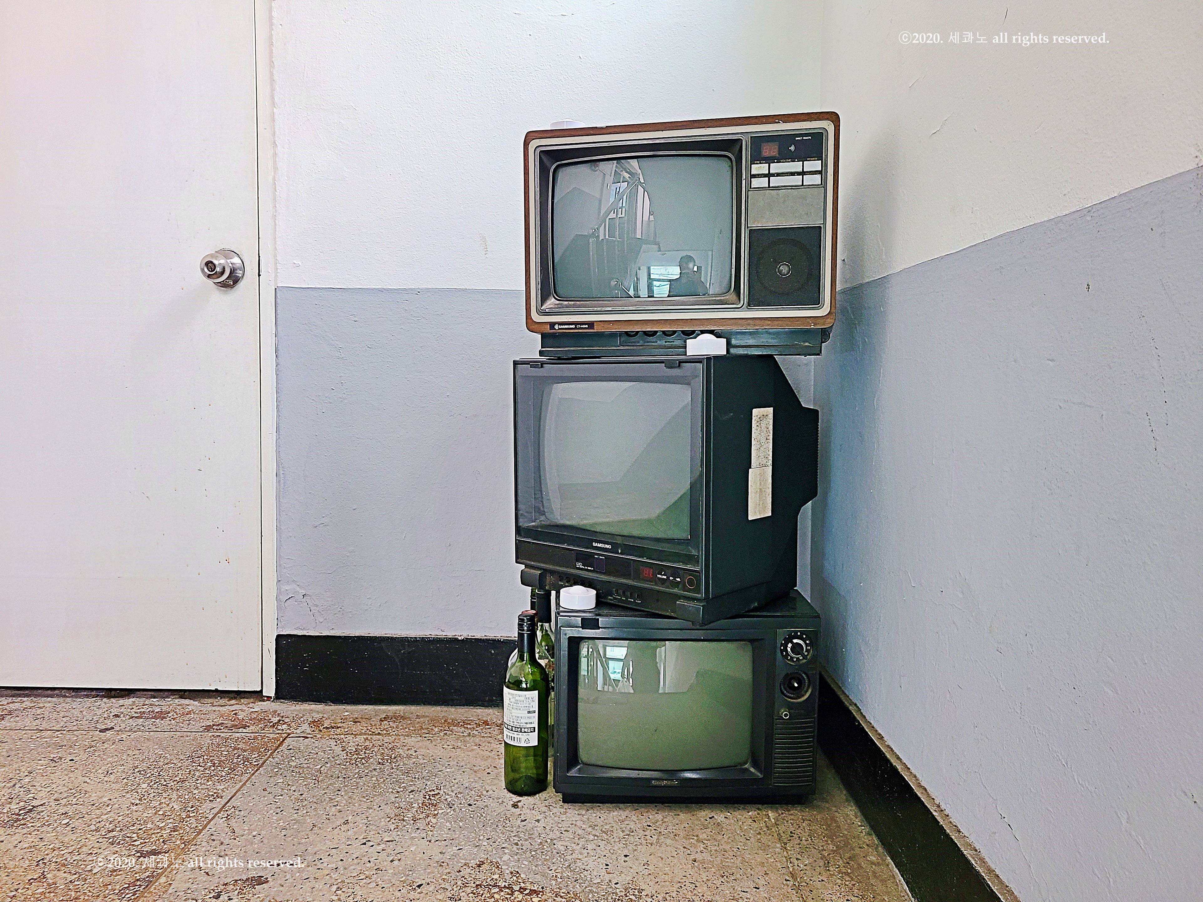 옛날 브라운관 텔레비전이 쌓여 있는 게 보인다.