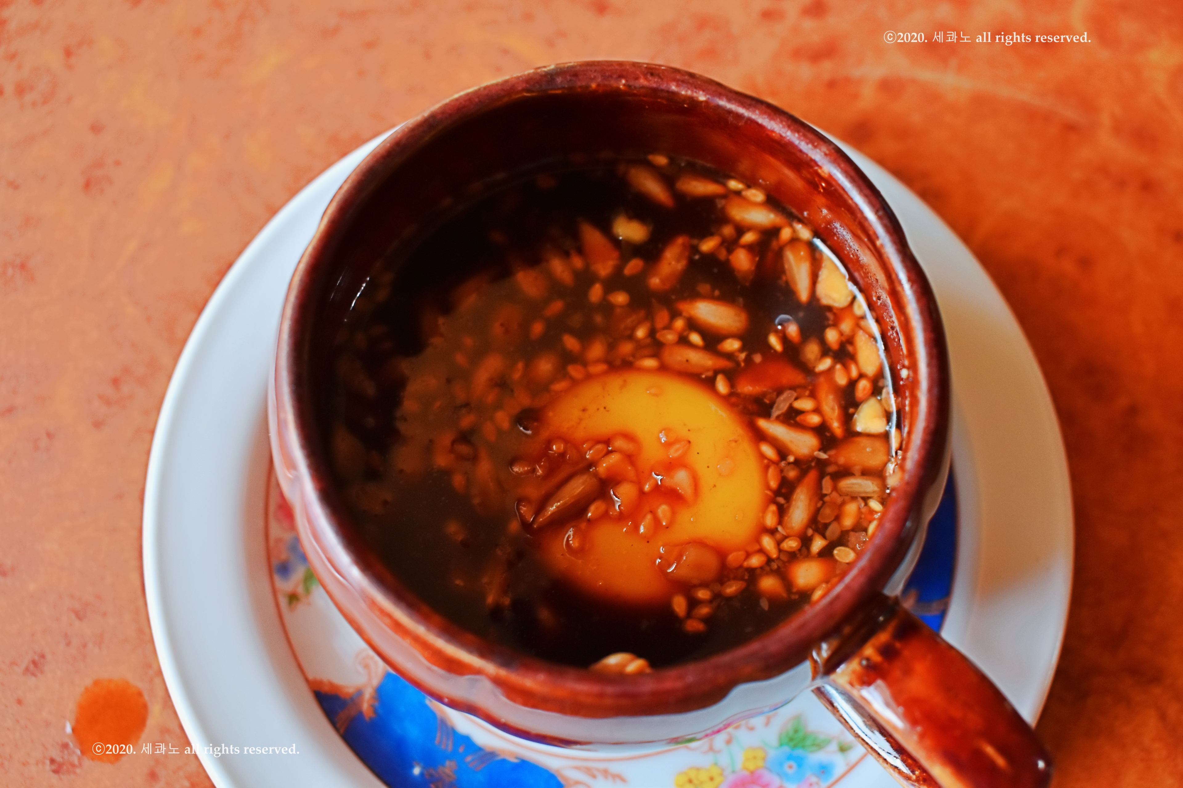 어디서는 티스푼으로 쌍화차를 계란 위에 계속 부어주어