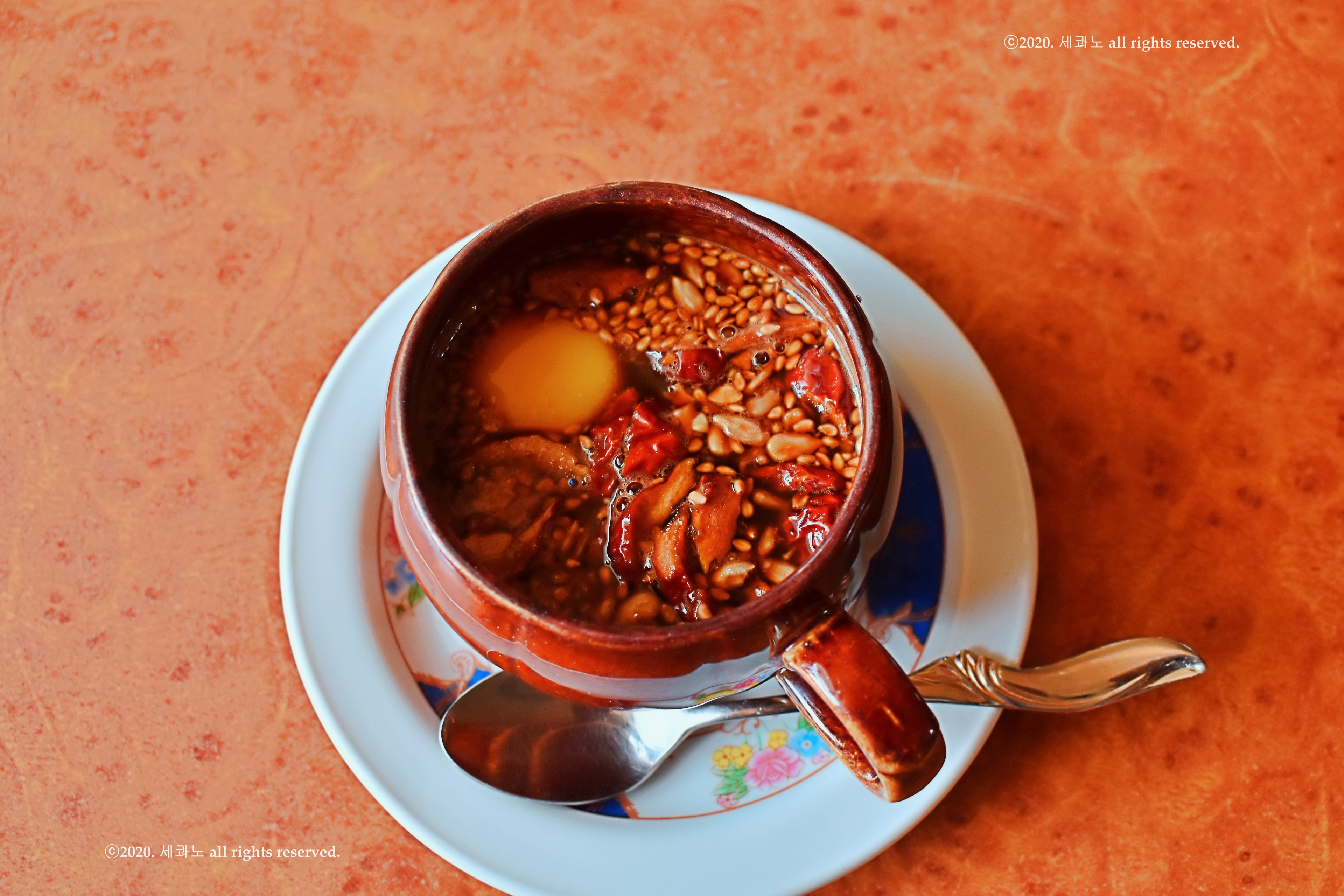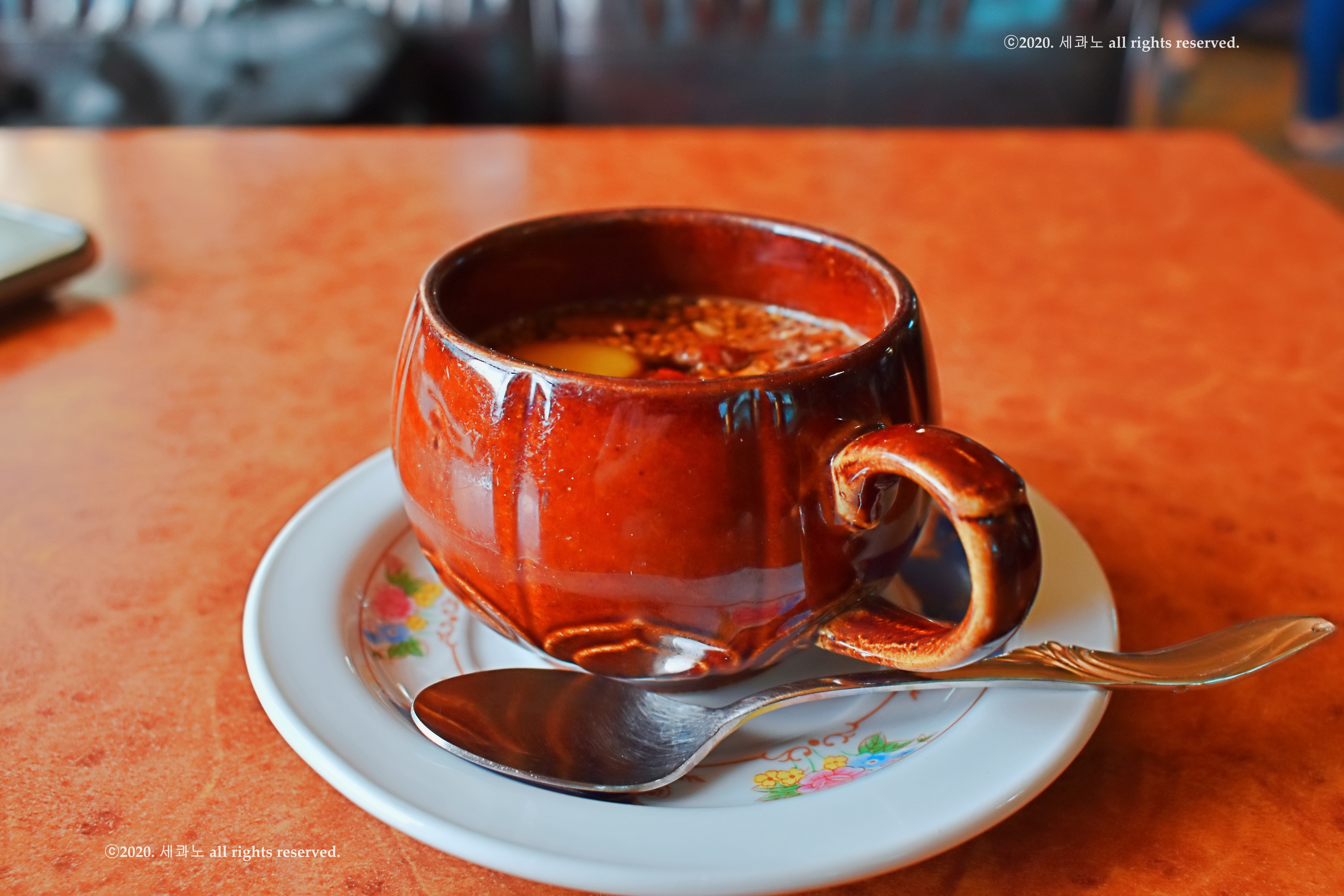 어디서는 티스푼으로 쌍화차를 계란 위에 계속 부어주어