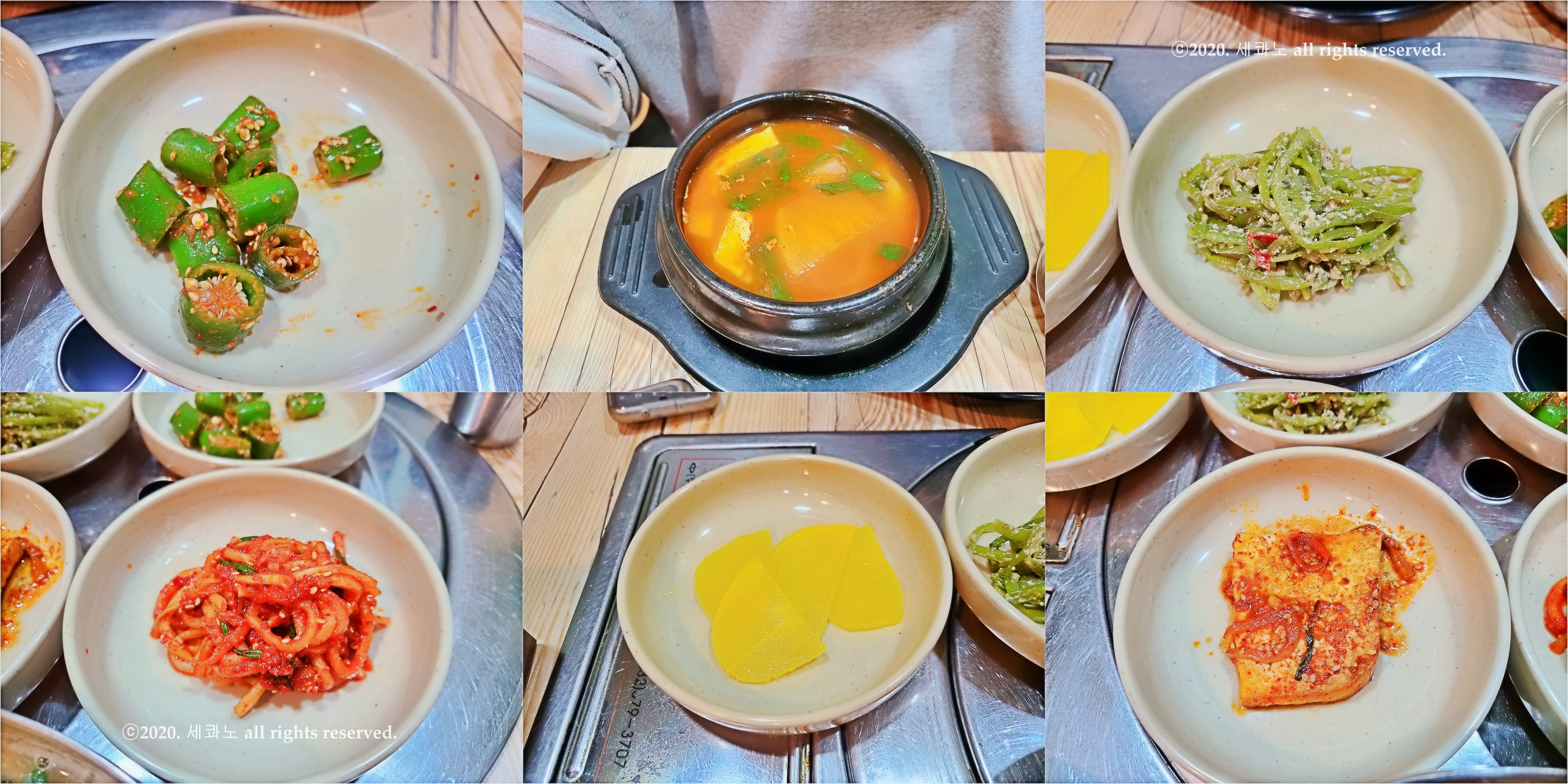 고추 된장 무침, 고구마순 무침, 채장아치, 단무지, 두부조림이 나왔다.