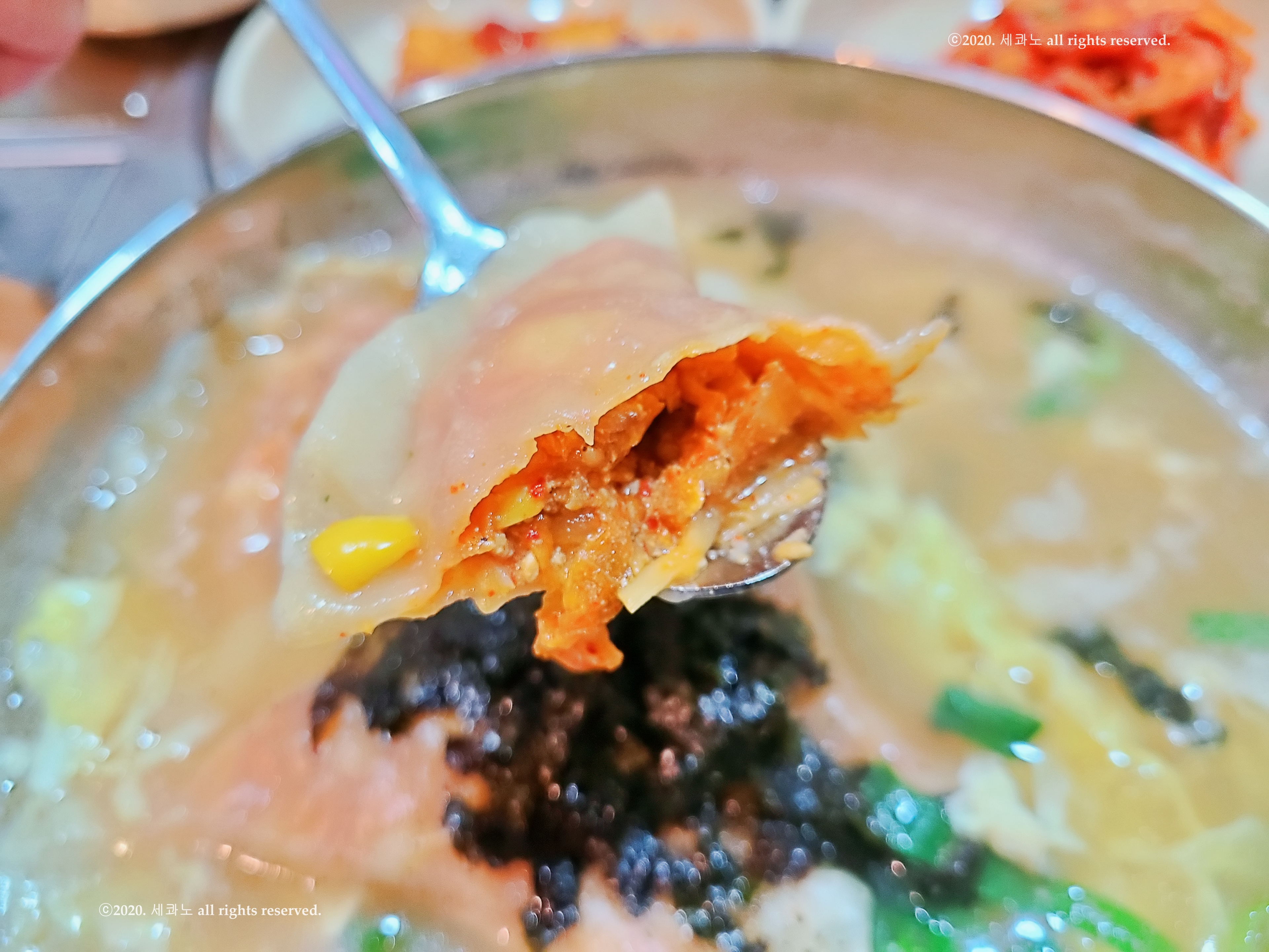 만둣국에 김치만두, 김치 손만두가 들어가 있는데