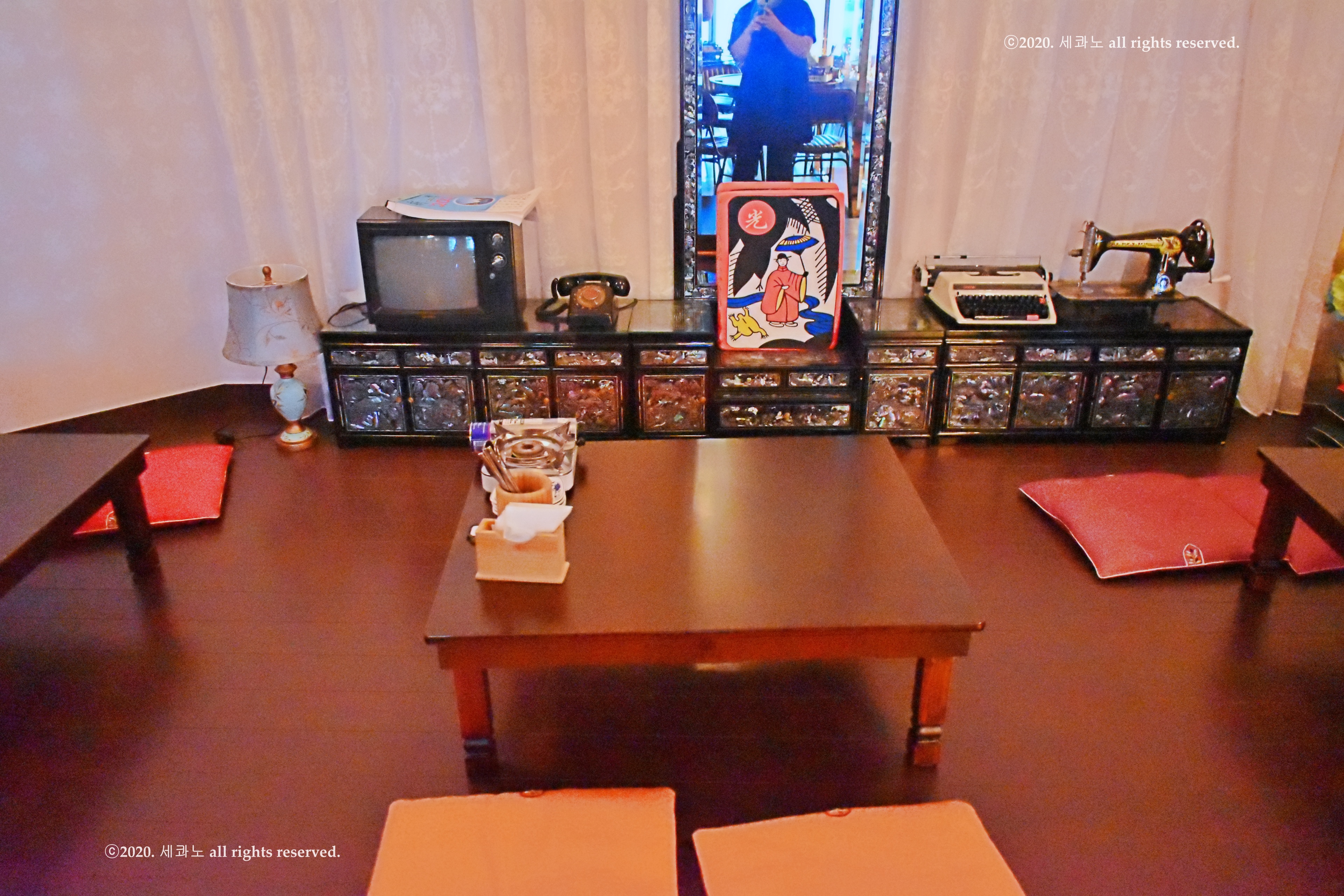 뒤의 자개장부터 그 위의 타자기나 오래된 텔레비전과 전화기