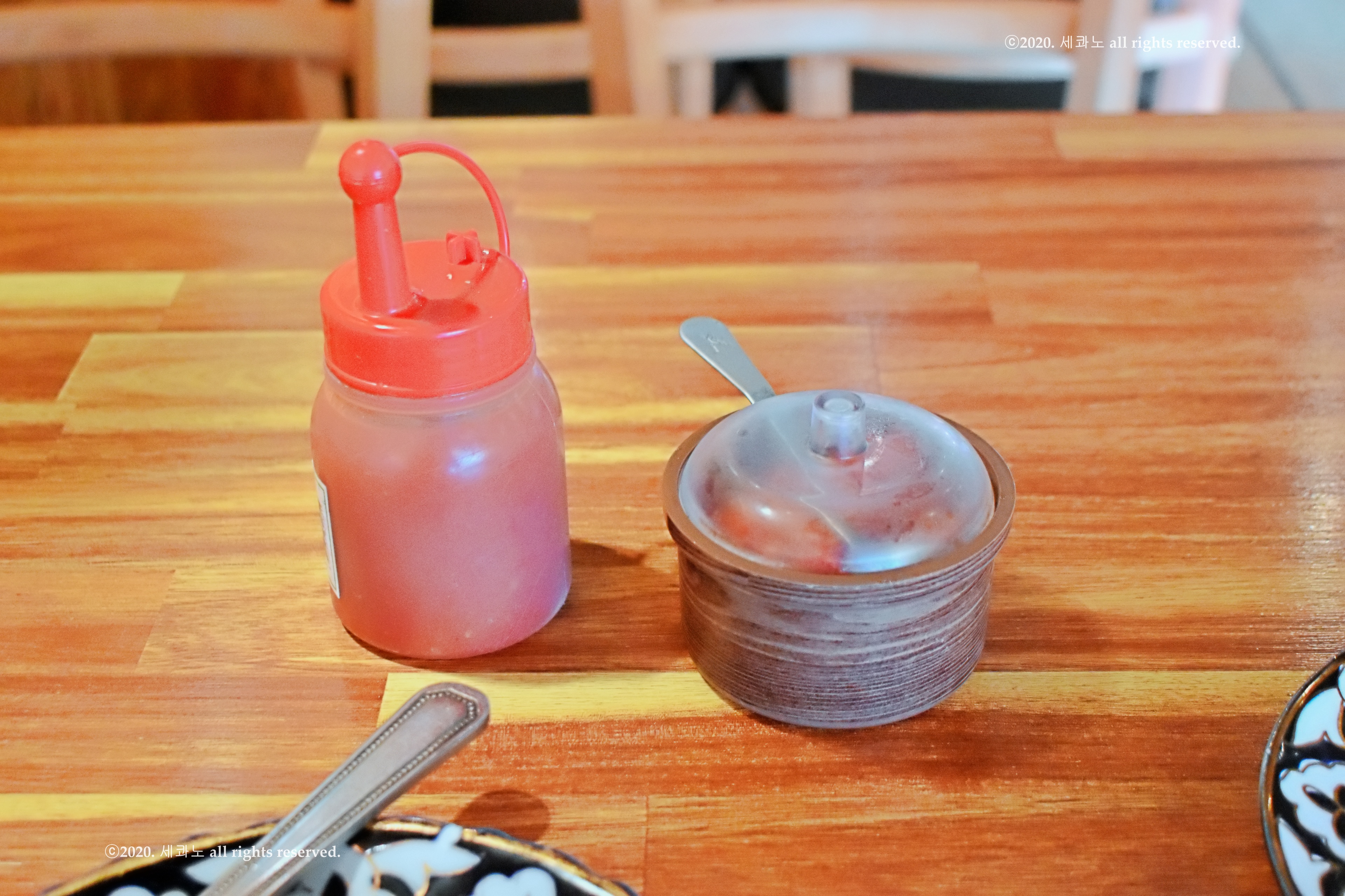 좌측은 원래부터 테이블에 있던 매운 소스고