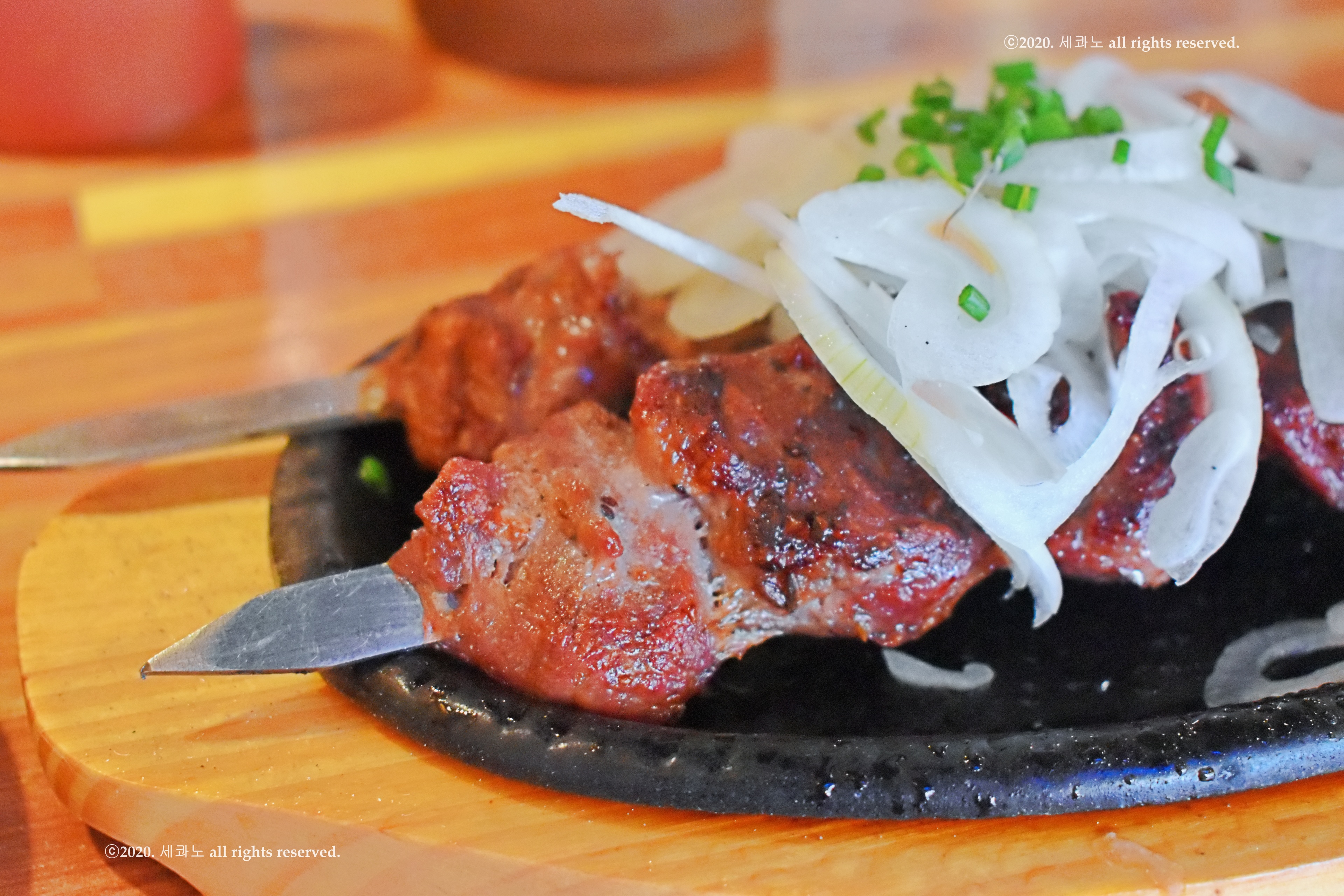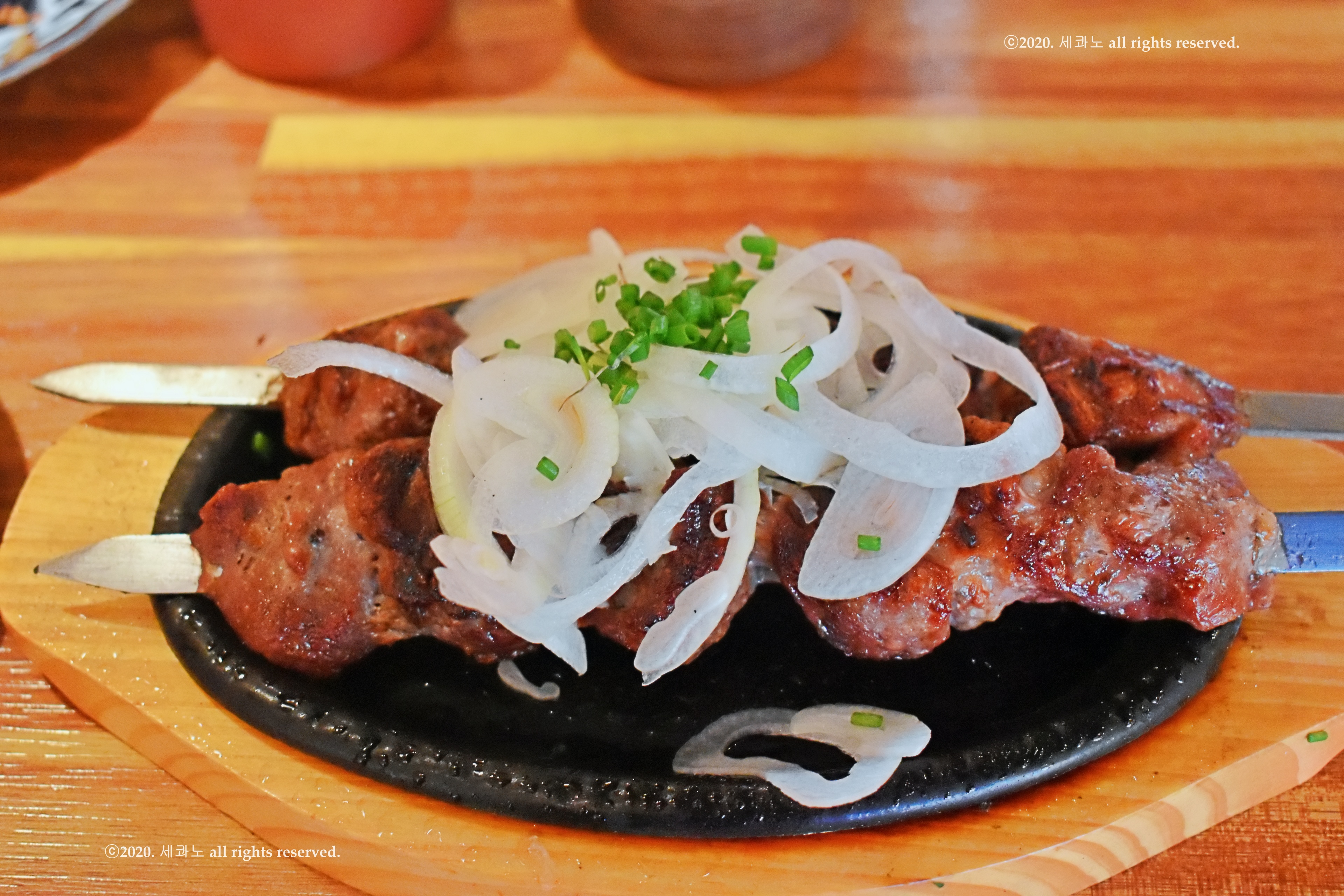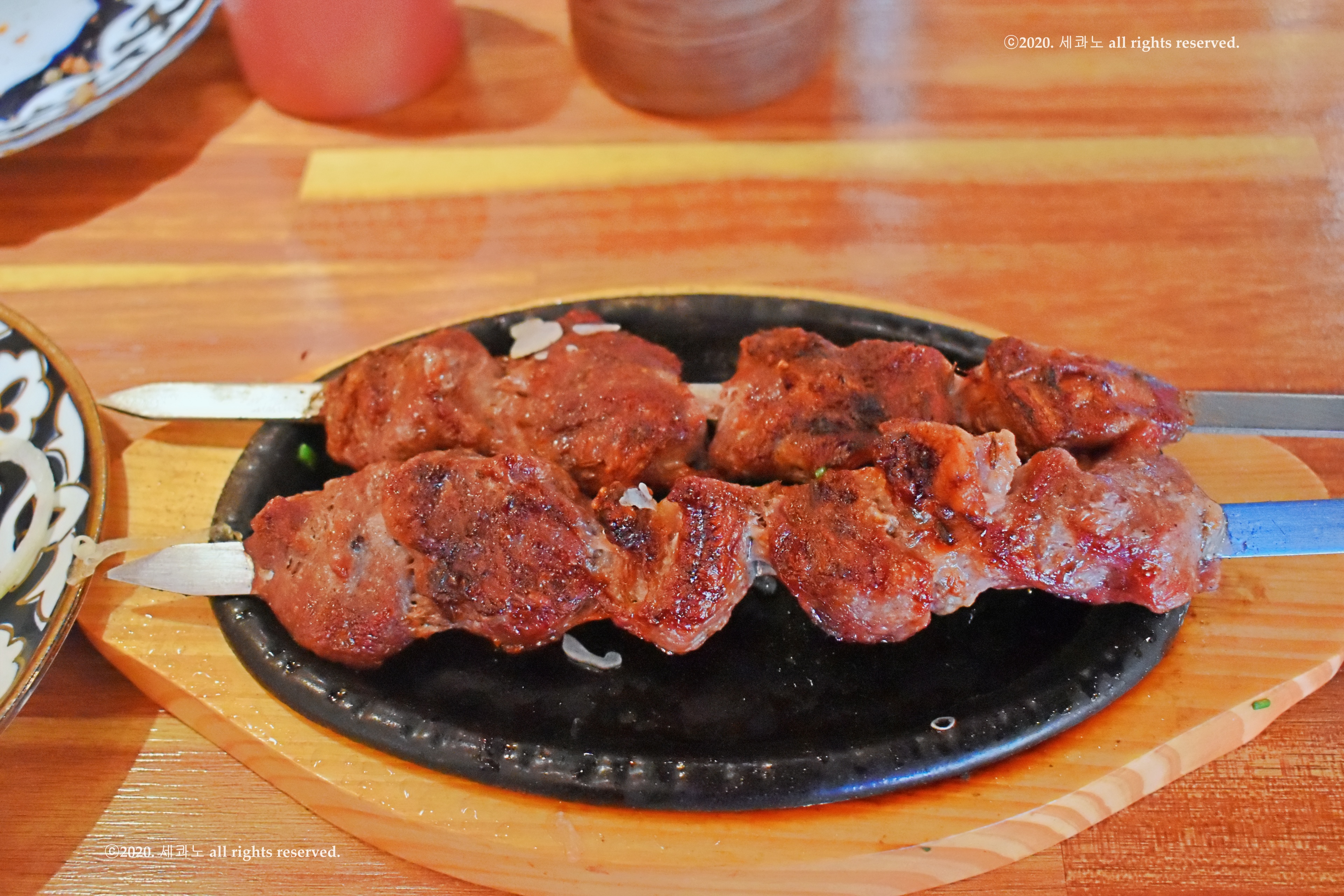 바싹 구워 나온 양고기 꼬치 2개가 그걸 가득 채운다.
