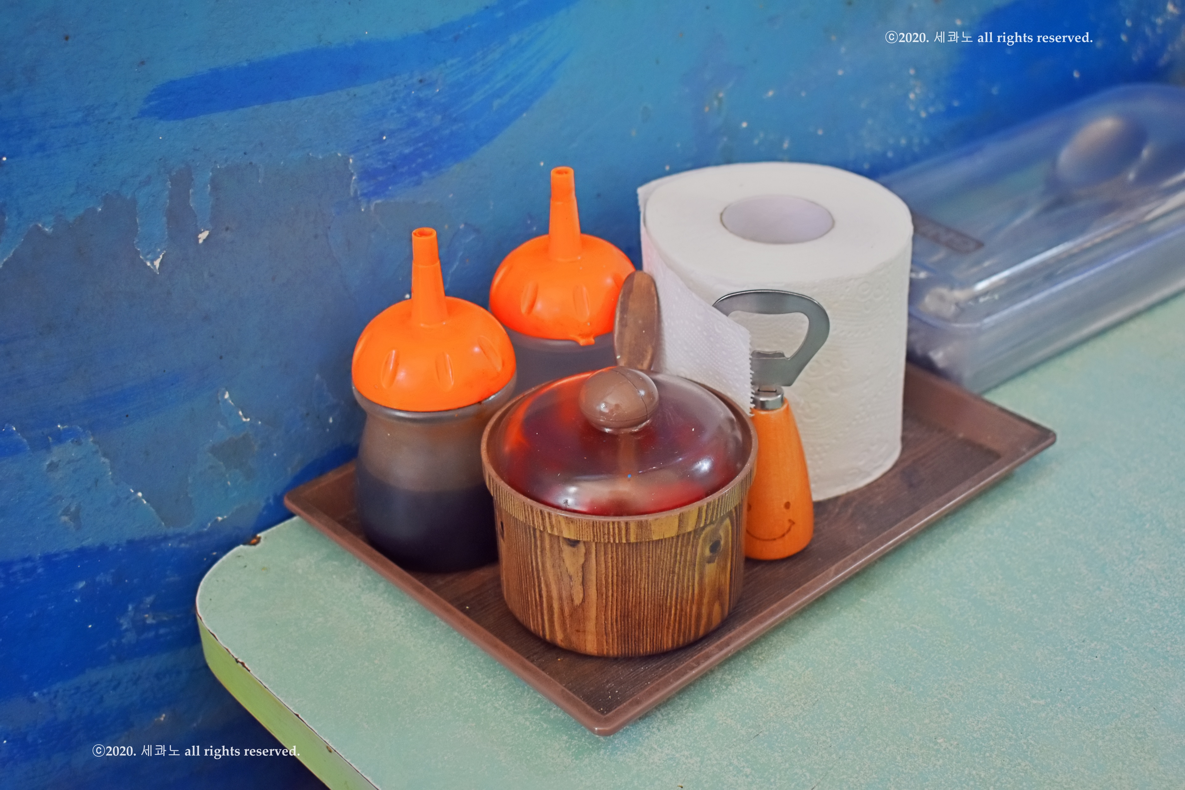 테이블에는 간장, 식초, 고춧가루가 준비되어 있어