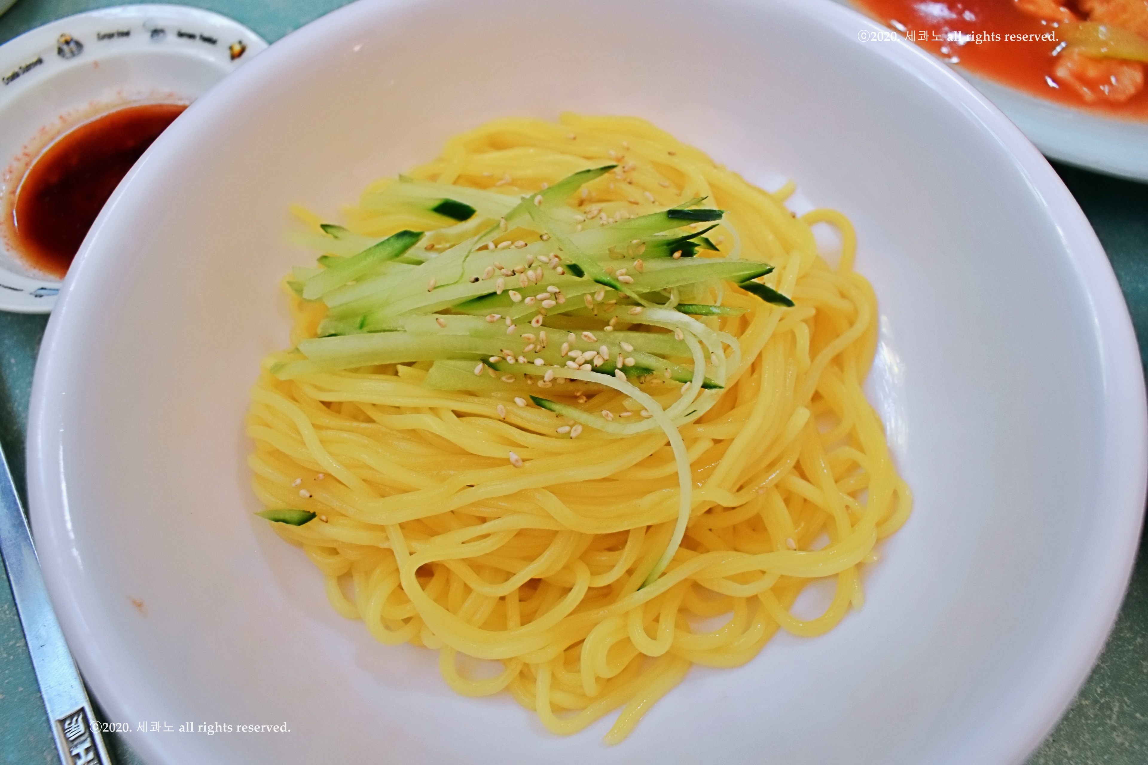 노란색 면 위로 올라간 오이채,