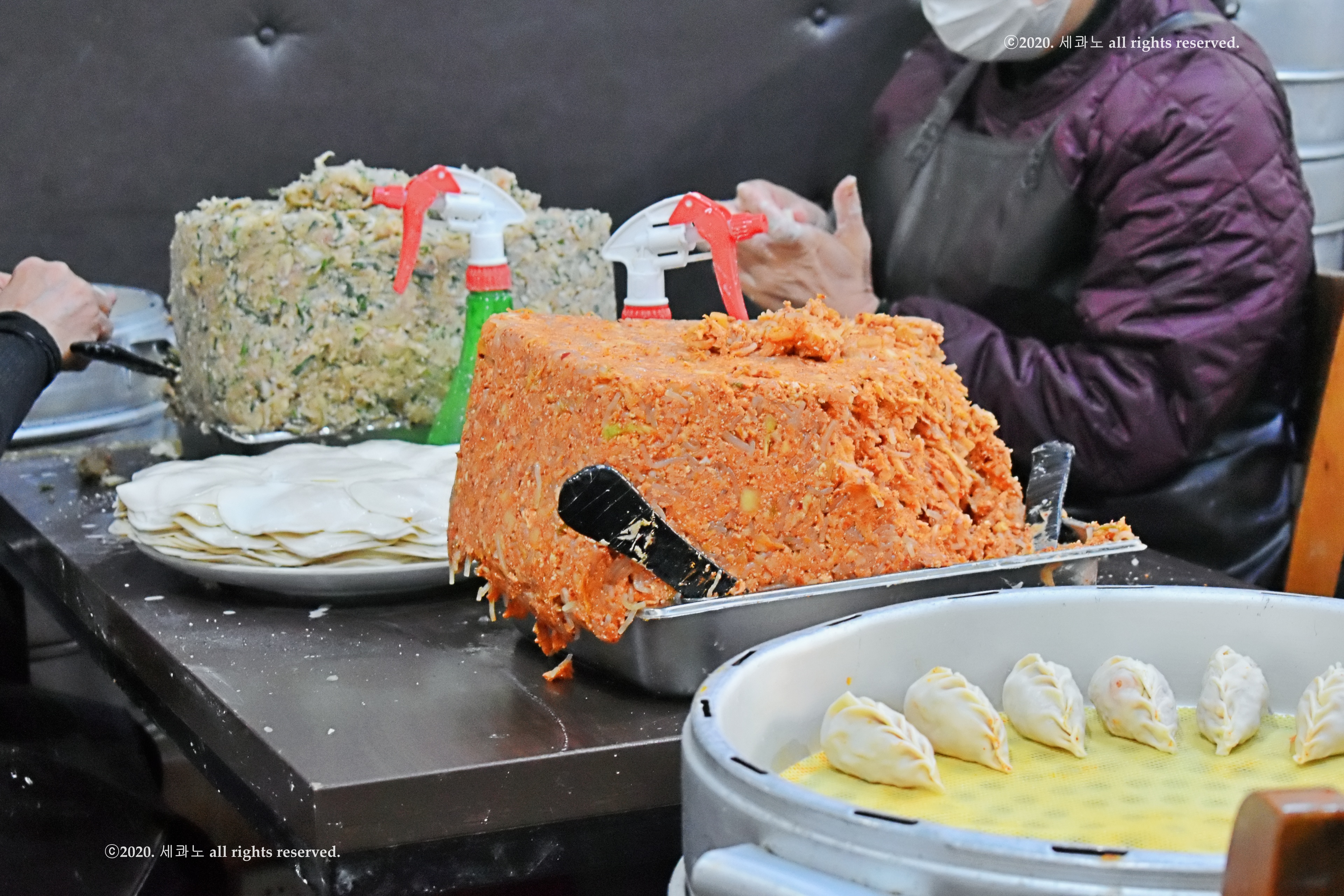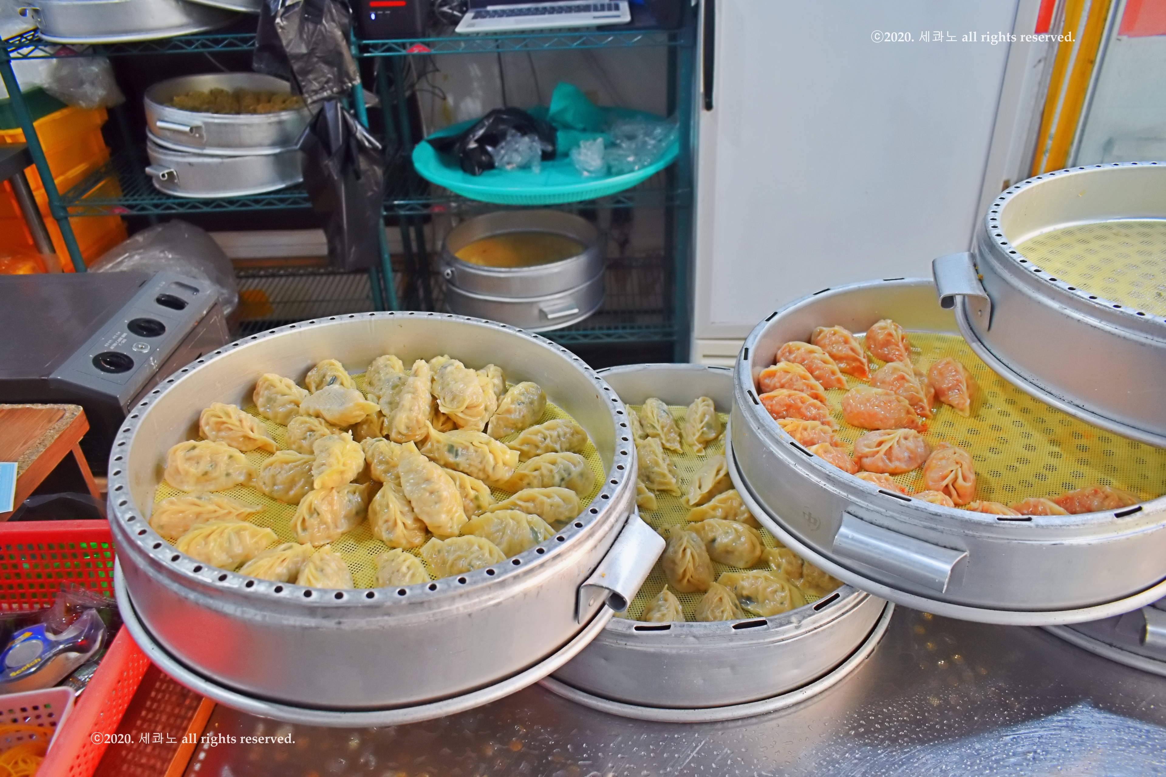 가게 입구에는 한 번 쪄진 고기만두와 김치만두가 보였고