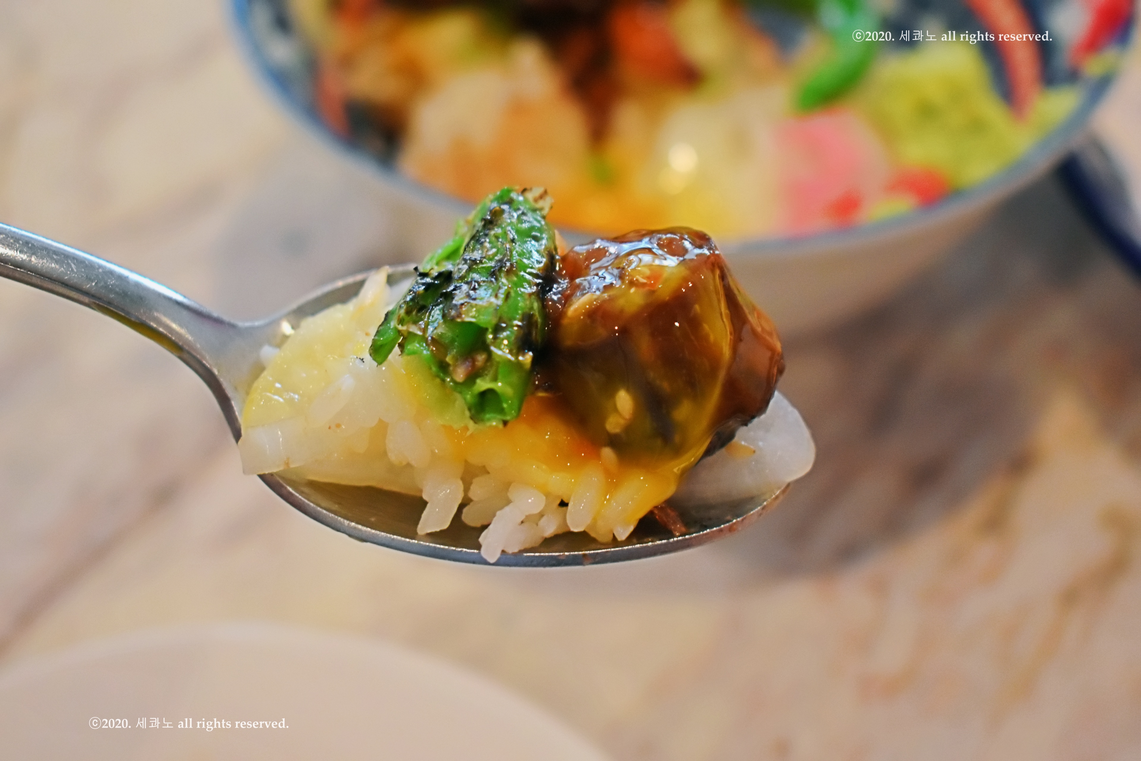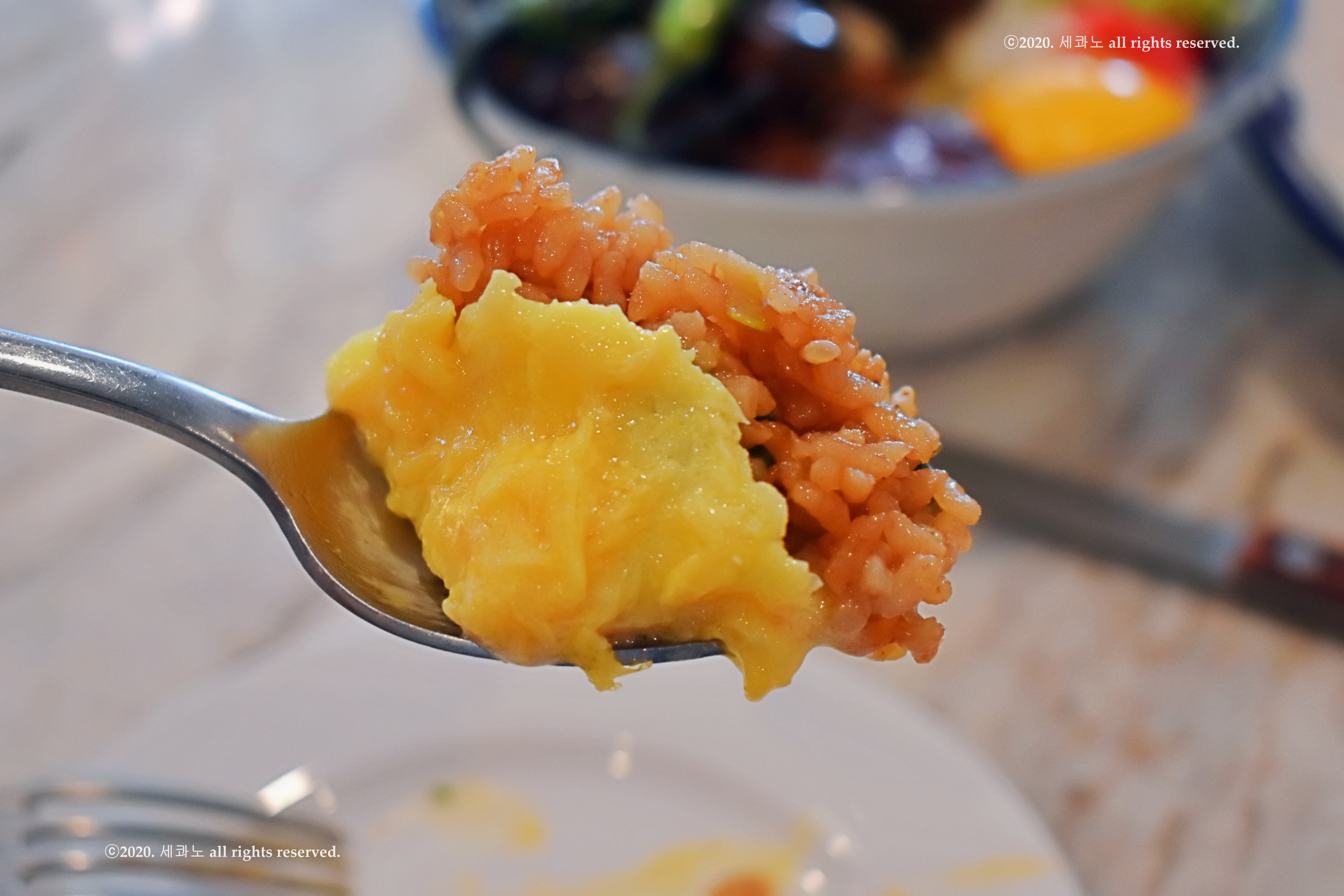 우선 안쪽의 밥 부분만 한 숟가락 떠서 맛을 보았는데..