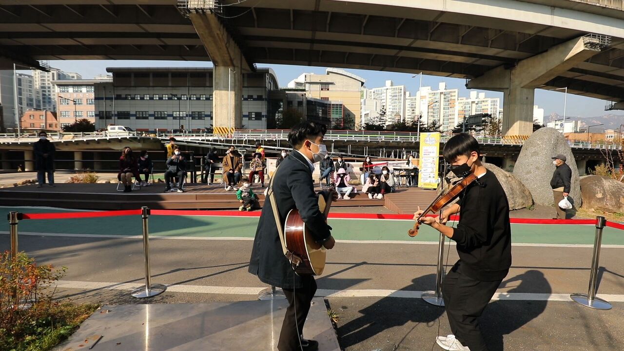 바이올린과 기타 연주를 하고 있는 거리 공연 현장을 마주한다.
