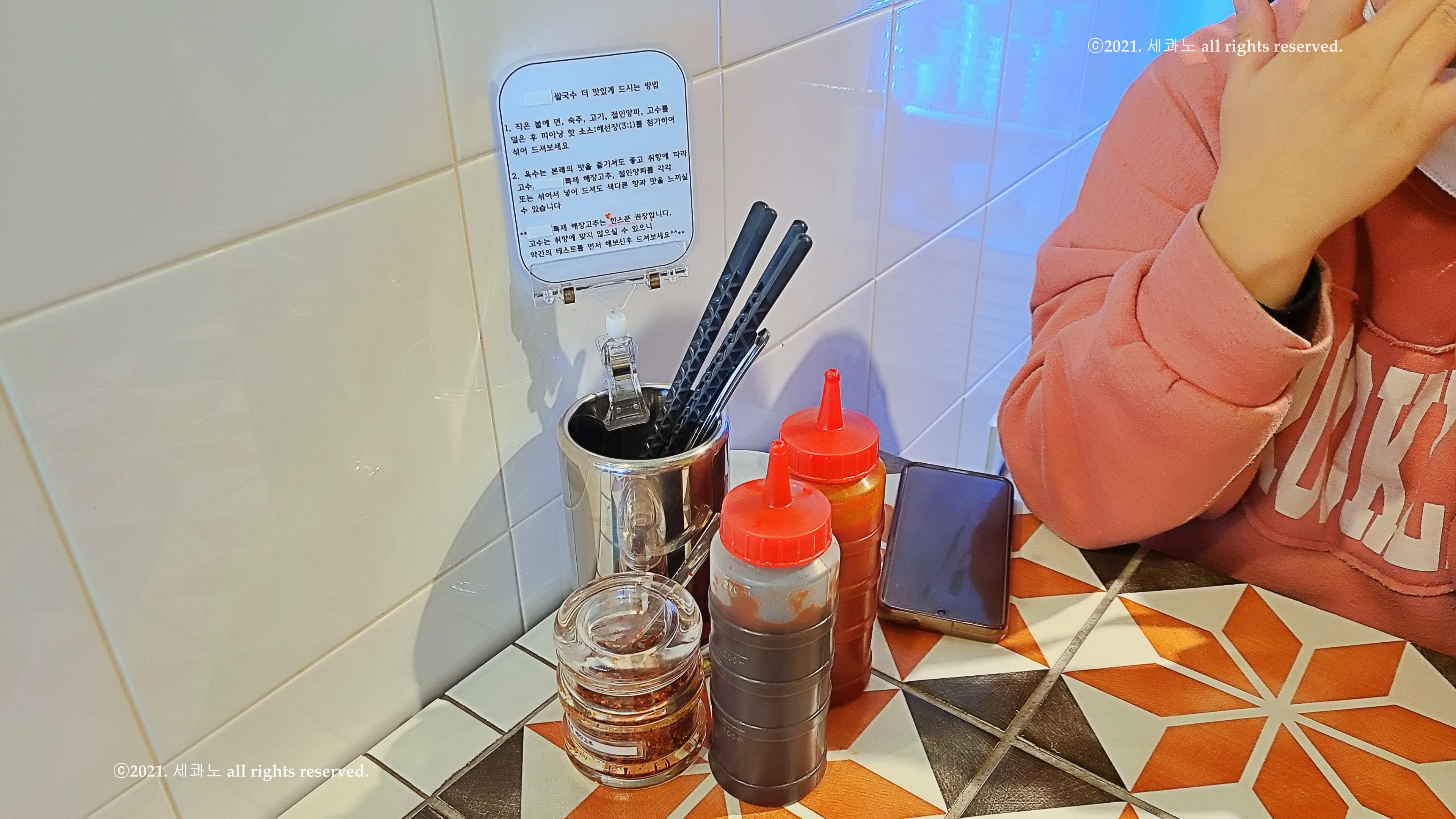 테이블에는 핫소스, 해선장, 특제 해장고추 식기류와 함께