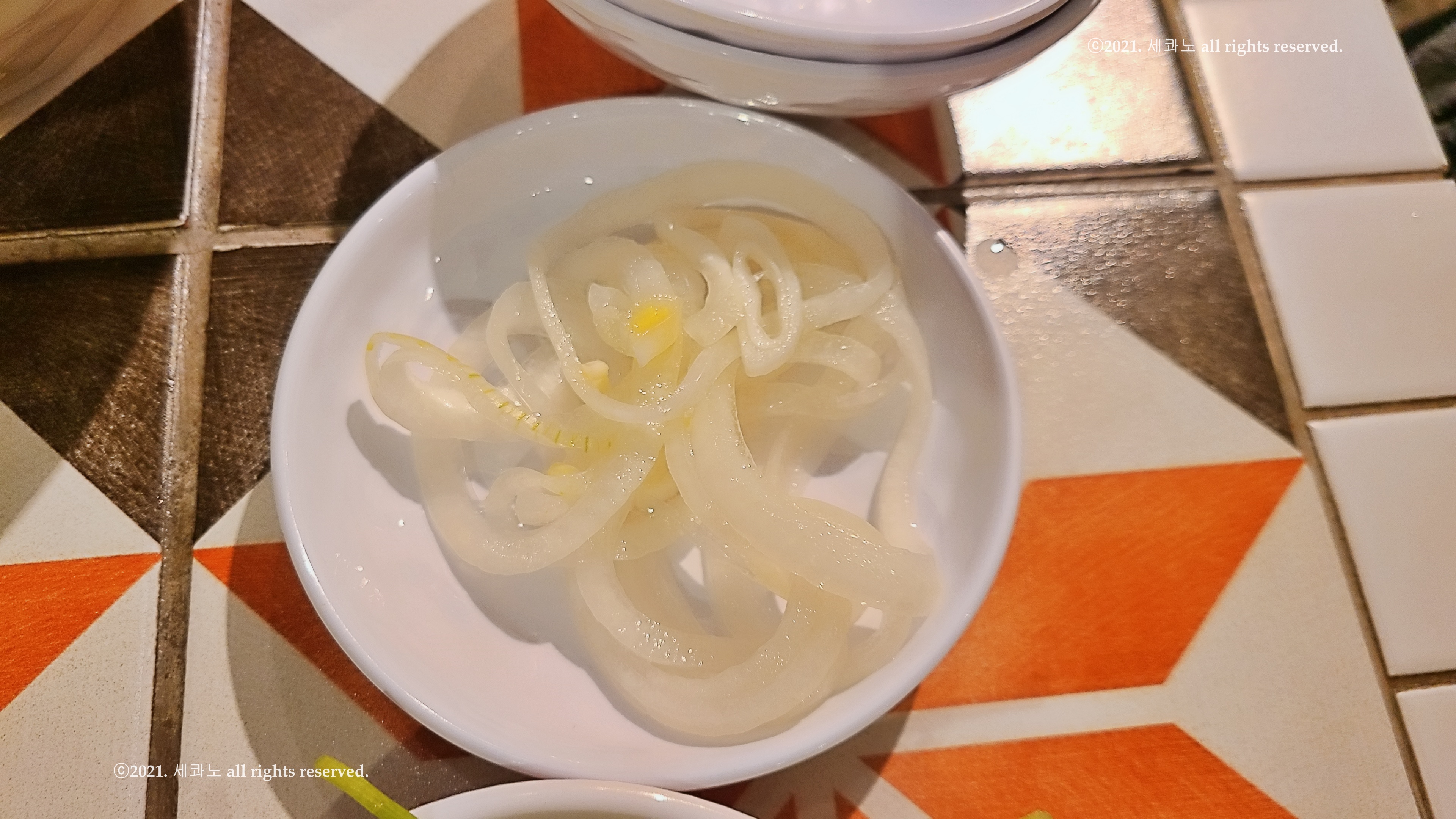 다른 것 없이 절임 양파에 핫소스(취향에 따라 해선장 추가)로